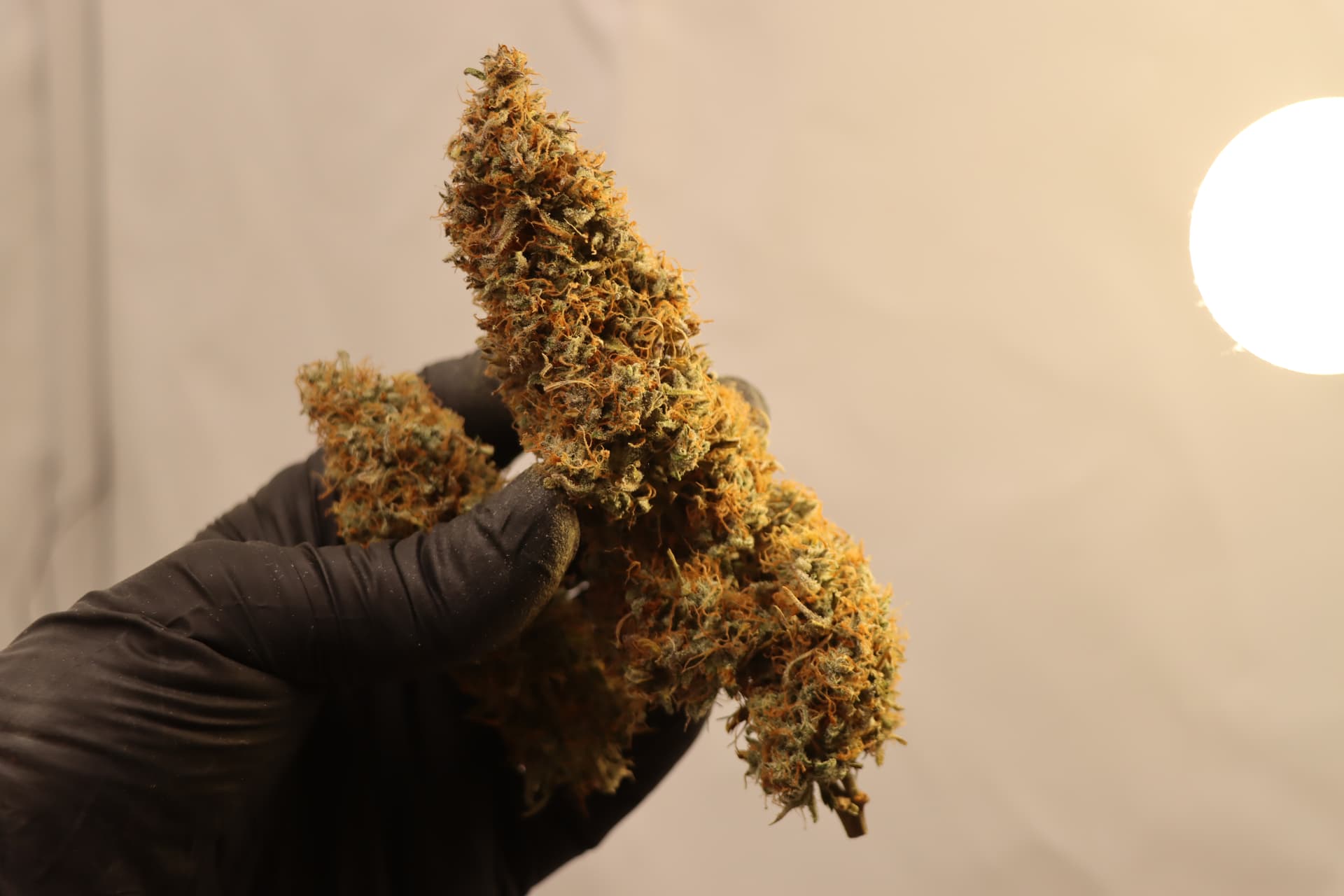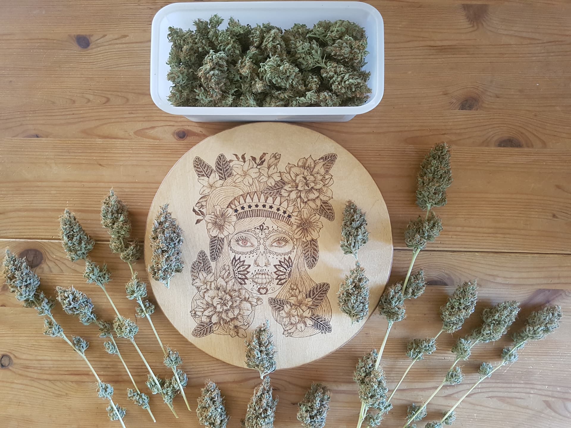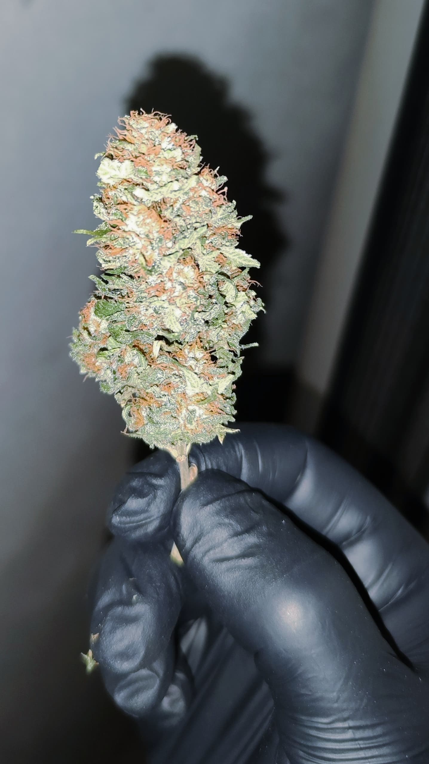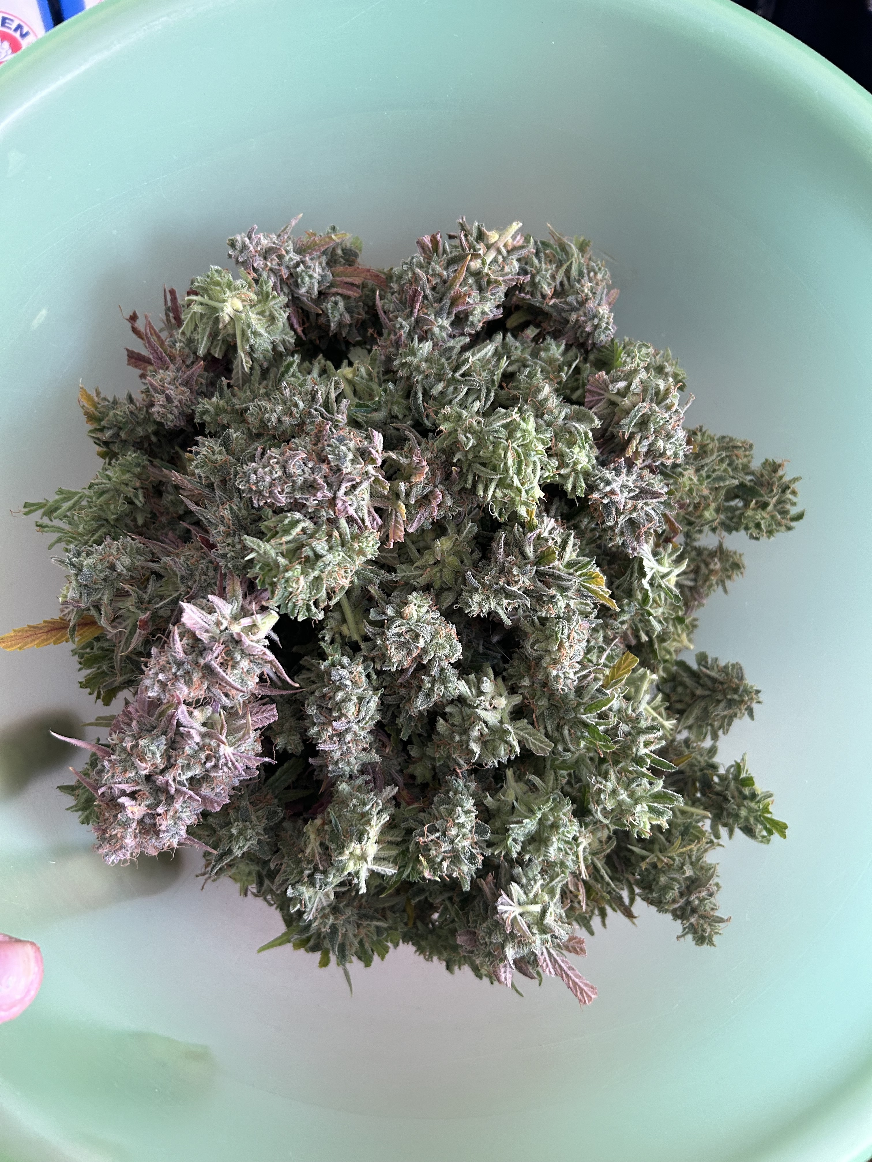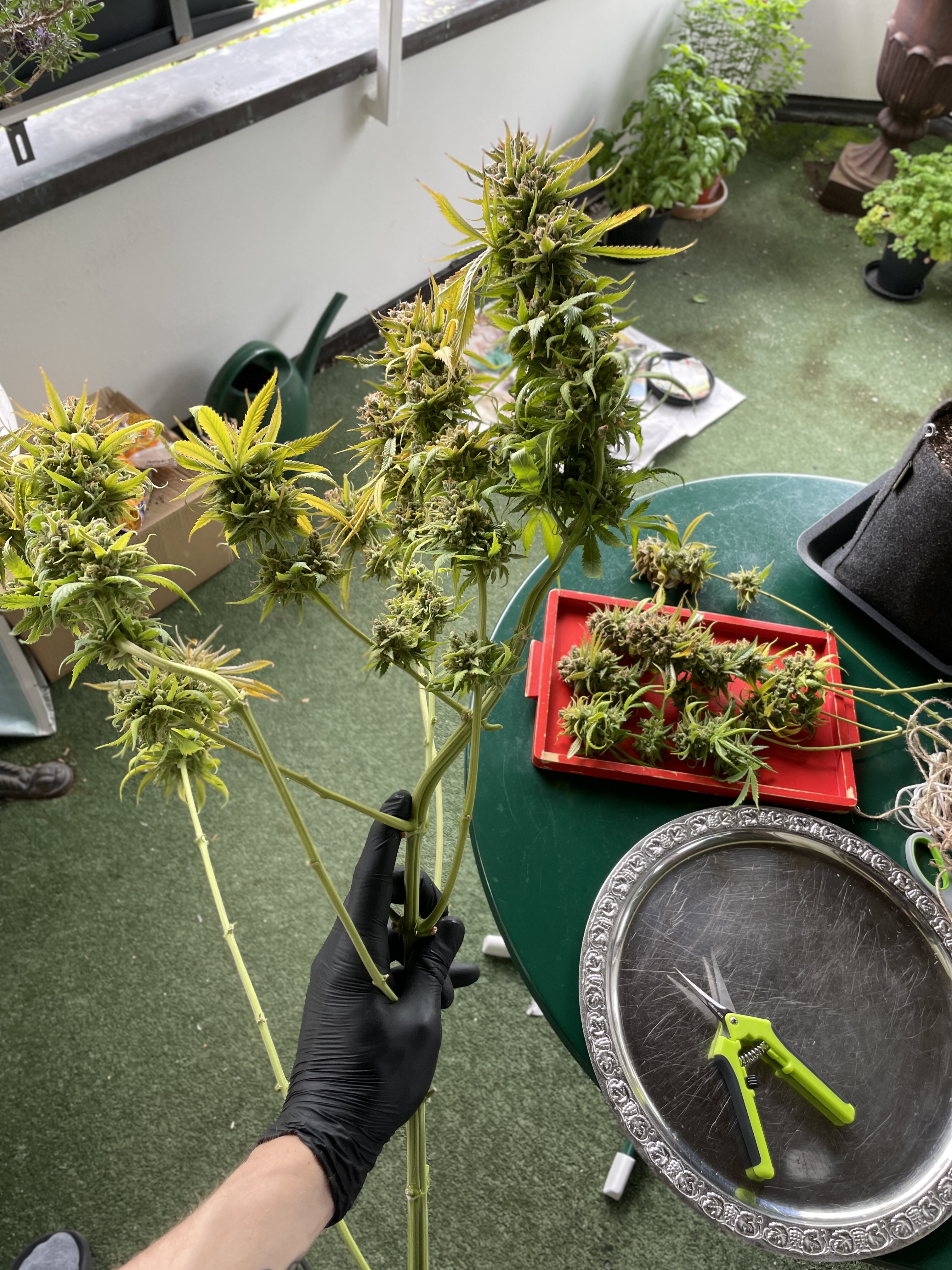 Die Ernte im KĂŒhlschrank mit Selbstauslöser von unten. Das ist Special Queen und eine mysteriöse Sorte die sich in der Packung verirrt hatte.