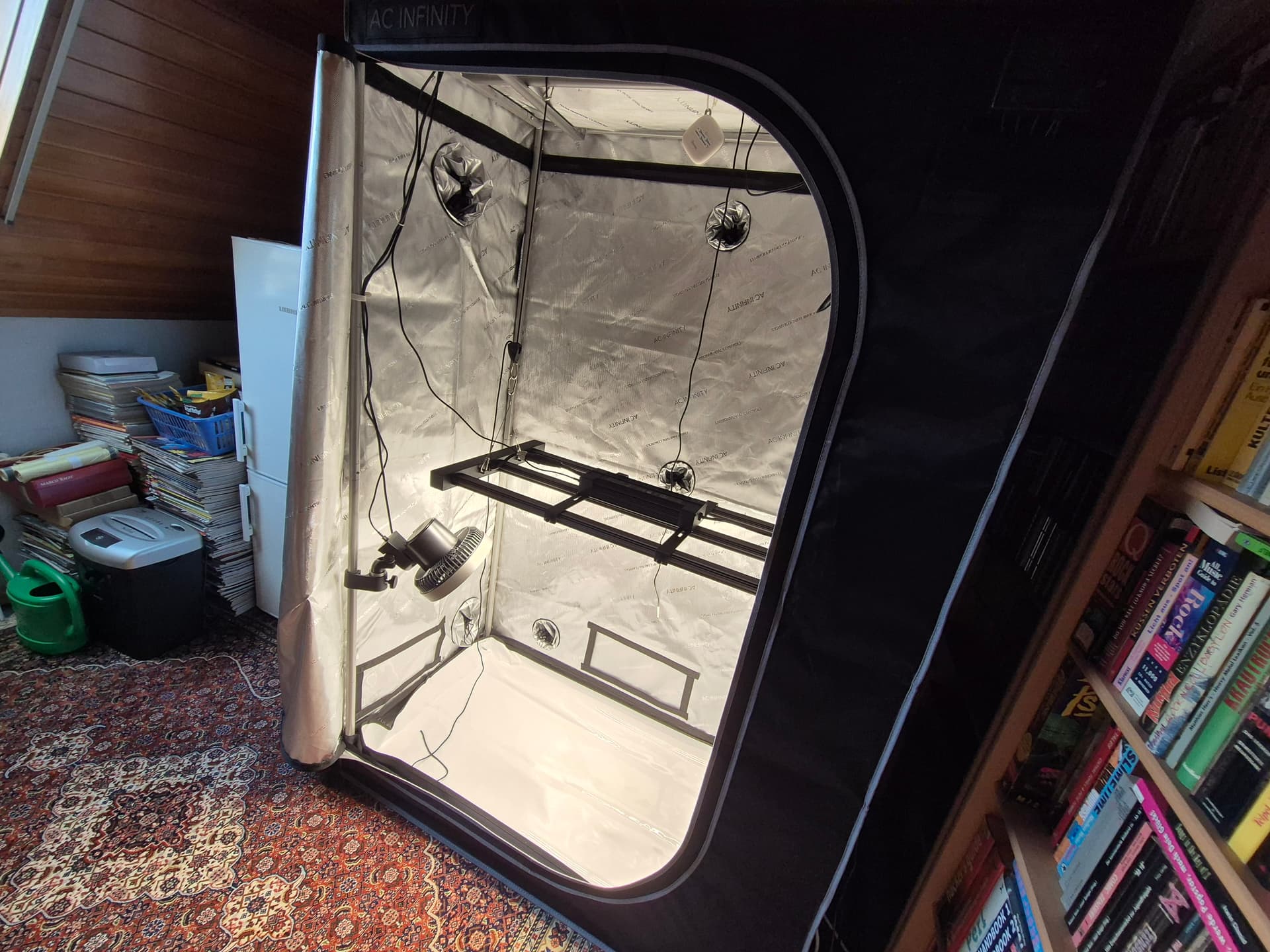 Kein Badezimmer-Absauger mit der Absaugleistung eines Asthmatikers mehr als Abluft, geil! Das alte Zelt war ein bißchen wackelig, aber ansonsten ok, die LED war etwas angejahrt, hat aber gut funktioniert und war stufenlos regelbar, ob’s die zuschaltbaren „Bloom“-LEDs wirklich braucht, weiß ich nicht, der AKF war halt ein AKF, der seinen Job tat, und den Ventilator hatte ich eh zugekauft. Aber überall, außer vielleicht beim Ventilator, war qualitativ für meinen Geschmack zu viel Luft nach oben.