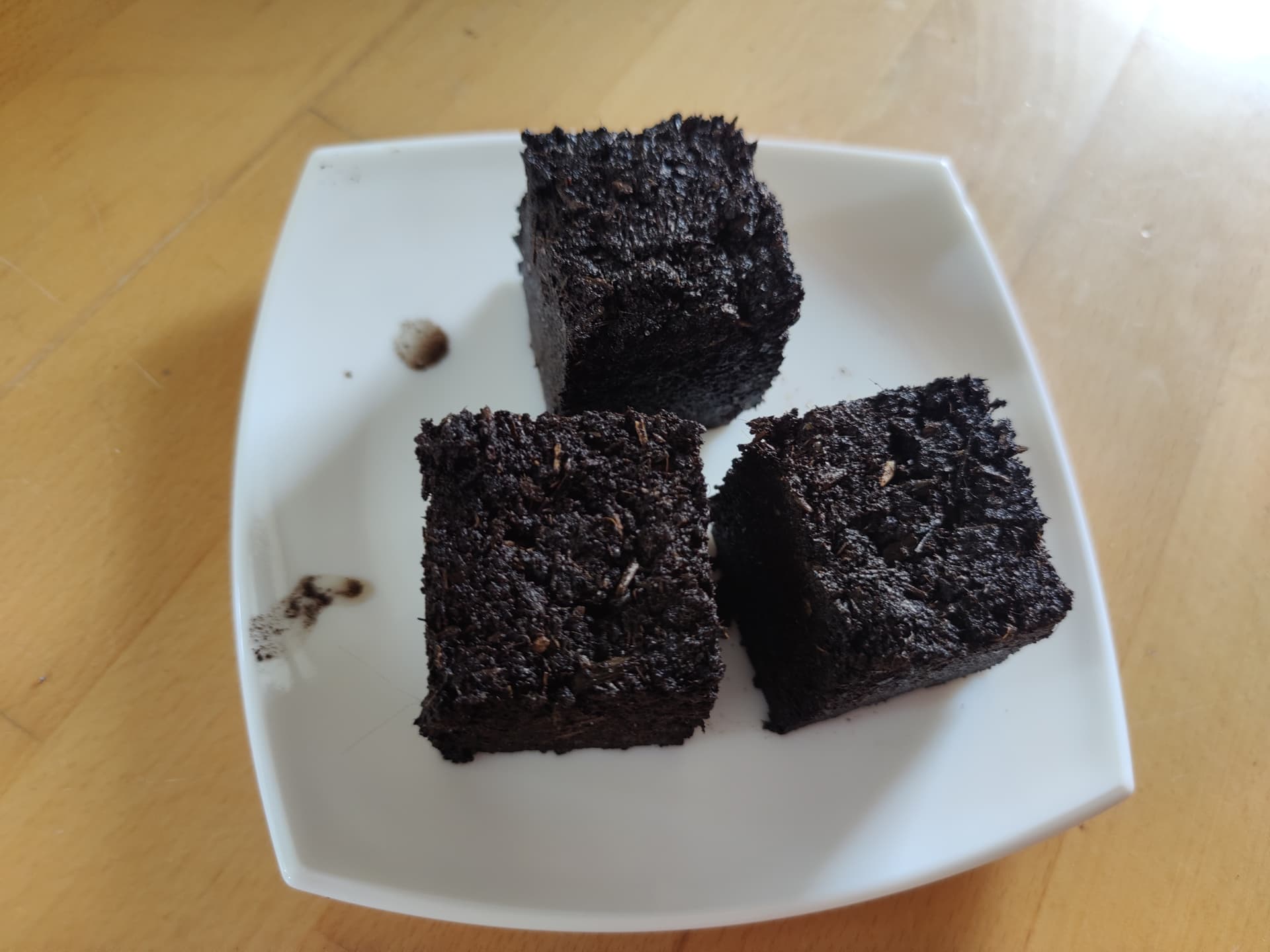 Nun die Erde ganz dolle wässern, damit die richtig schön Kinderspielplatz-Lieblings-Matsch-Konsistenz hat. Und rein damit in die Blockpresse, richtig schön reinquetschen (wenns keine richtige Sauerei ist, ist die Erde zu trocken!) und dann rausschieben. Dann entstehen diese feinen gepressten Blöcke, die zusammenhalten aber trotzdem durchlässig genug für Wurzeln sind. Wie Kokos-Quellpads, nur in geil