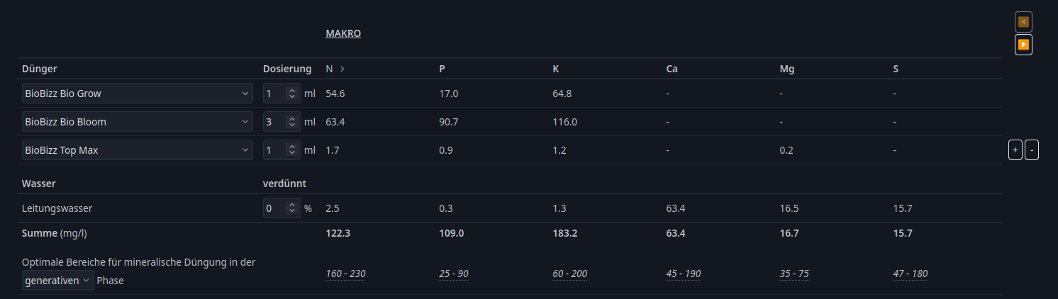 Schlimm ist es bisher nicht. Bis auf Calcium (Alice & Amalie - 2&3) zeigt sie Stickstoffmangel. Was mich allerdings überhaupt nicht wundert. Schauen wir mal in den Düngerechner des guten @bergrow: