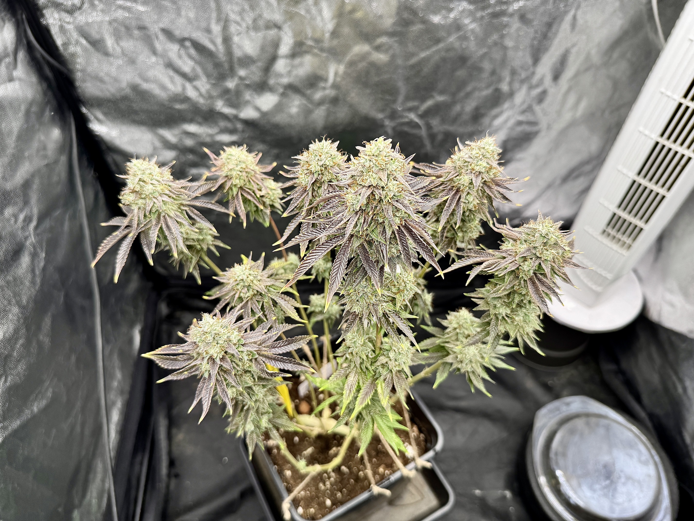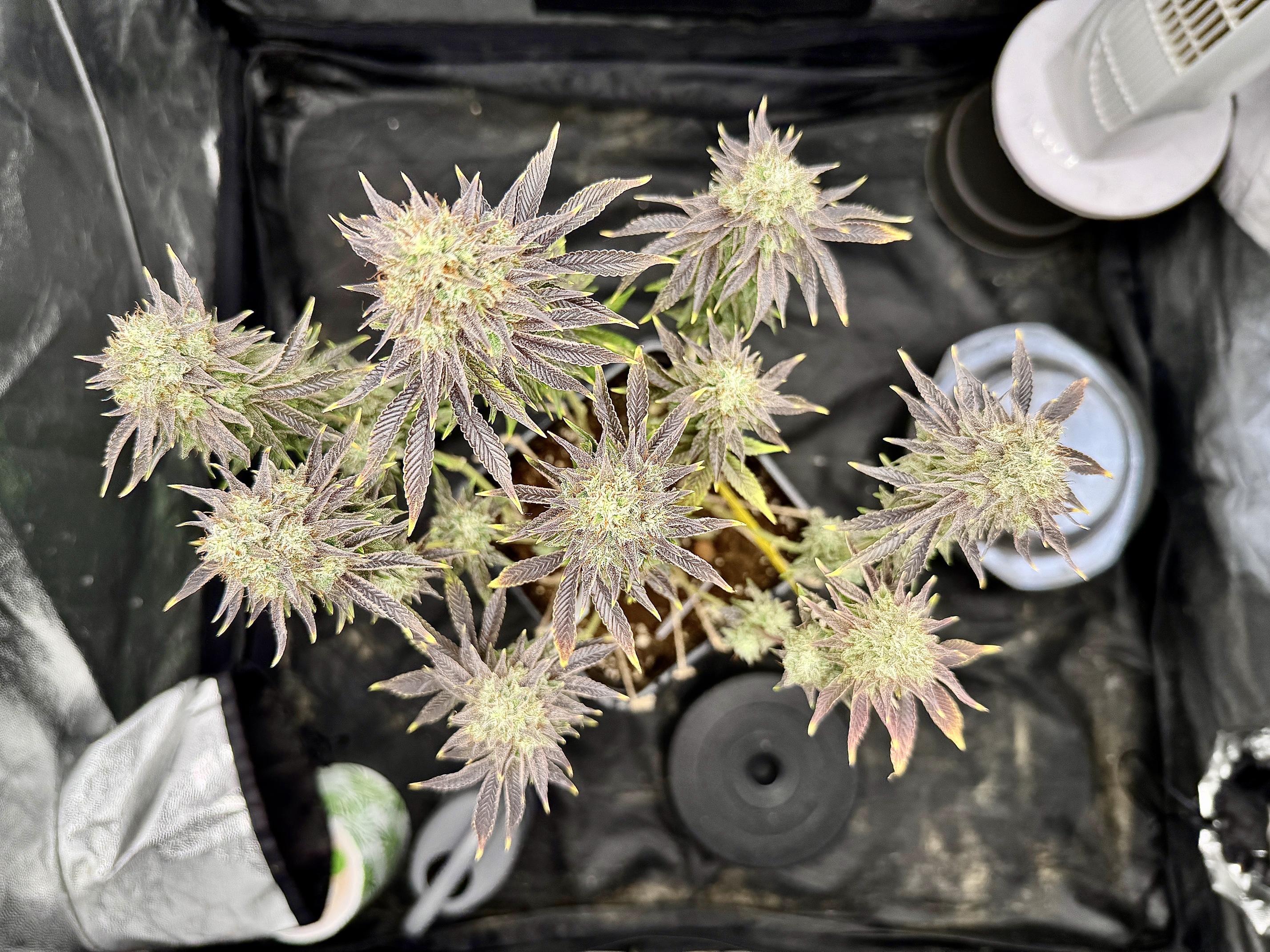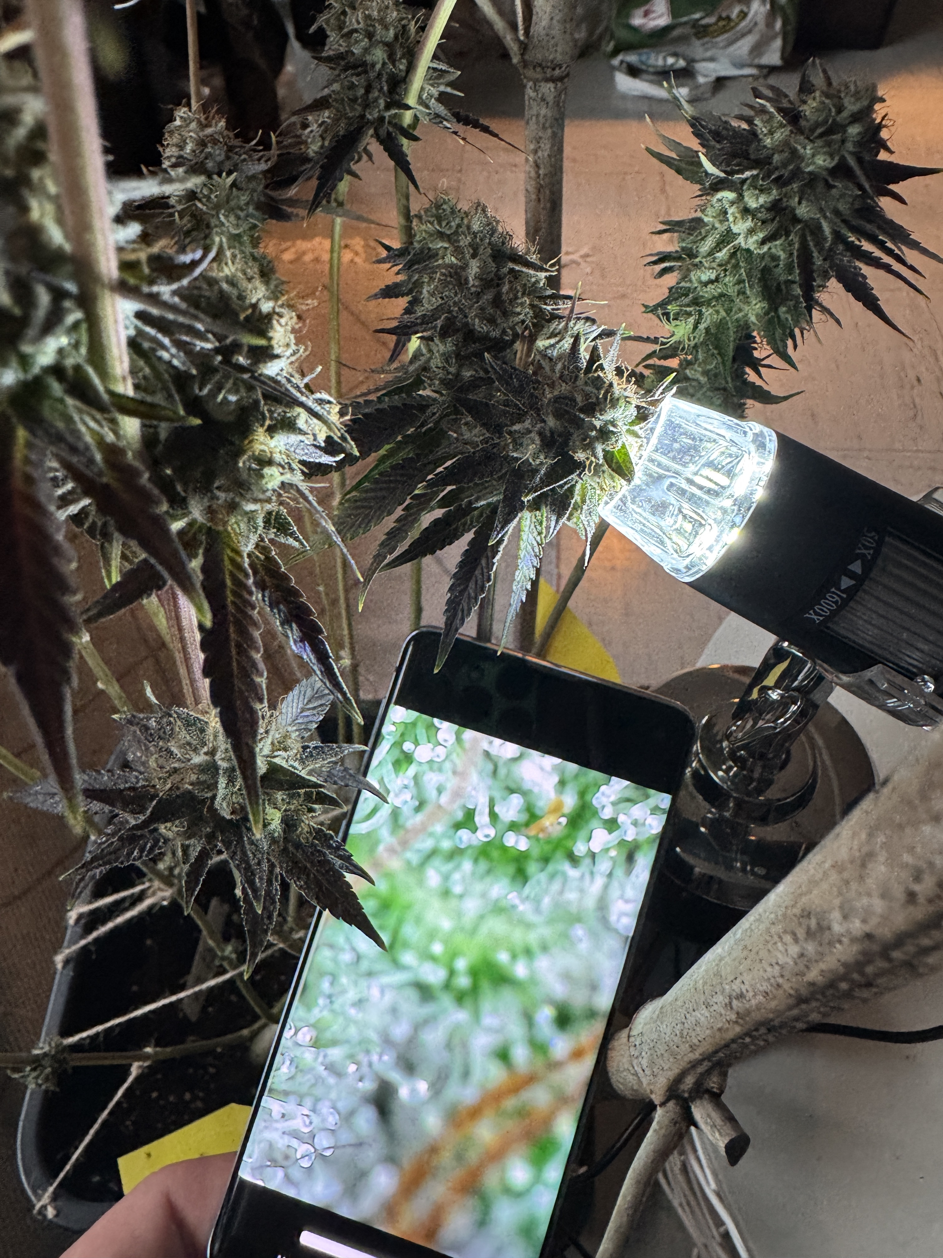 Die beiden Kush bleiben noch etwas stehen. Hier sind die Trichome alle gleichmĂ€Ăig stark getrĂŒbt, aber noch keine bernsteinfarbenden. Es gab noch mal 0.7l LW pro Plant.