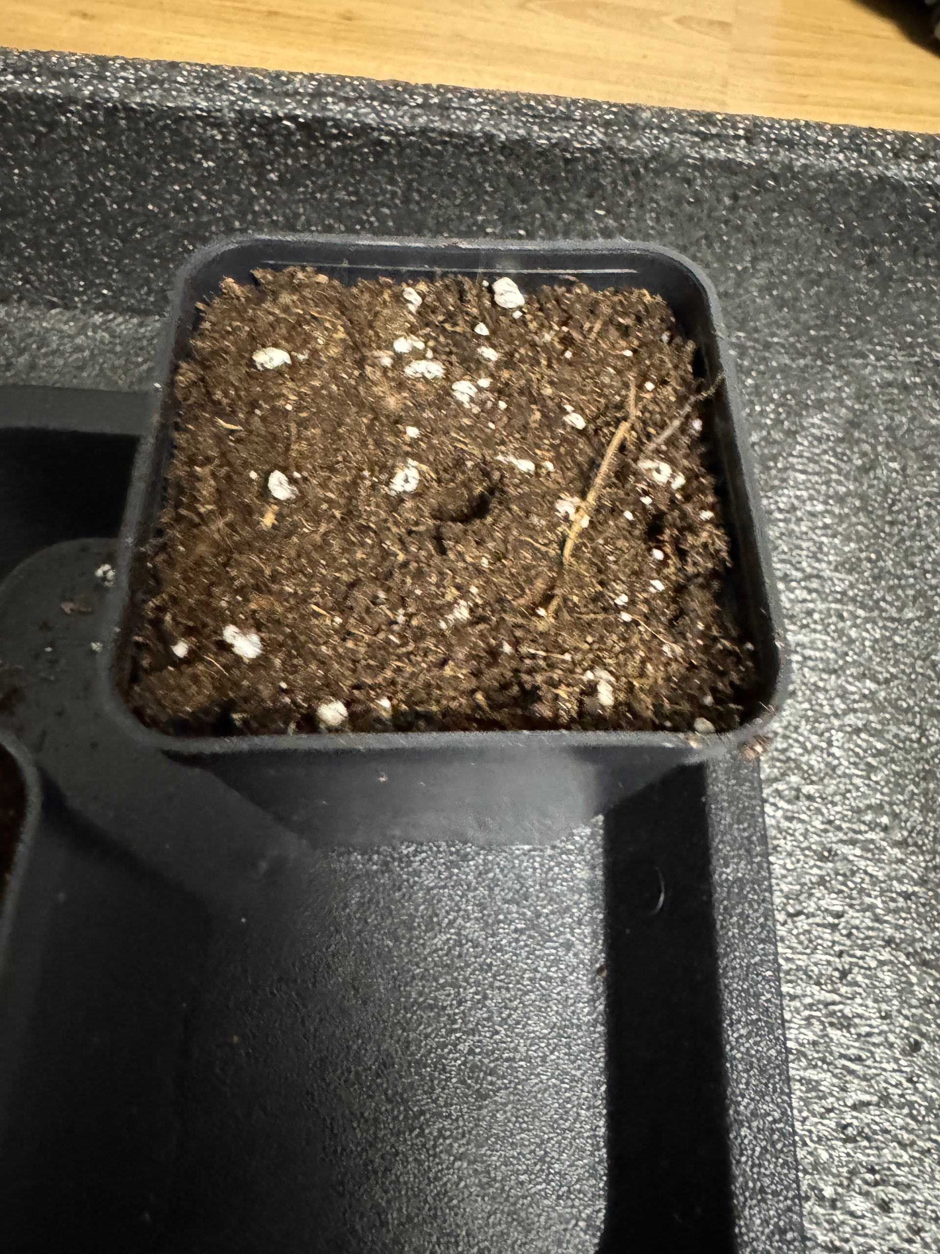 Die Oberfläche ist in einem Topf schon gut ausgetrocknet. Ab jetzt wird 1-2 mal (je nach Bedarf) am Tag die Oberfläche nachgefeuchtet. In meiner Sprühflasche sind außerdem 2ml Root-Juice auf 500ml Wasser verteilt (Empfehlung von BioBizz sind 4ml pro Liter, also passts).