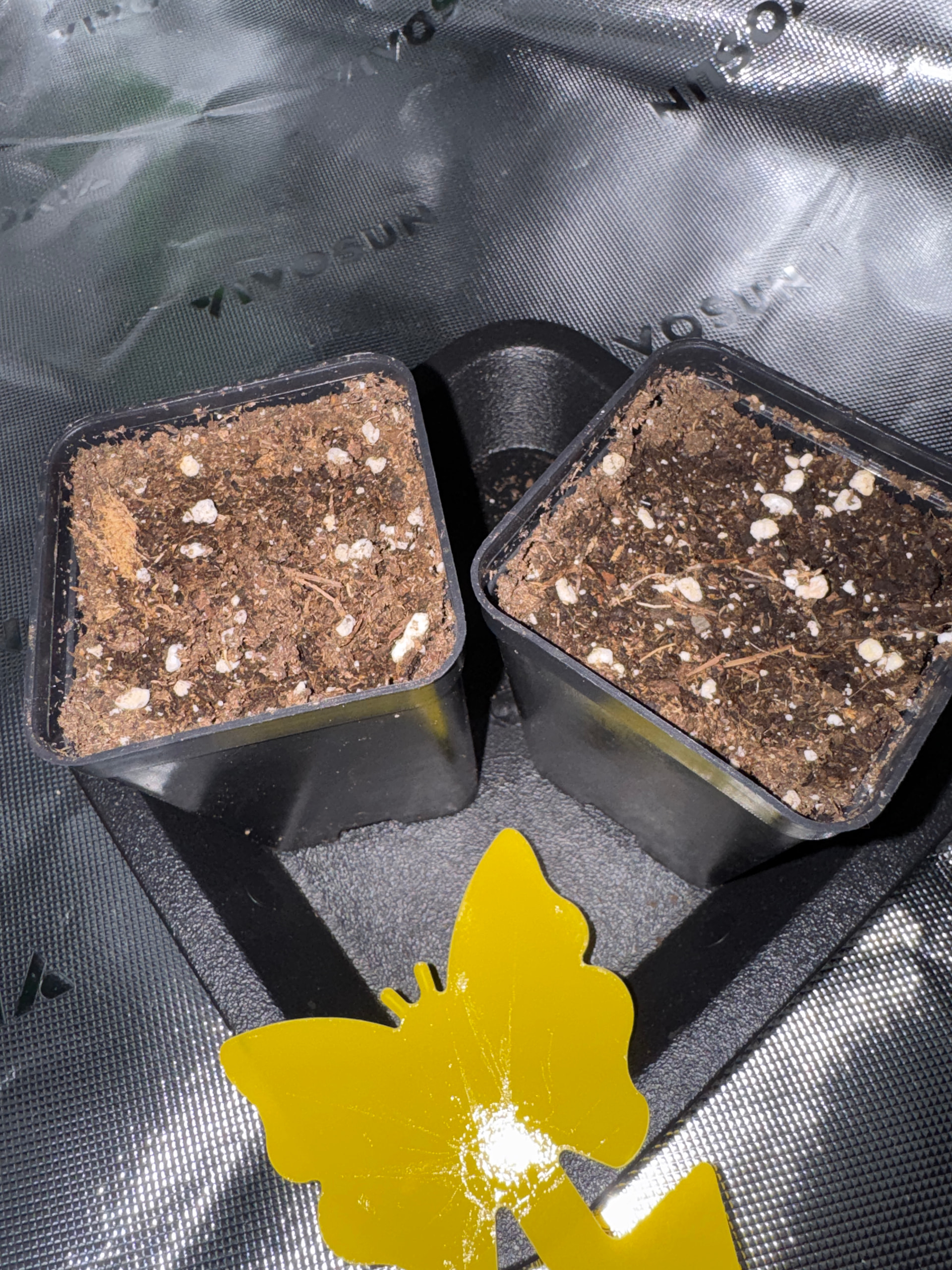 Man schaue in die Mitte und man weiß, dass die Beleuchtungszeit heute wohl umgestellt werden muss auf 18 Stunden. Im zweiten Topf ist nachwievor nur Erde zu sehen.