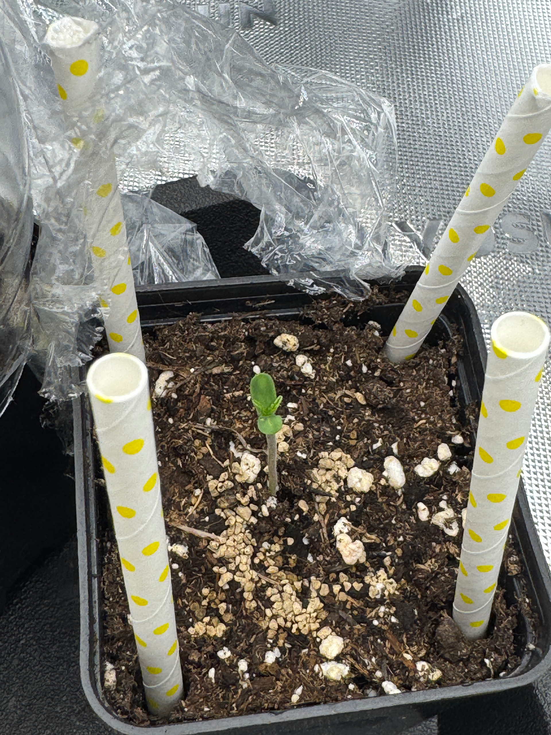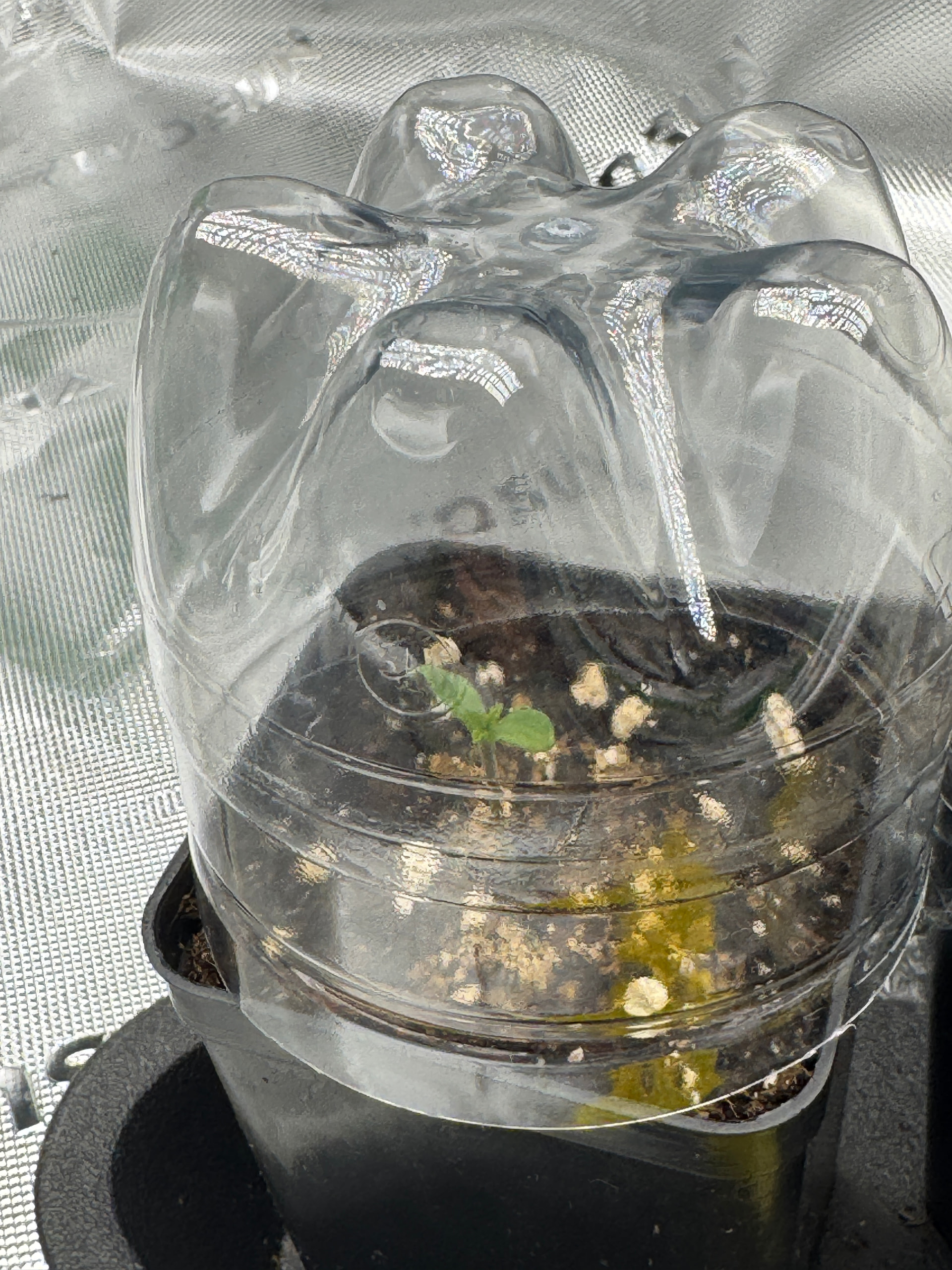 Ich habe in den beiden Gewächshausern vorhin die RLF mit der Sonde von Vivosun gemessen. Unter dem Flaschenboden waren es 76-79%, unter der Folie waren es nur 61-63%. Fairerweise muss man sagen, das die Erde an der Oberfläche unter dem Flaschenboden deutlich feuchter war als unter der Folie. Vorsichtshalber habe ich trotzdem eine zweite Flasche aufgeschnitten, den Boden mit der Sprühflasche befeuchtet und nun beide Pflanzen unter einem Flaschenboden.