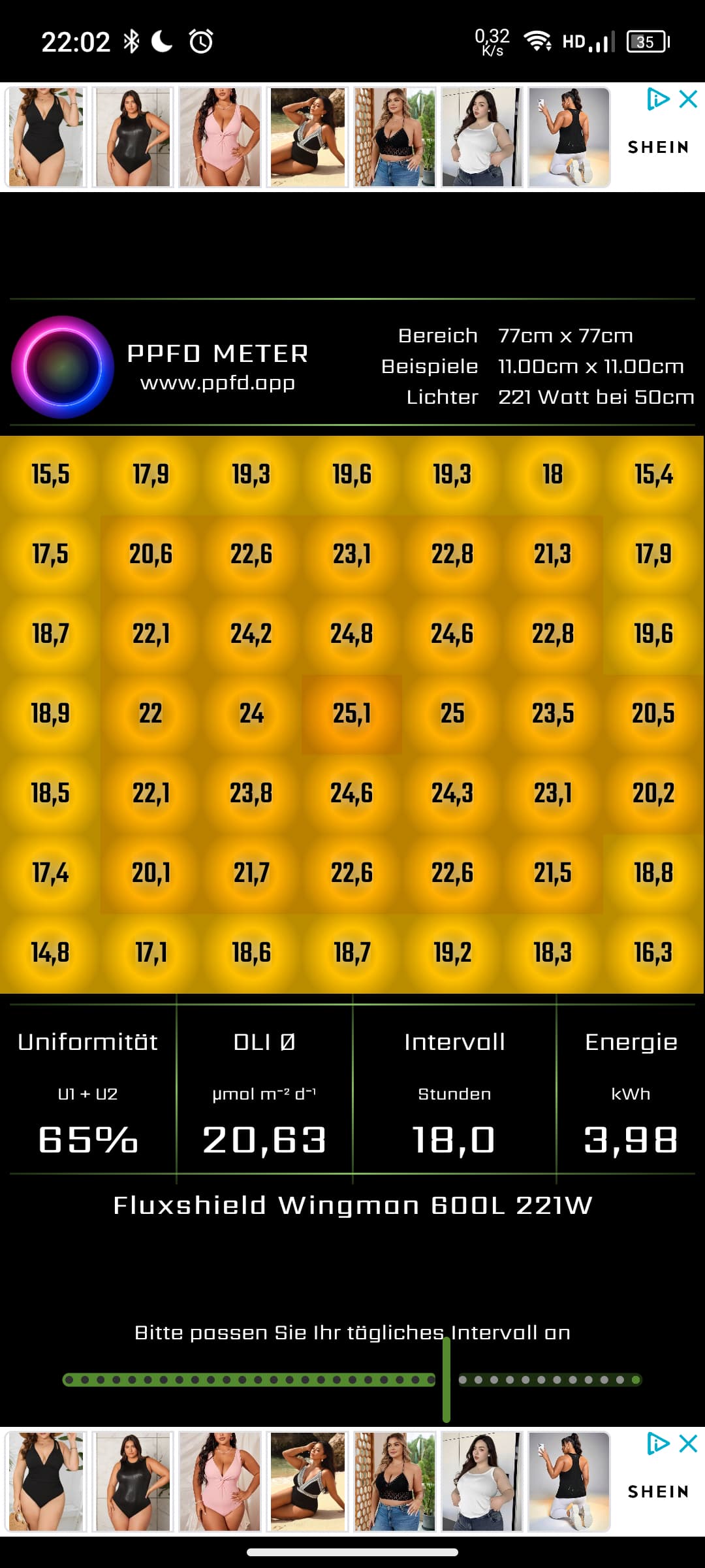 Hat so in etwa geklappt… zwischen 1000 und 1050 ppfd bei 100%. Hab jetzt bei meinen pflänzen zwischen 300 und 320 ppfd eingestellt. Siehe bild. Etwa 44 cm Abstand.