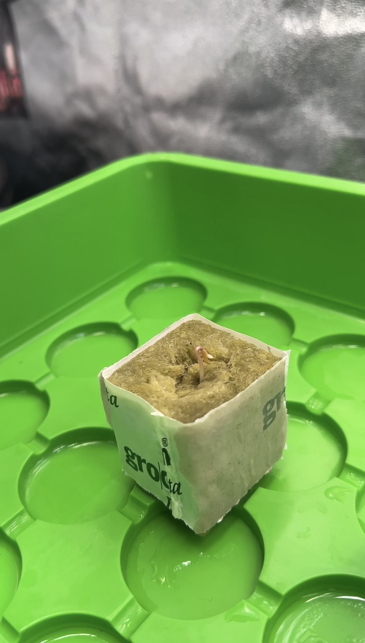 Plugs (5×5 cm) 1 h in pH 5,8 Wasser eingelegt → dann Seeds rein → Mini-Gewächshaus → dunkler Schrank (~20 °C, 80 % RLF).