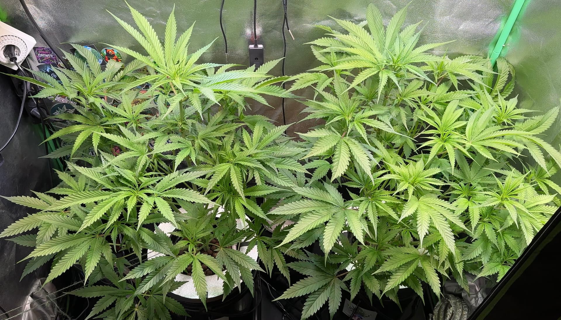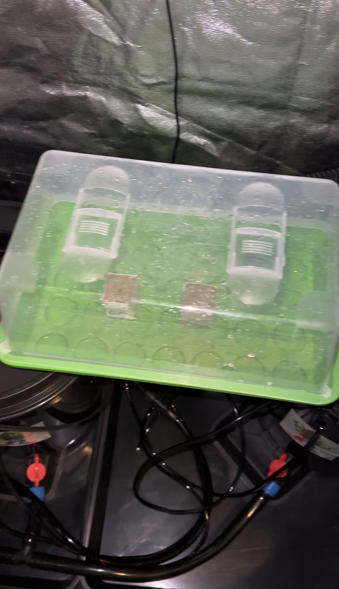 Beide Seeds sind am 12.06. geschlüpft (sieht auch wirklich aus wie ein „White Flamingo“ → Mini-GH ins Zelt gestellt, Lampe auf 10 % (~107 µmol), 18/6 Zyklus (9:30–3:30).