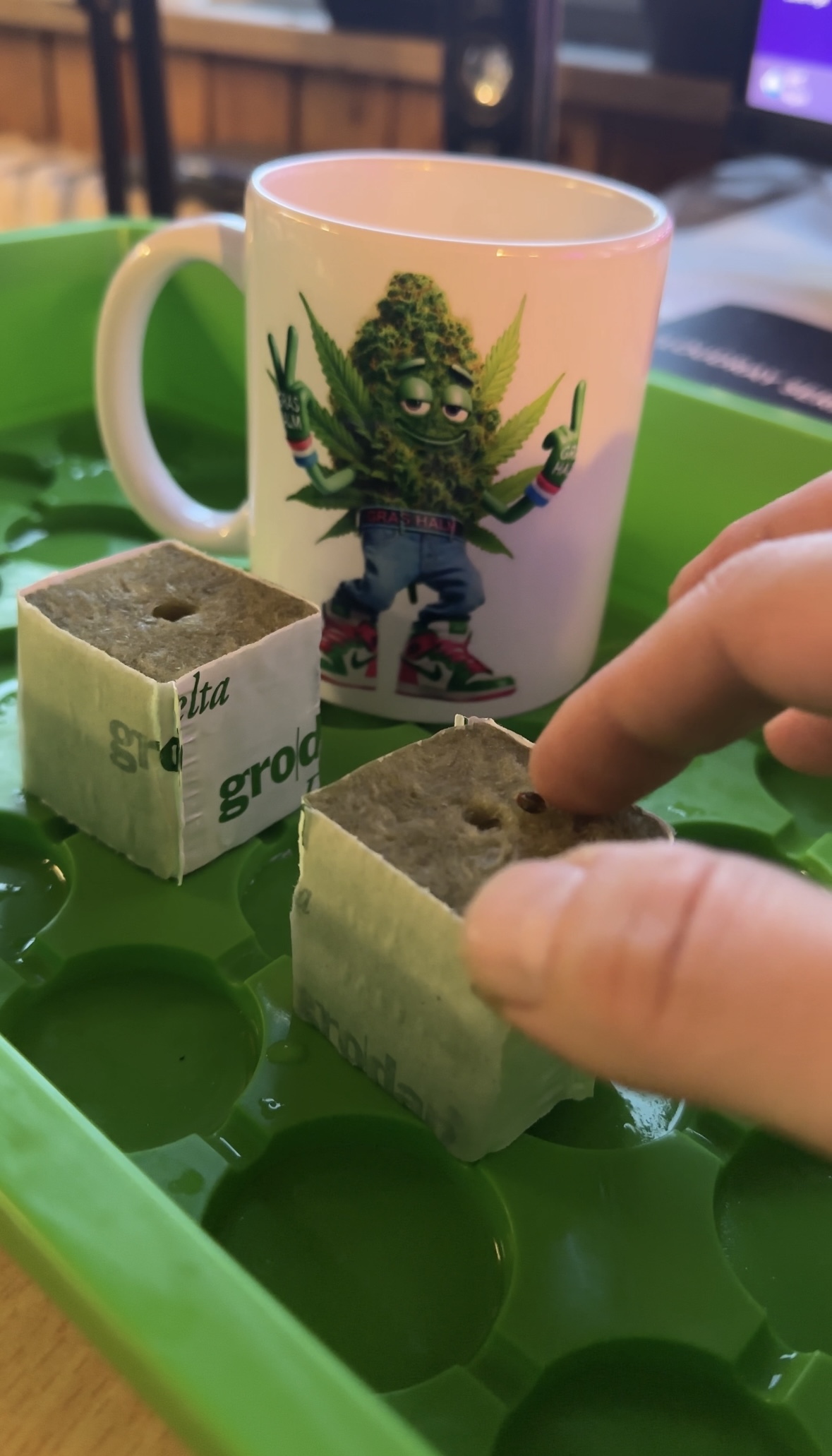 2 Seeds in ein Glas mit Wasser gelegt – wie immer in meiner „Growbro Grashalm“-Tasse → 100 % Keimrate!