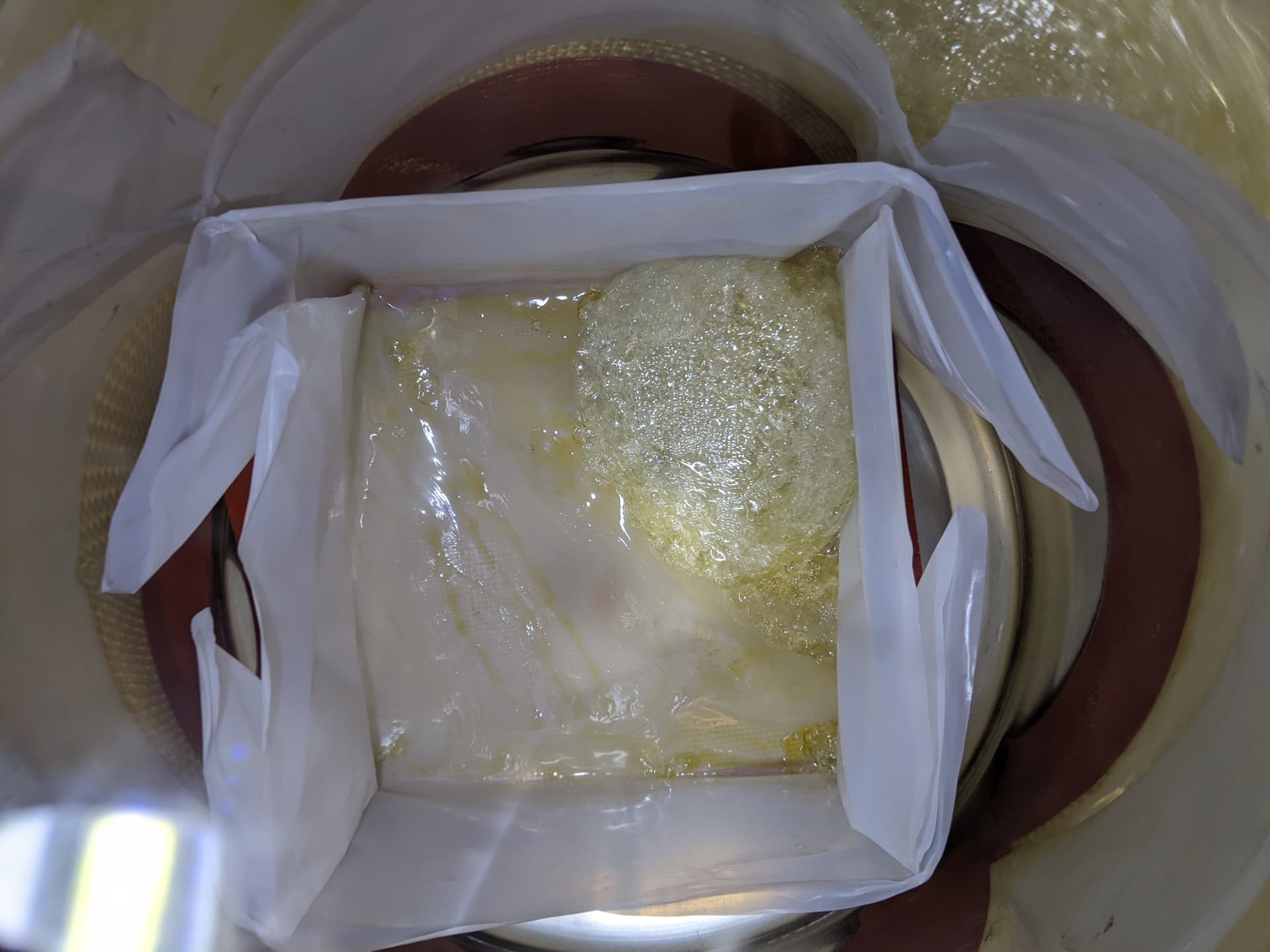 nachdem Augenscheinlich das gas verdampft ist, kommt die folie mit dem slab in einen vakuumtopf und auf eine Hitzeplatte gestellt, bei unter 40°.