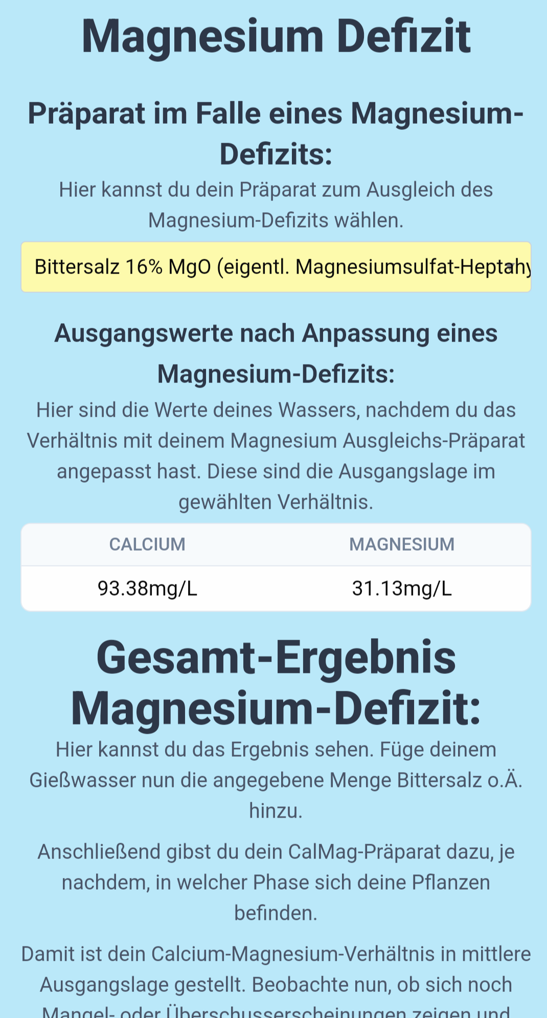 Und der Rechner Sagte das ich 2,31g Bittersalz hinzugeben soll um das Defizit auszugleichen und bis jetzt wirkt es ware Wunder.