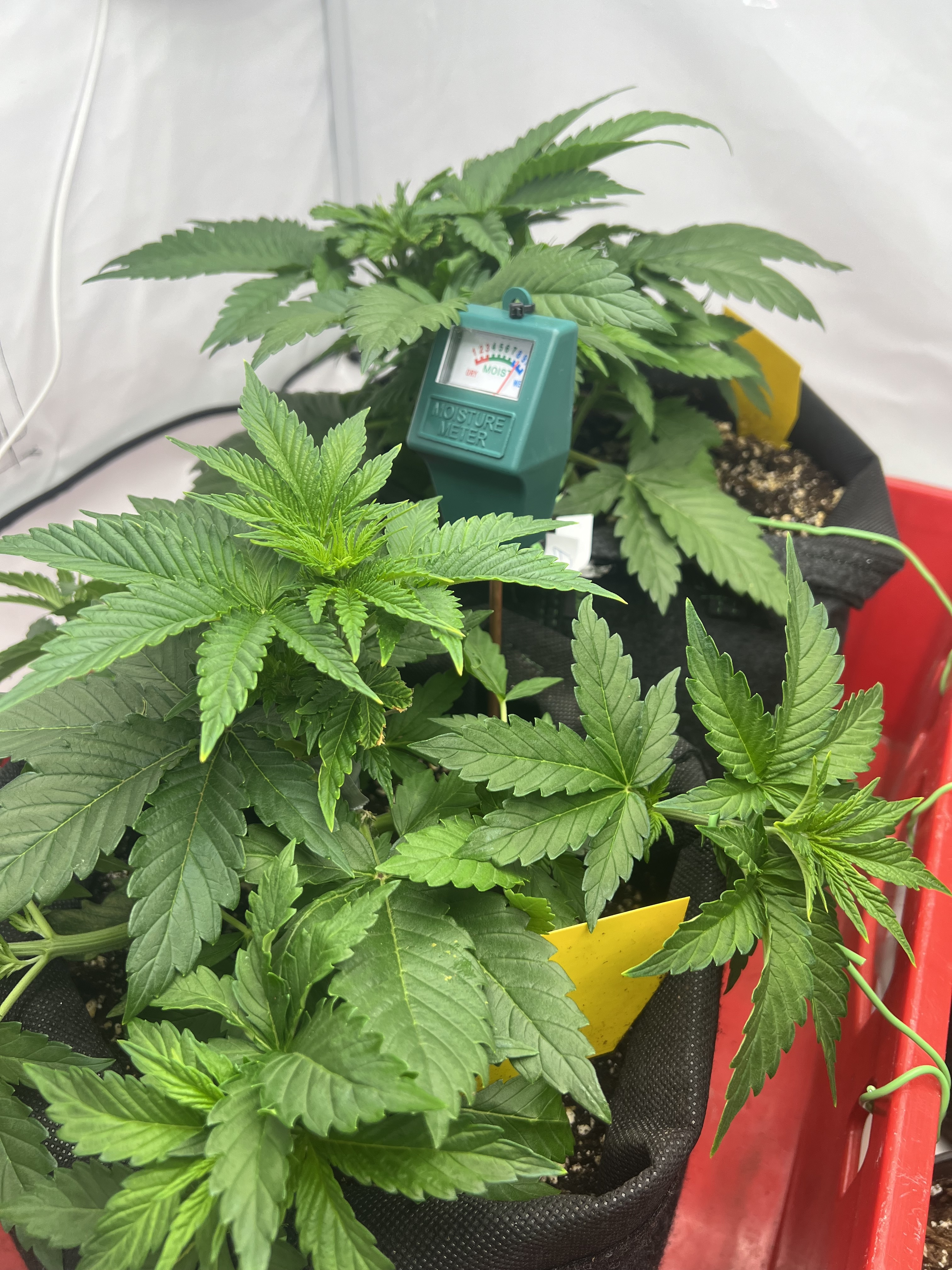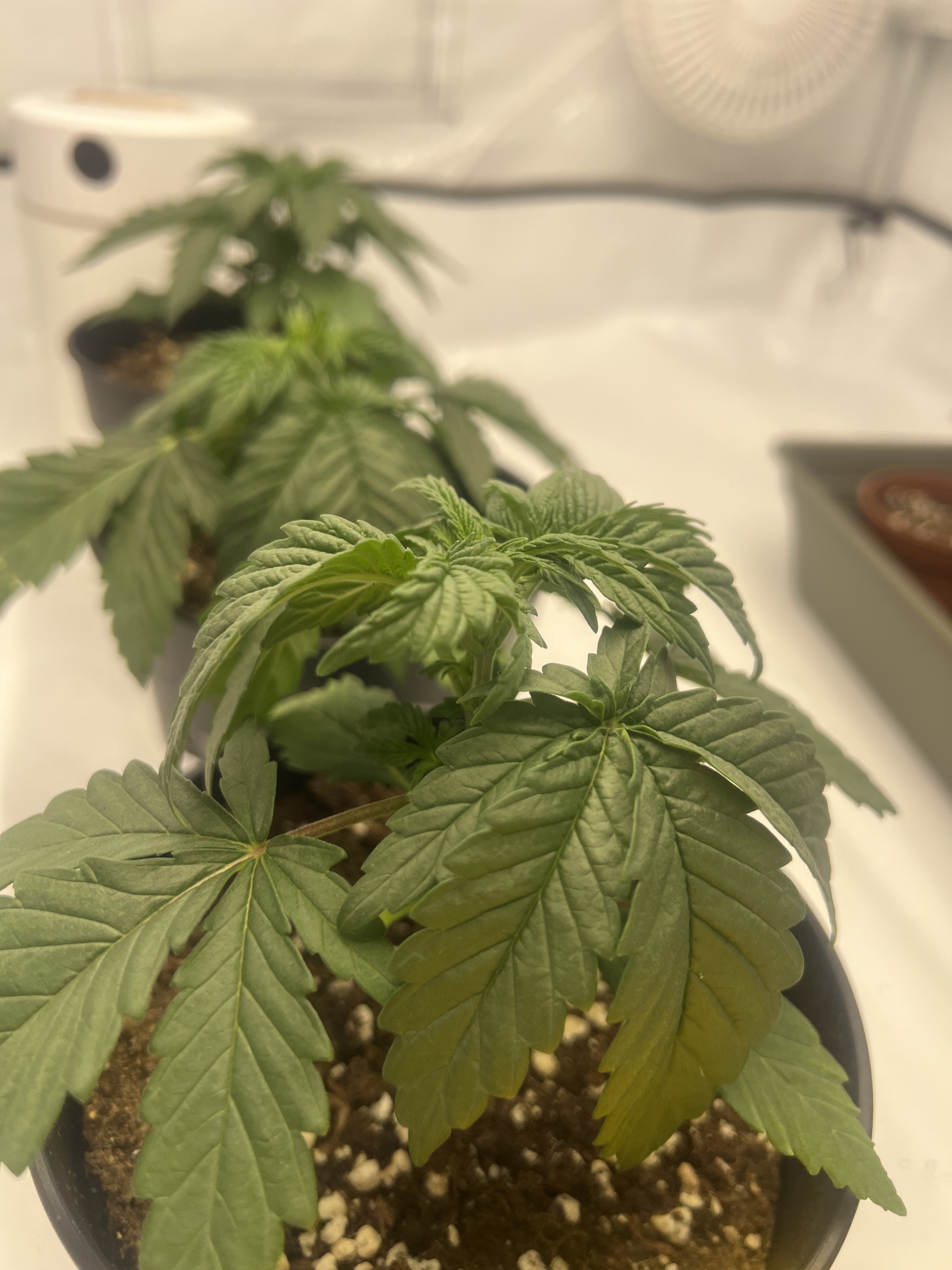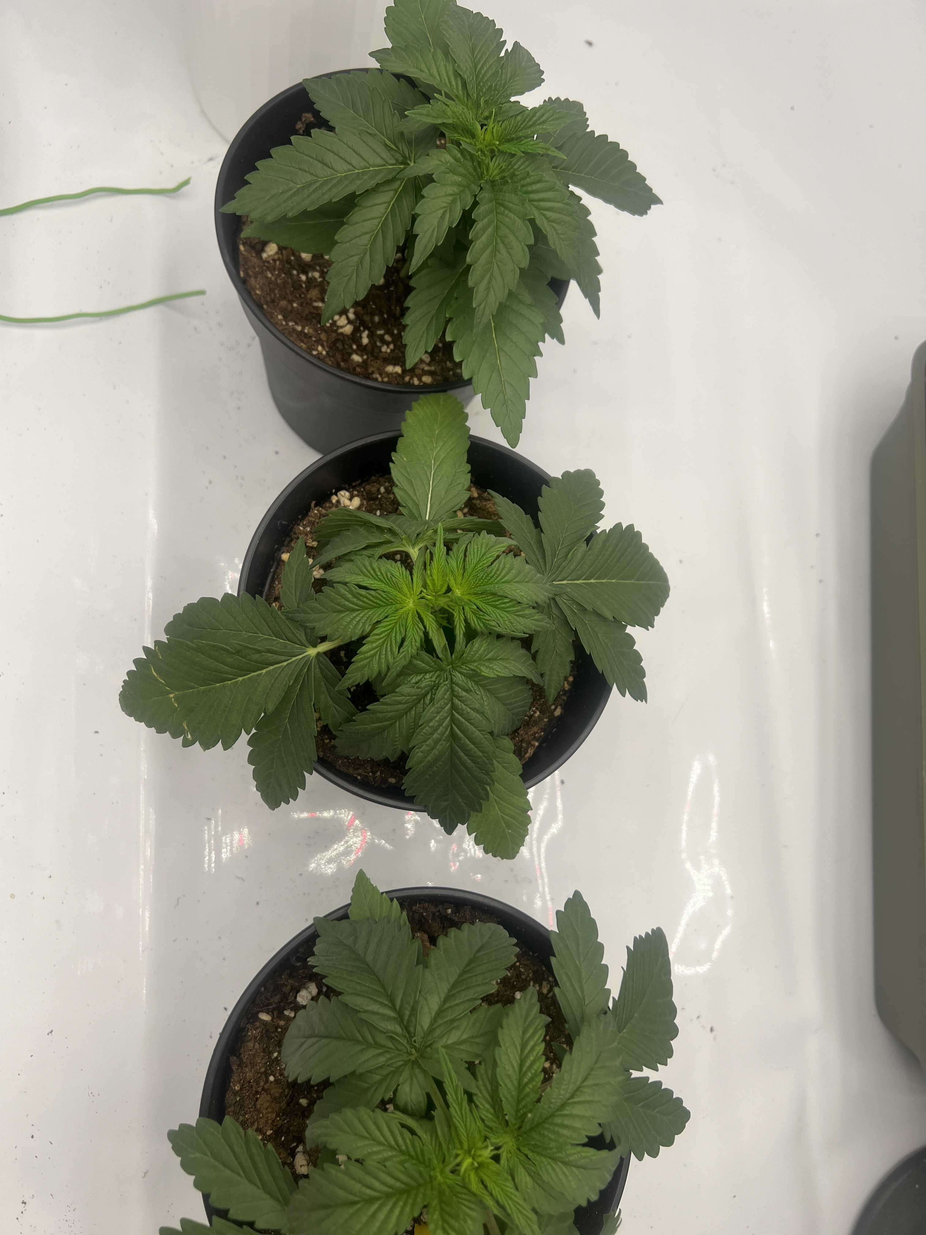1 Pflanze finde ich, sieht noch gut aus die mittlere und die rechte haben aber hängende Blätter. Ich denke es liegt an wenig Wasser. Ich gieße ca. jede 2-3 Tage um die 200ml. Erde ist BioBizz Lightmix.