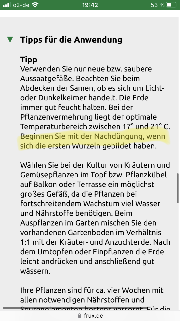 - Mir wurde beim Starter Set Mineralischer Dünger angedreht, den habe ich bislang aber nicht verwendet (Meines Wissens hat Anzucht Erde genug)