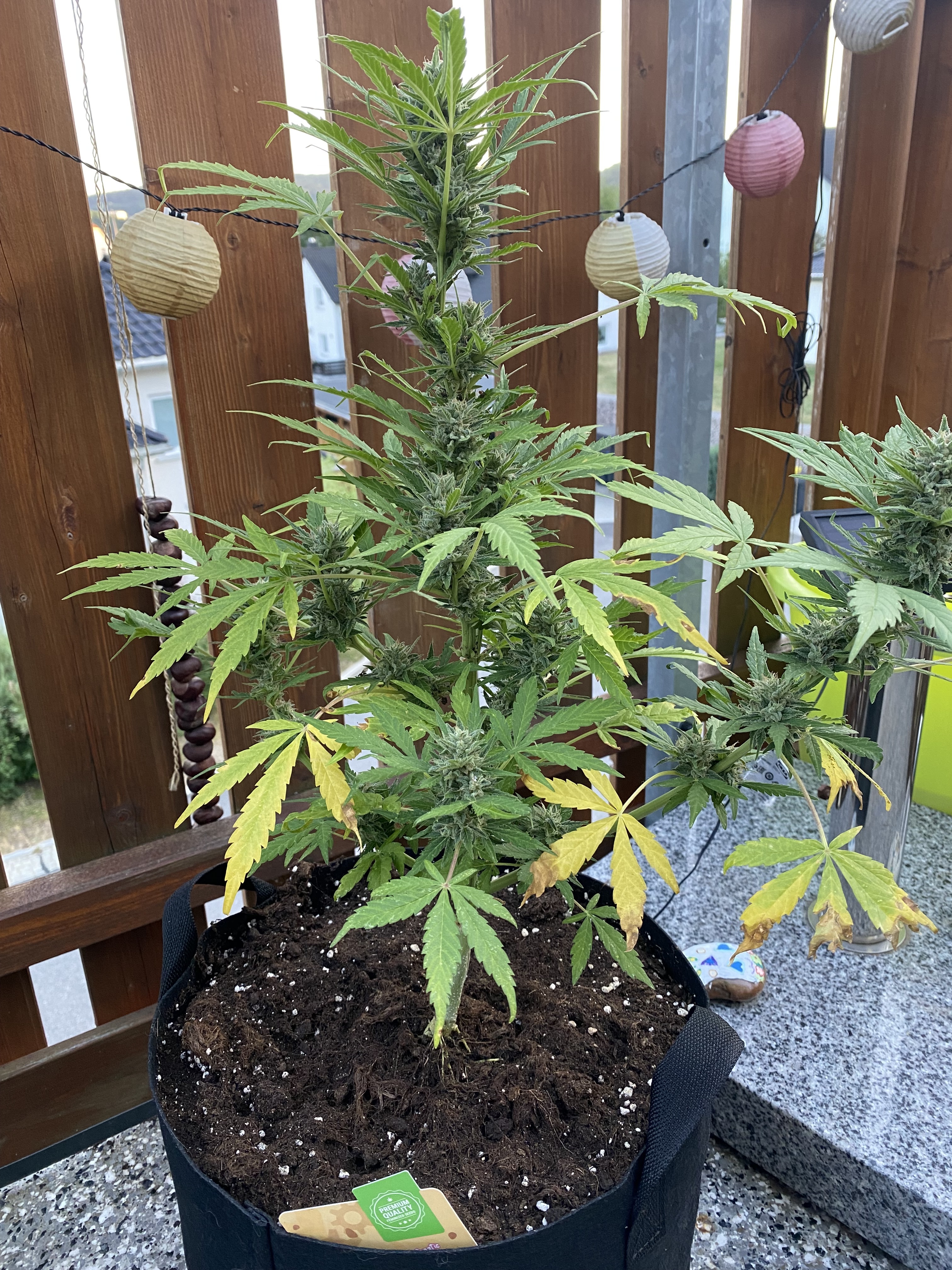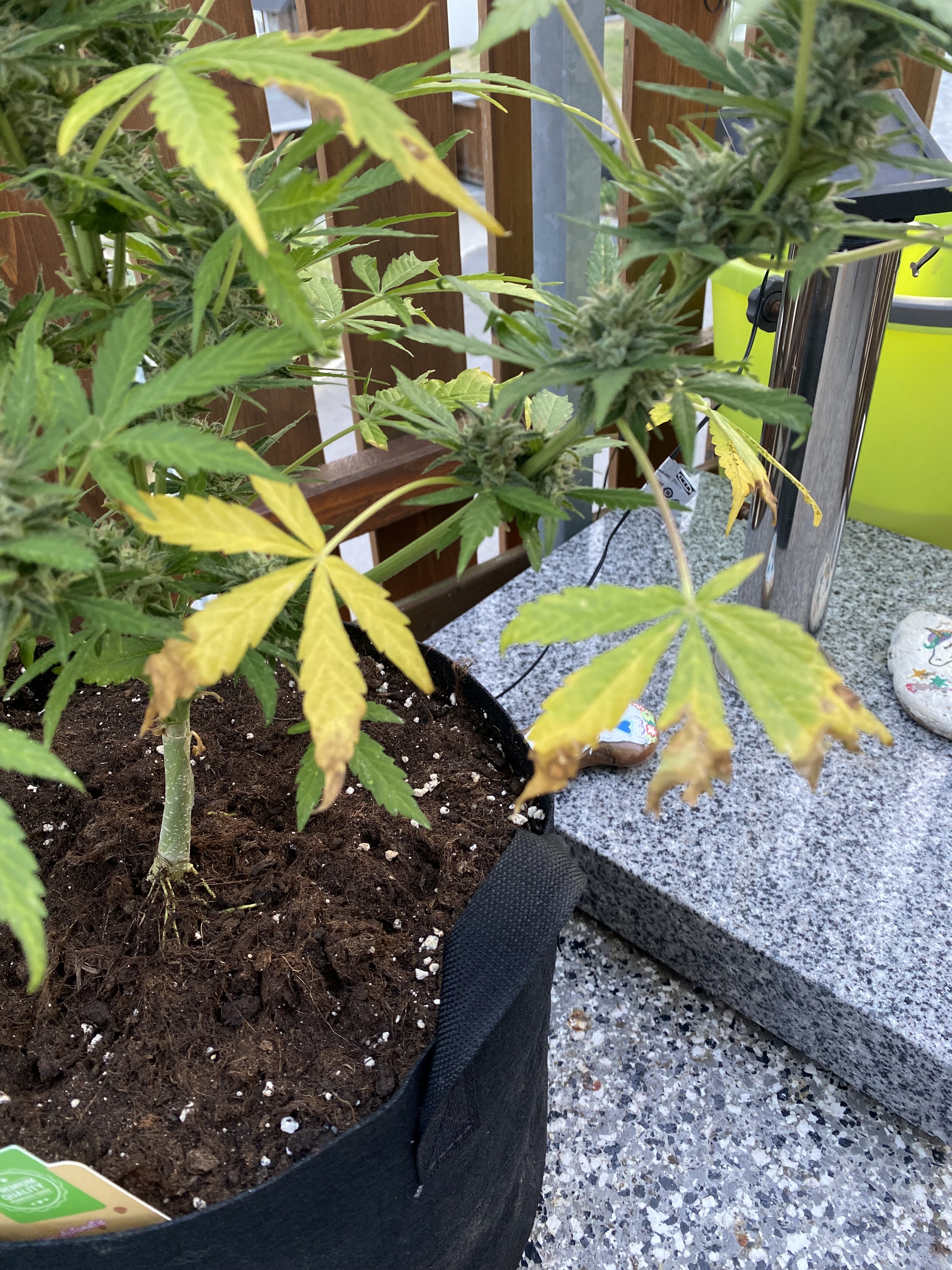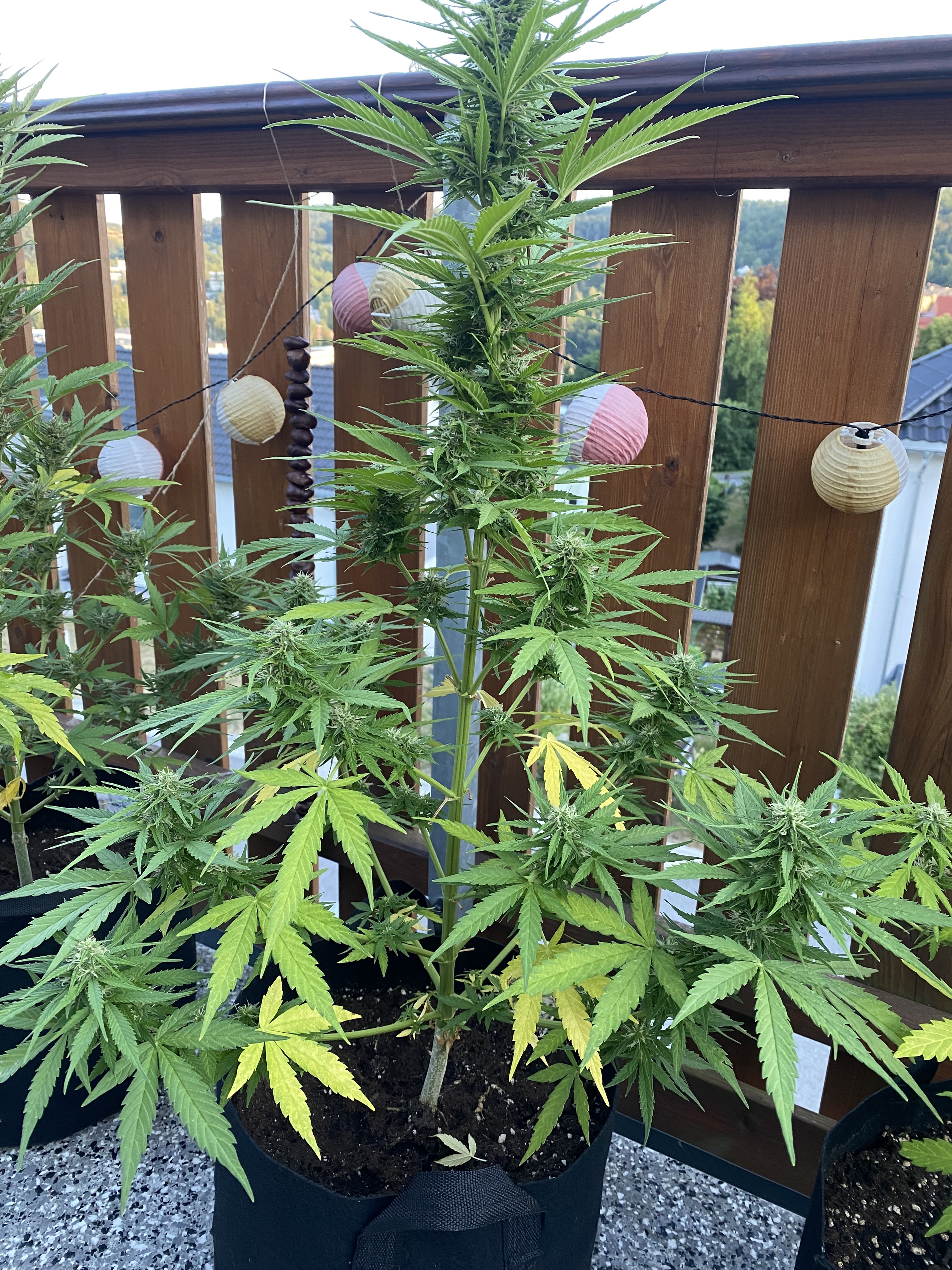 Diese waren während des ganzen Zyklus immer richtig satt Grün. Zur Mitte der Blütezeit wurden dann die ersten Blätter gelb. Mittlerweile ist es über den ganzen Pflanzen verteilt.