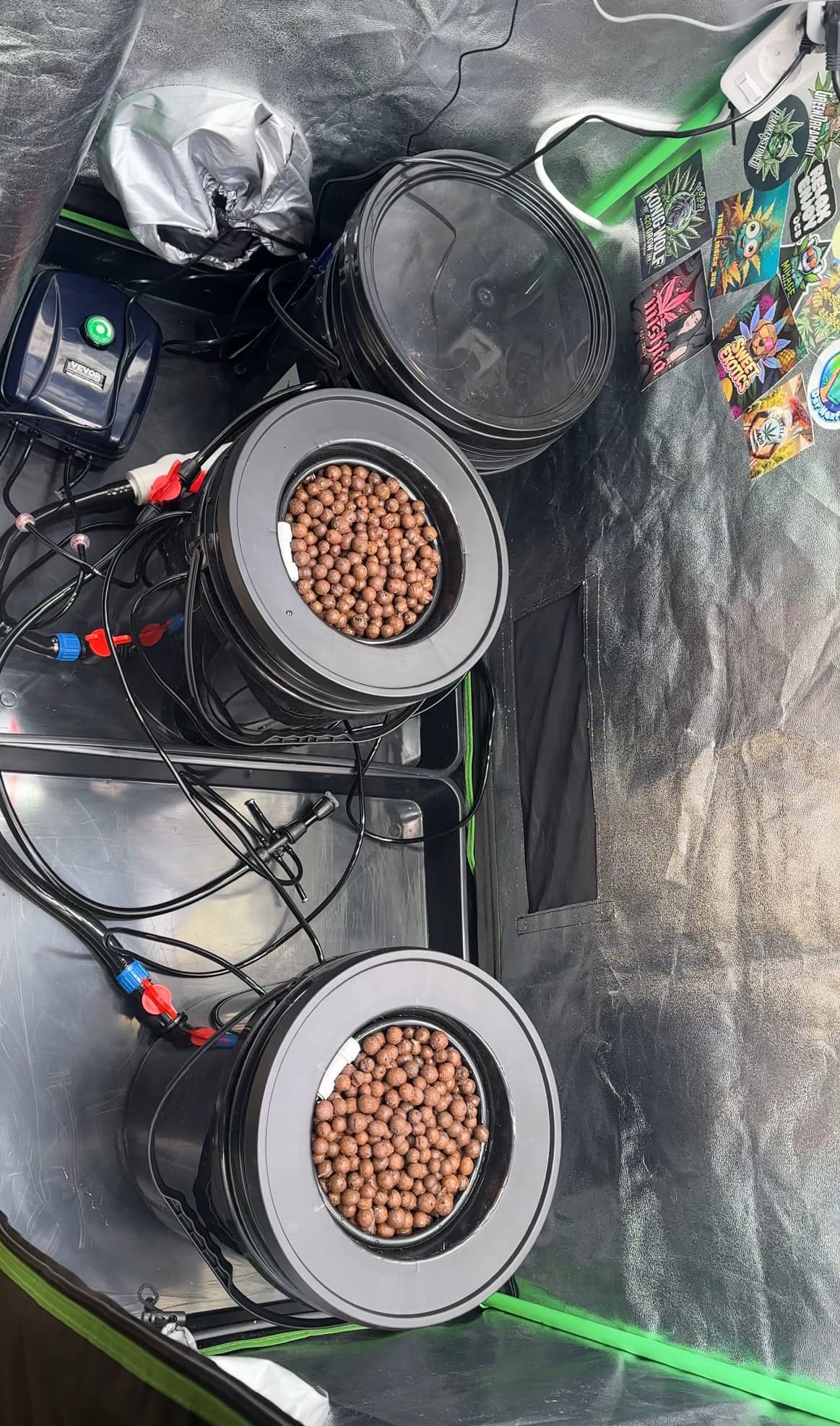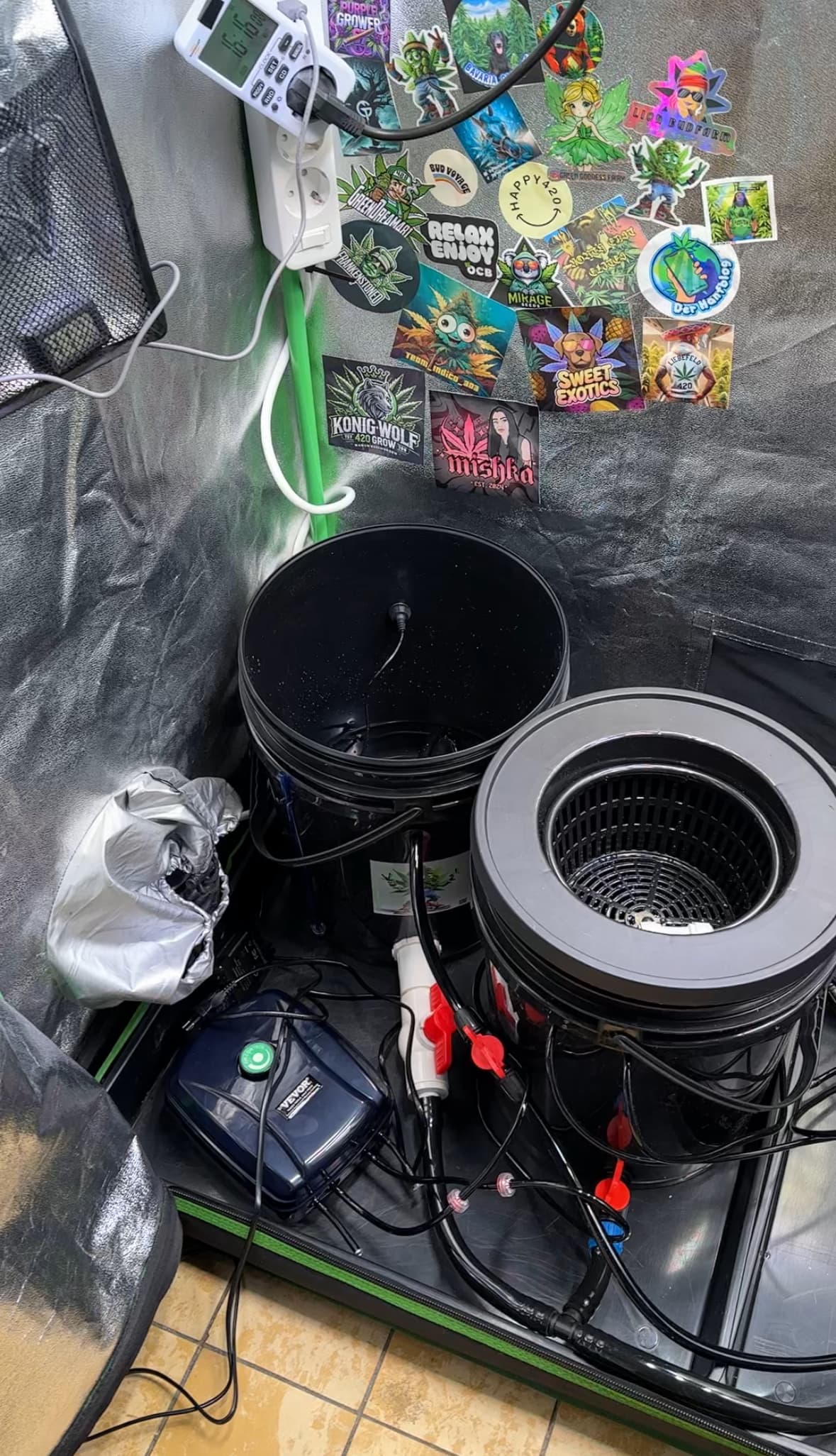 In diesem Durchlauf setze ich auf ein rezirkulierendes Deep Water Culture System (RDWC). Der Begriff „rezirkulierend“ beschreibt den stetigen Kreislauf der Nährlösung zwischen Pflanztöpfen und einem zentralen Reservoir, wodurch die Pflanzen gleichmäßig mit Wasser, Nährstoffen und Sauerstoff versorgt werden.
