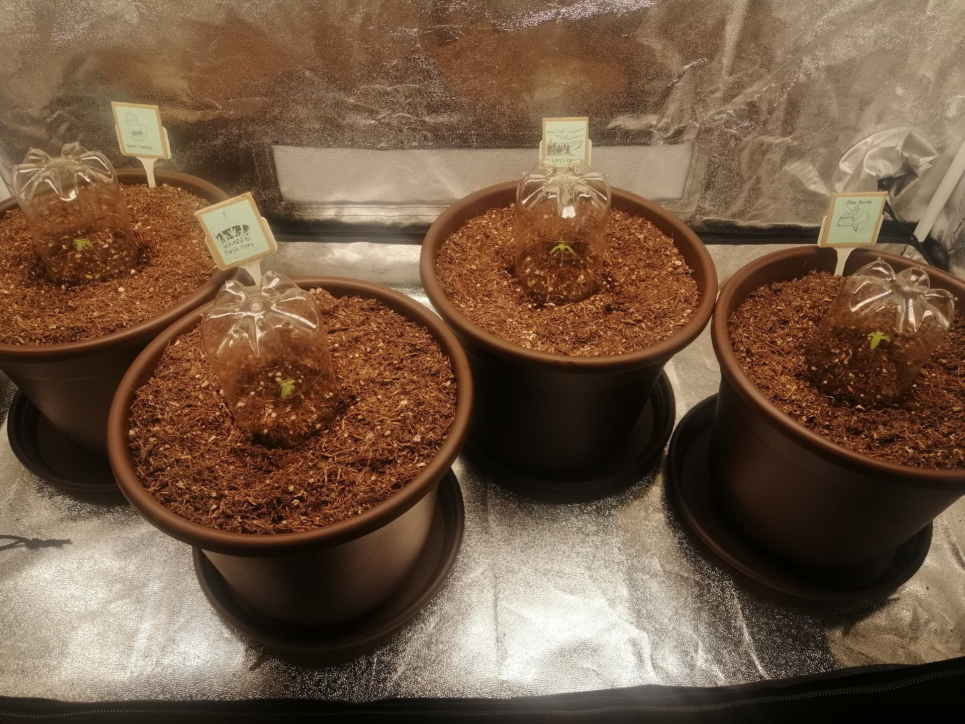 Erstens: Hauben verpasst! Durch die Abluftkonstruktion der beiden Zelte is es recht trocken. Also Boden besprüht und abgeschnittene PET-Flaschen drüber gestülpt.