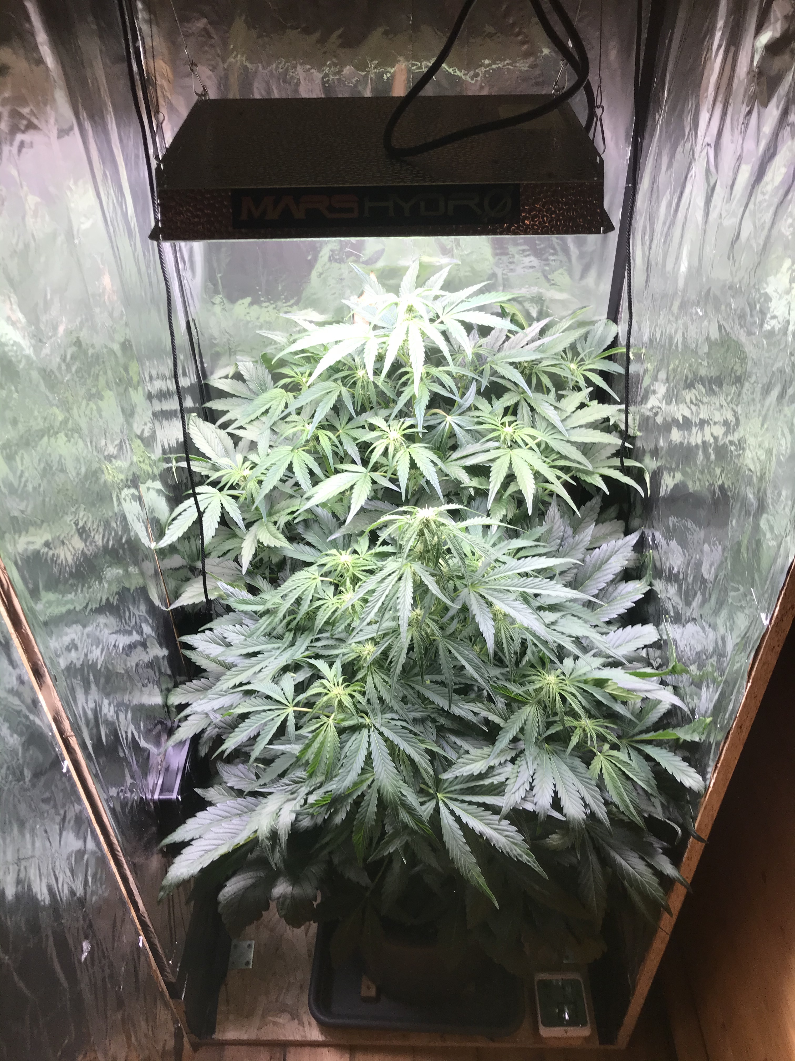 Die beiden haben sich ganz schön gestreckt in den letzten Tagen. Auch zu den Seiten. Ist ein richtiger Busch in meinem Schrank. Die Lampe kann ich noch ca. 13cm hoch ziehen, dann bin ich am Ende. Die Damen sind jetzt beide bei über 65cm ab Topfhöhe.