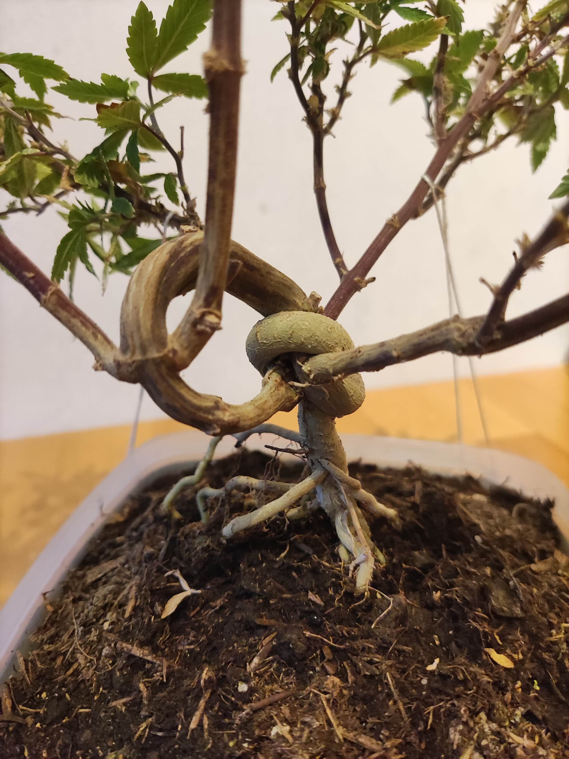 Und hier drei Bilder meiner beiden Ältesten. Die mit den Knoten im Stamm habe ich heruntergebunden, das kommt auf dem Foto wirklich ziemlich schrecht raun. Sieht in echt sehr viel „stimmiger“ aus, vielleicht ist auch nur der Winkel schlecht gewählt, aber die Idee wird transportiert …