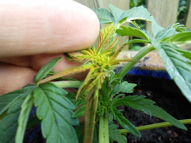 Betroffene junge Blätter können sich einrollen, kringeln oder einfach krüppelhaft wachsen. Oft ist der Neuwuchs extrem dicht beieinander, sodass kaum Abstände zwischen den Internodien vorhanden sind.