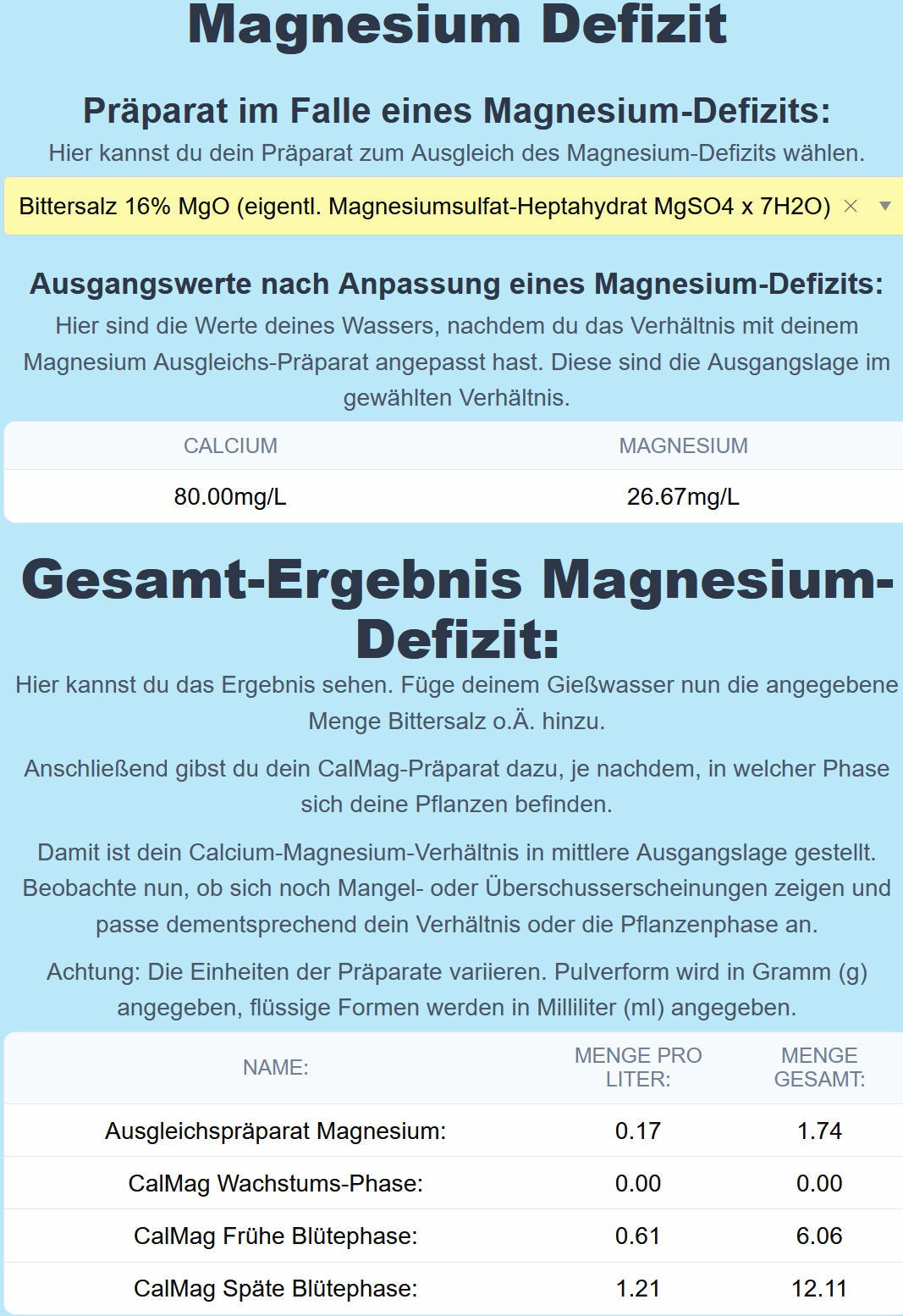 Die Wasserwerte hier haben relativ wenig Mg, so dass ich erstmal mit Bittersalz 0,2 g/l arbeite und später dann noch etwas Calmag dazugebe.