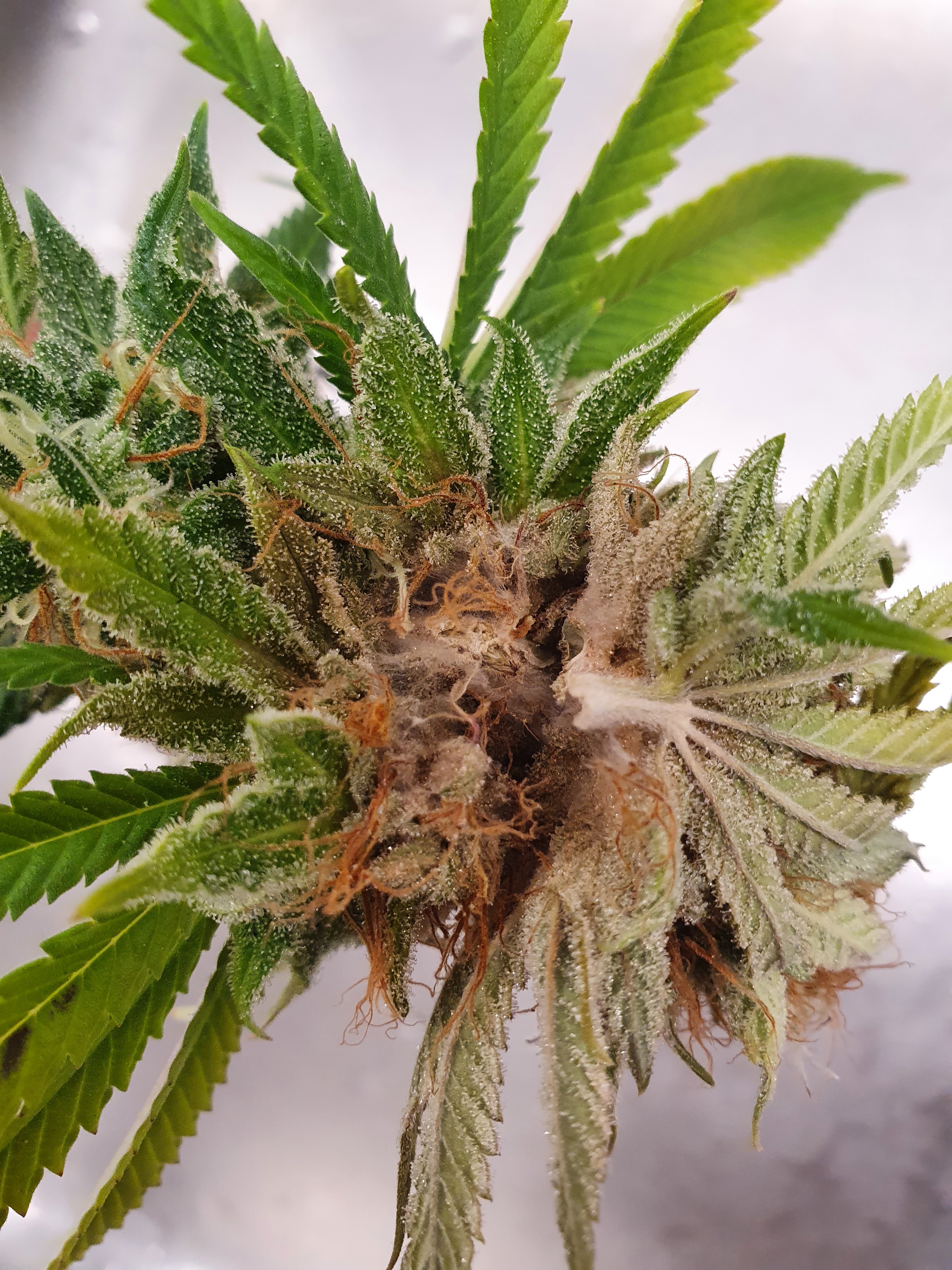 Habe vor 2 Tagen bemerkt dass ein Bud verwelkte/trockenere/gelblichere Blätter bekommt. Da kein Schimmel zu sehen war und meine RLF tagsüber bei 40-50 ist und nachts ca bei 65 dachte ich es sei nicht schlimm. Dem ist wohl nicht so Habe ihn mit einer Schere abgetrennt samt 2 gesunden Buds darunter. Wenn ich mir den Stengel ansehe und nicht zu viel verwedelt habe sollte ich jetzt safe sein hoffe ich.