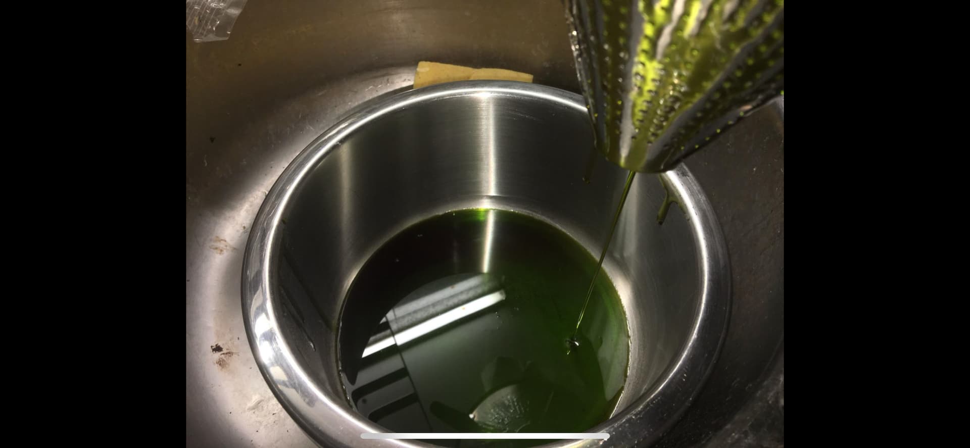 Nachdem Butter und Pflanzenmaterial lange genug geköchelt haben, kippe ich alles durch ein Sieb in eine Schüssel und lasse das trocknen (auf dem Bild ist ein halbierter Schüsselinhalt).