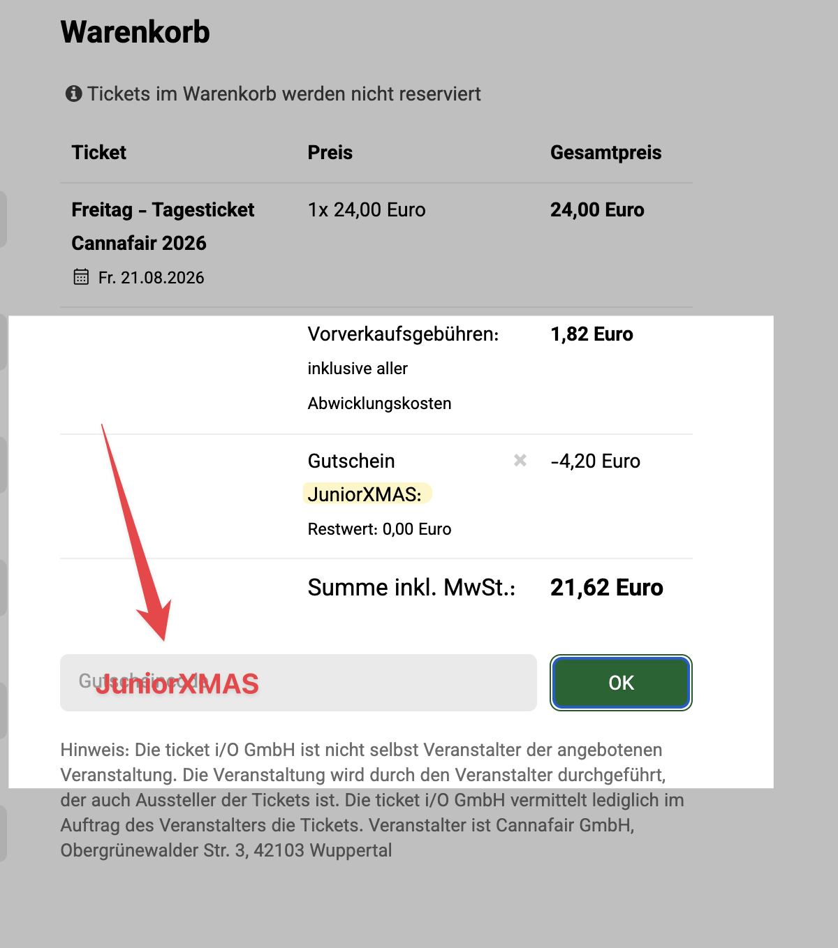 Wählt euer Wunschticket und gebt den Code JuniorXMAS im letzten Schritt ein. Dann wird der Rabatt automatisch angewendet.