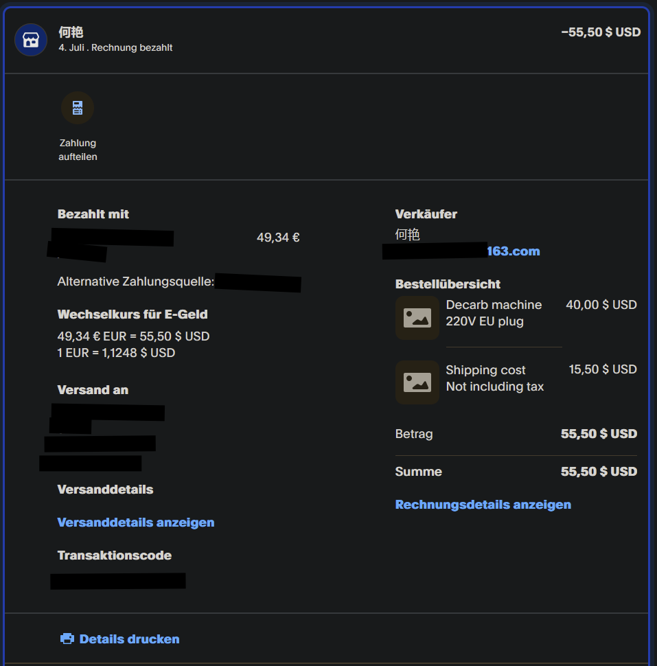 - Gesamtpreis: 35 € + 15 € Versand = 50 €