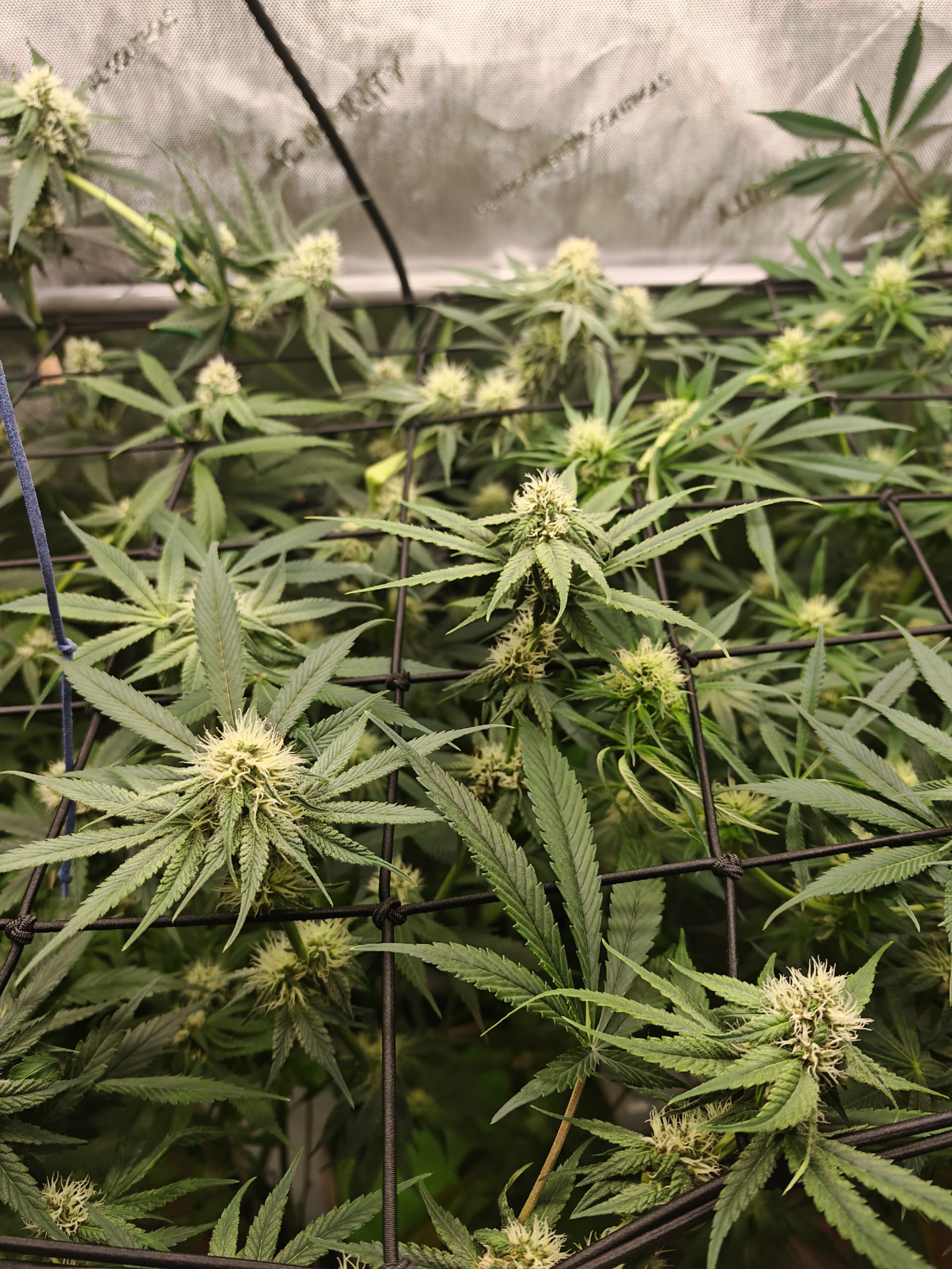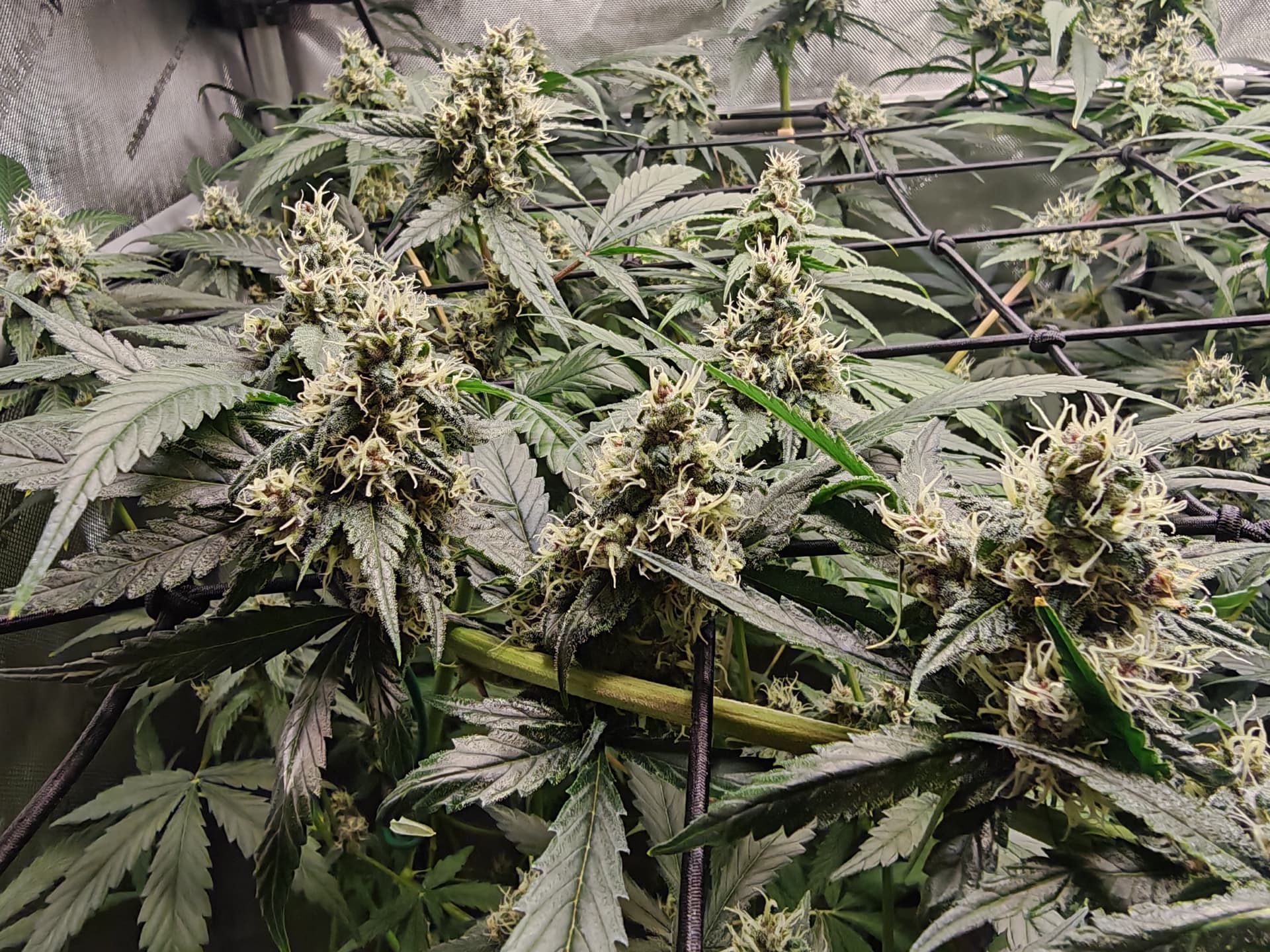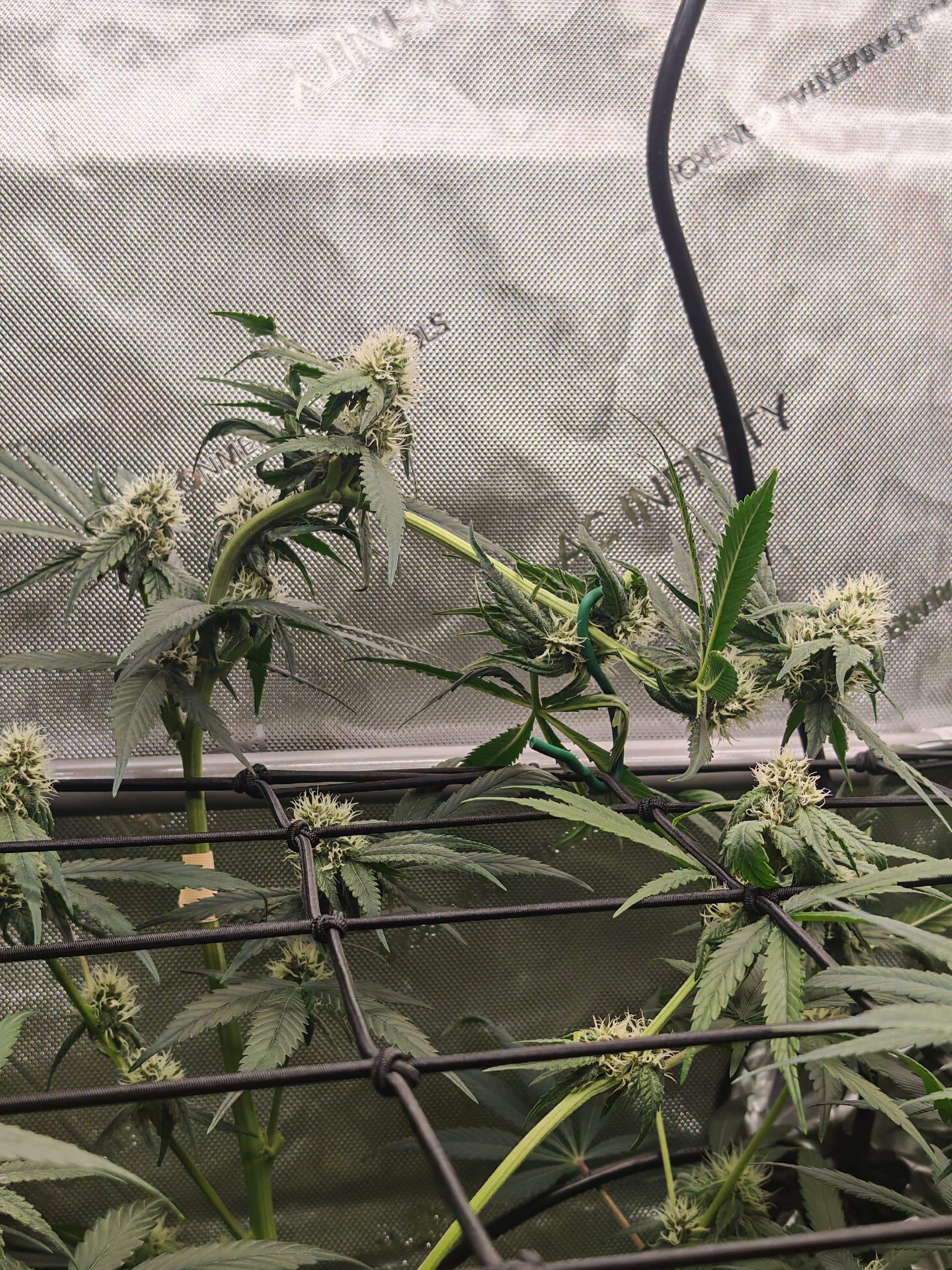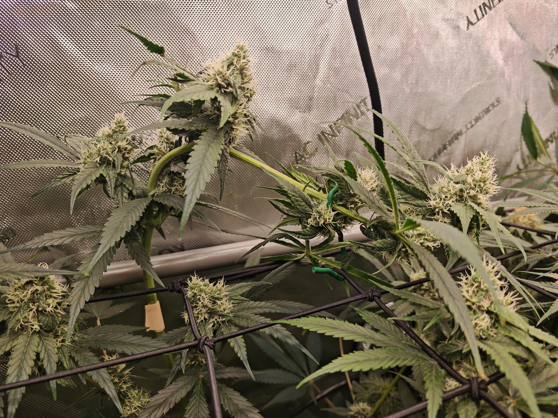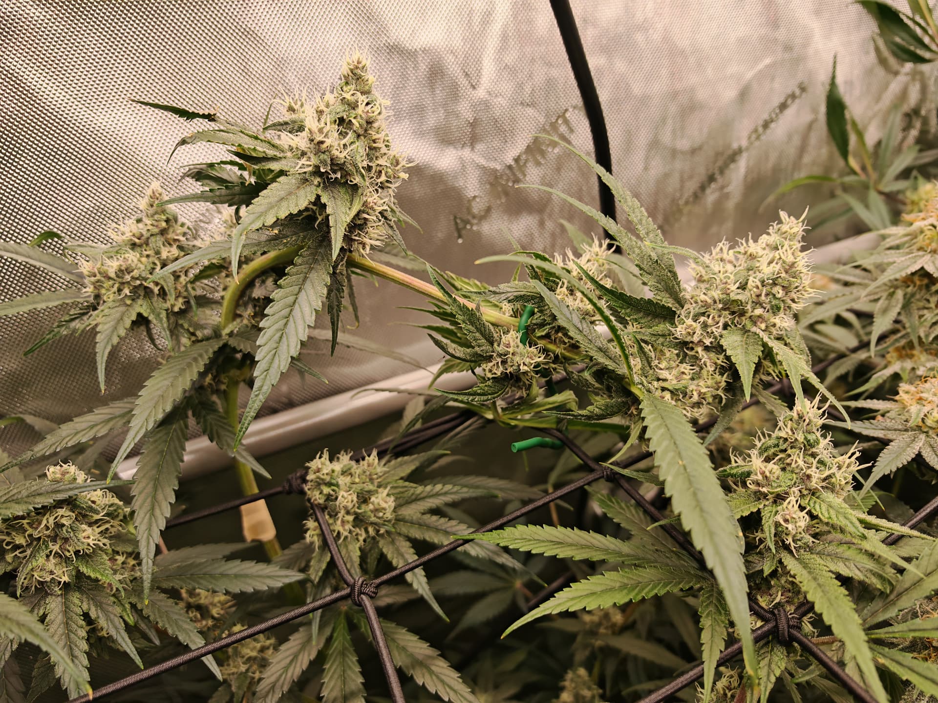 Puhh⊠also das mĂŒsste die Cherry Poppers sein (Chocolope links, Cherry mittig, Strawberry rechts). Ist durch das âunters Netz knĂŒppelnâ etwas vermischt, da ich die lĂ€ngeren Triebe zu den Seiten und auch in den Bereich der anderen Lady fĂŒhren musste.