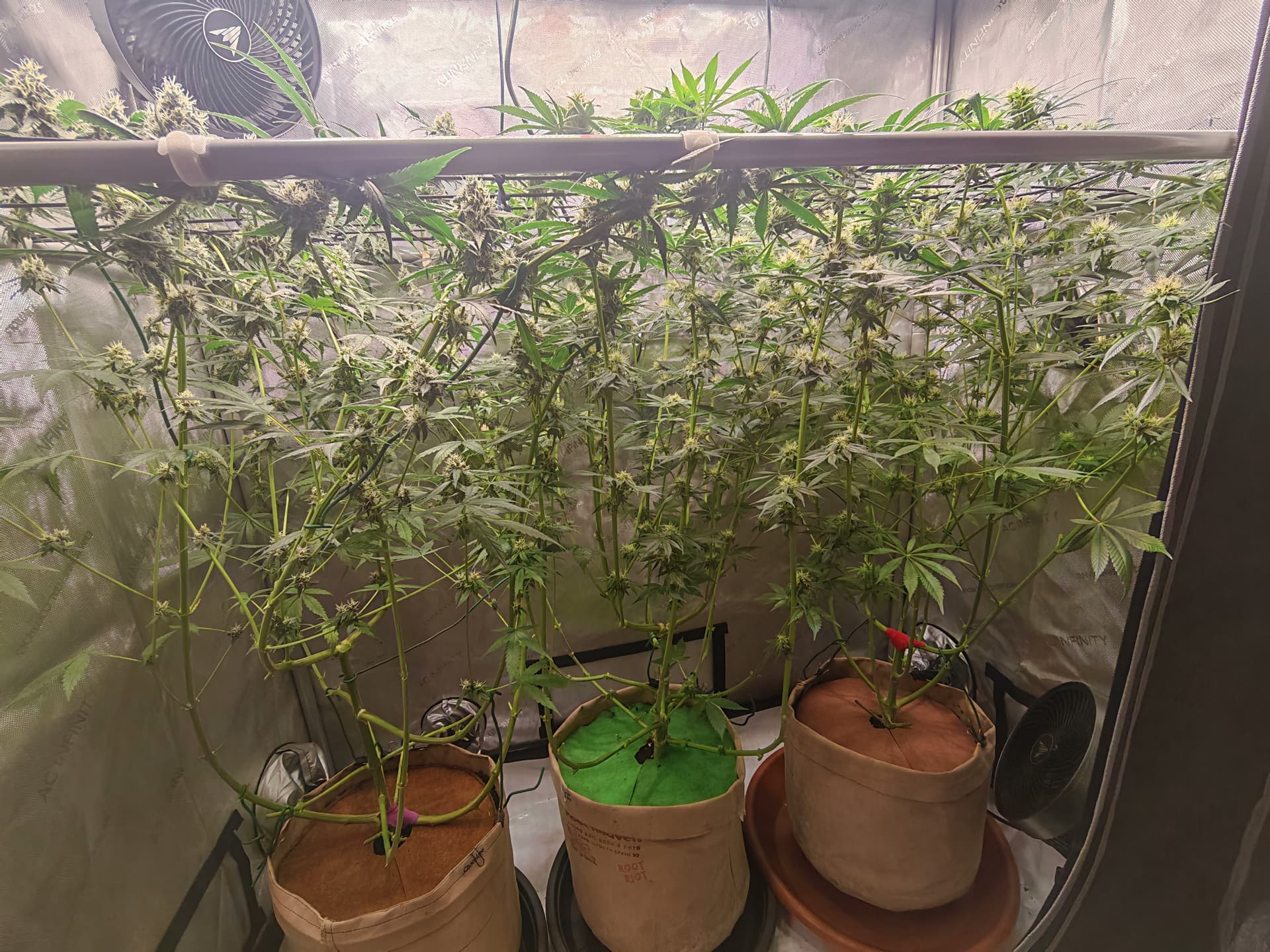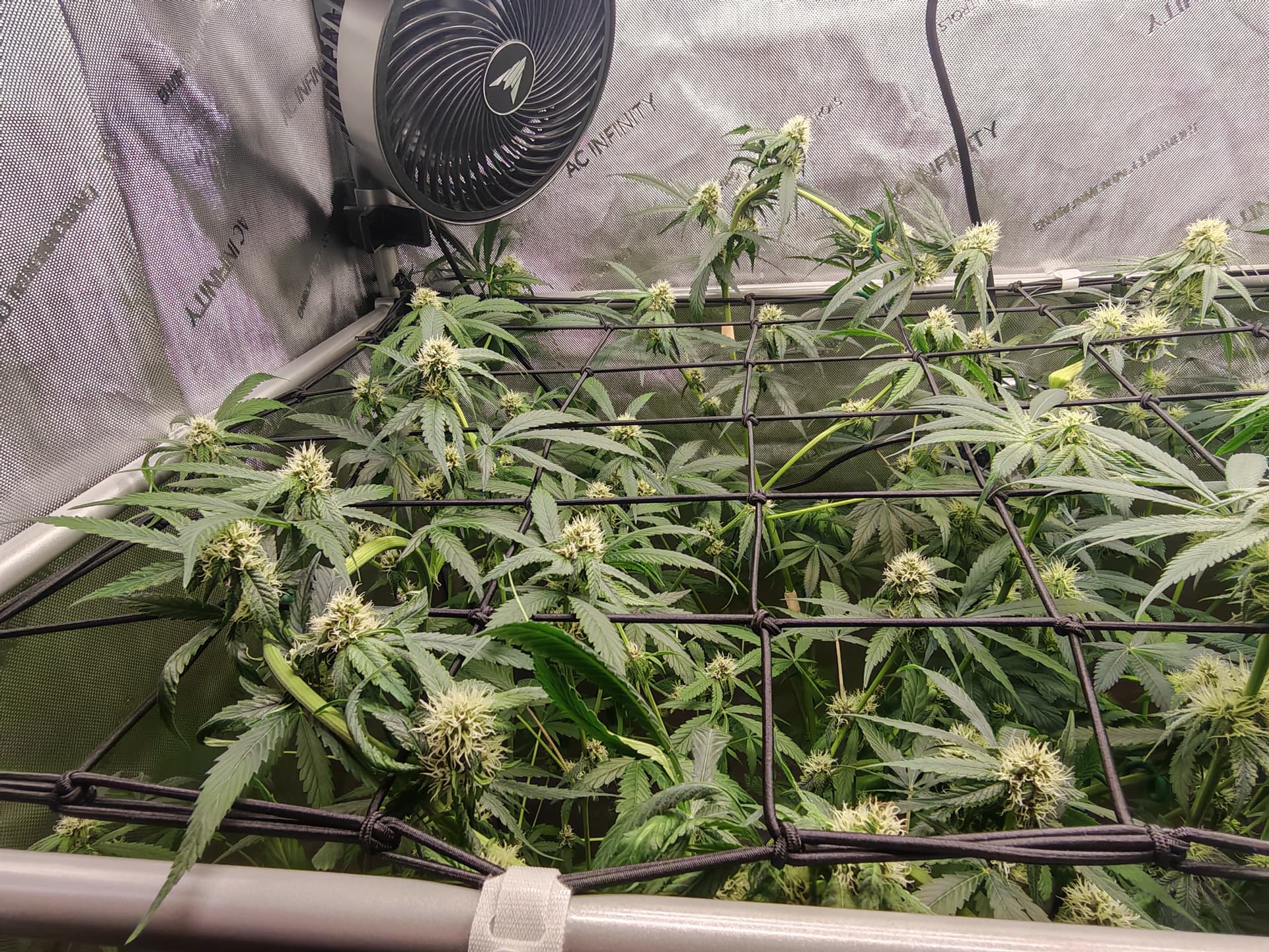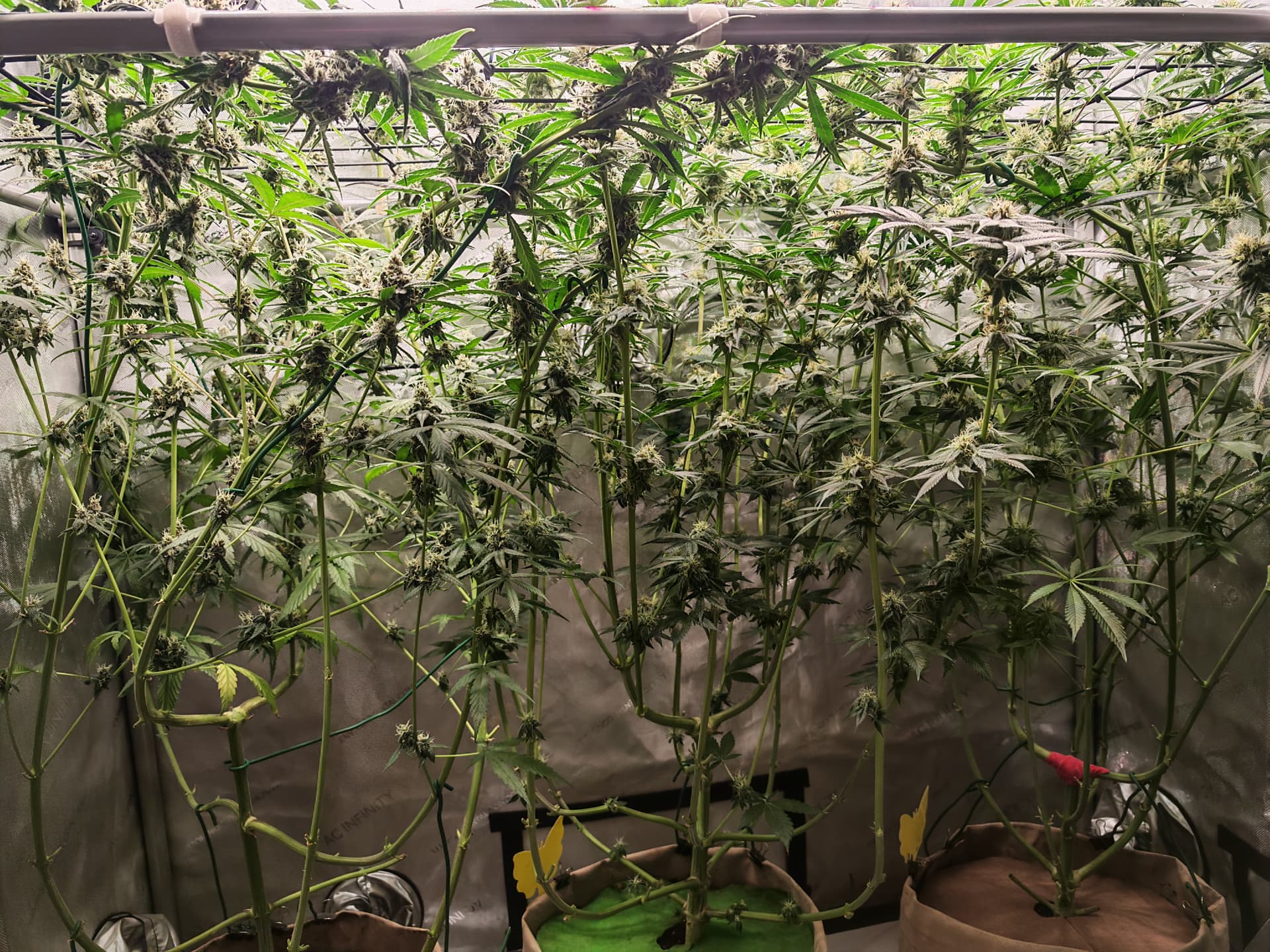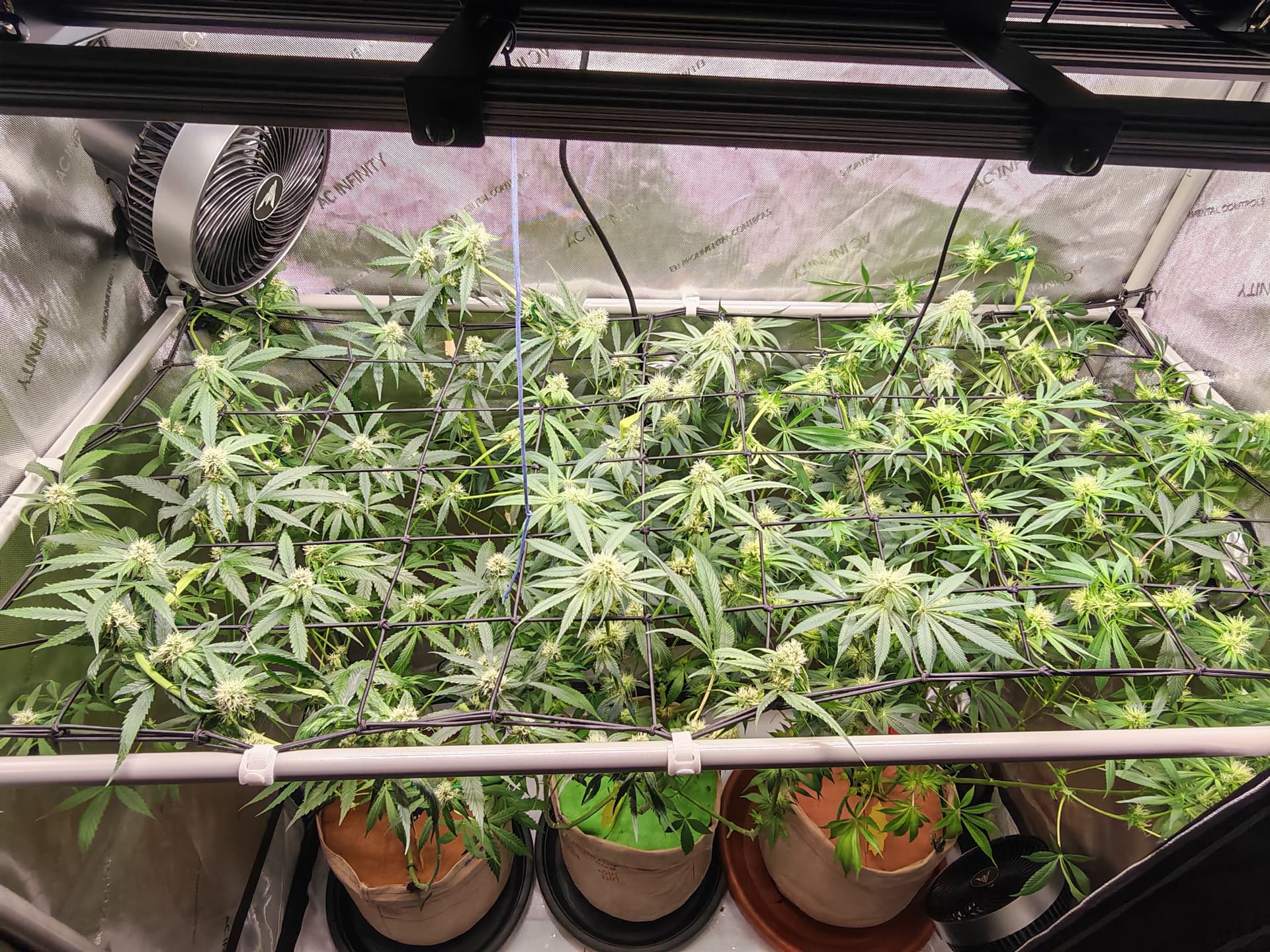 Puhh⊠also das mĂŒsste die Cherry Poppers sein (Chocolope links, Cherry mittig, Strawberry rechts). Ist durch das âunters Netz knĂŒppelnâ etwas vermischt, da ich die lĂ€ngeren Triebe zu den Seiten und auch in den Bereich der anderen Lady fĂŒhren musste.