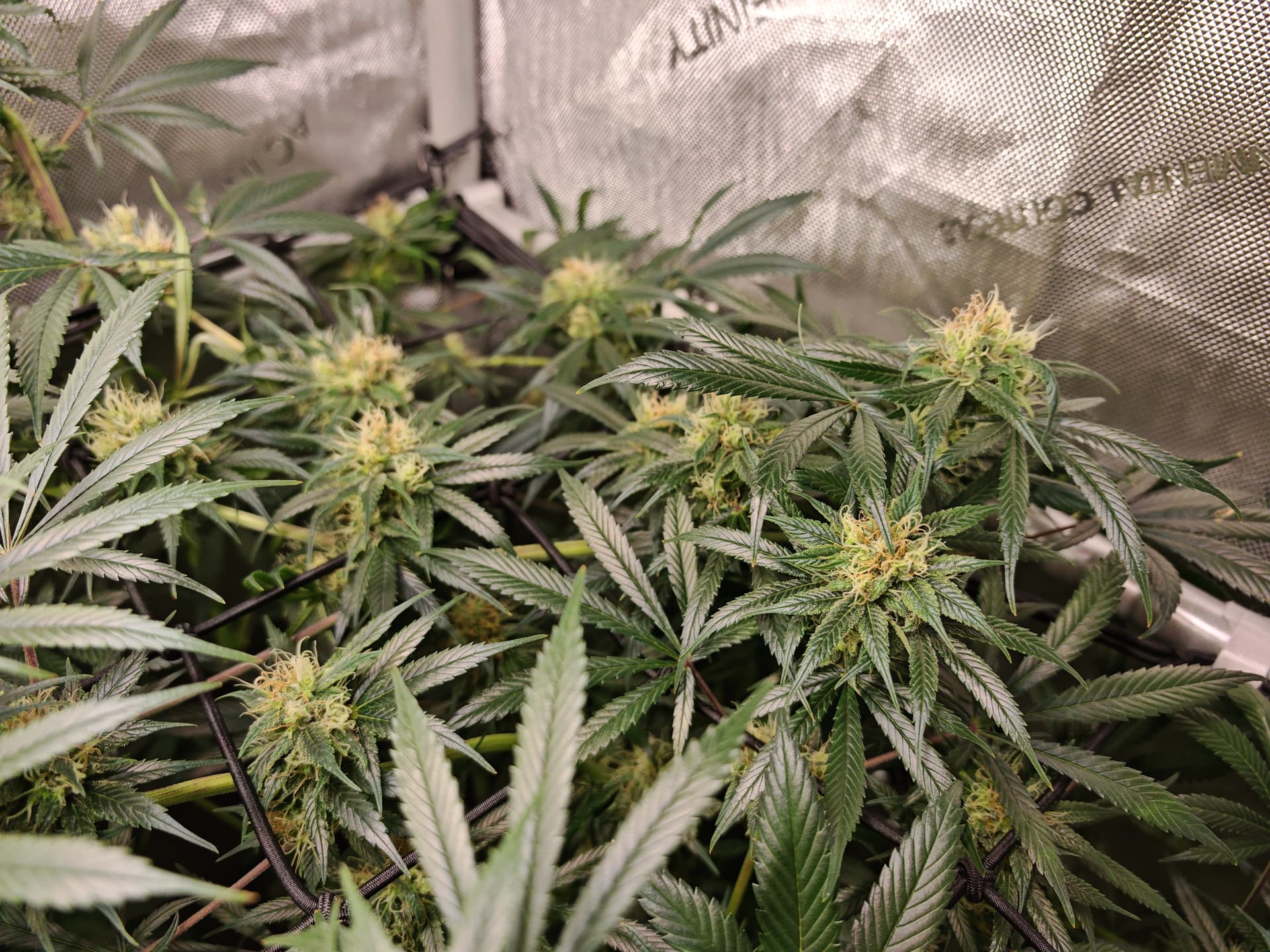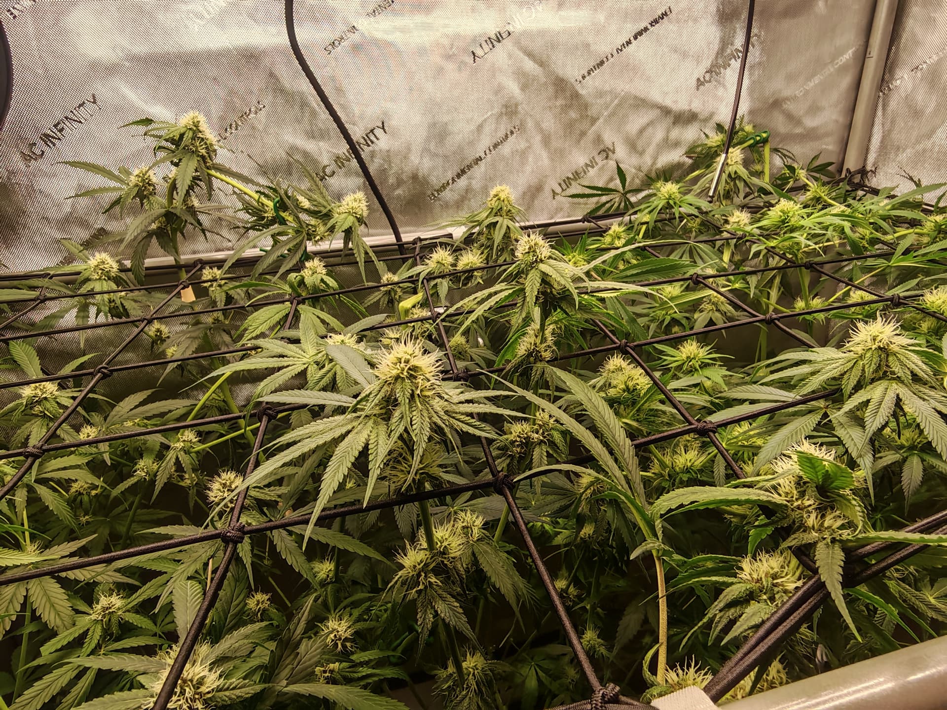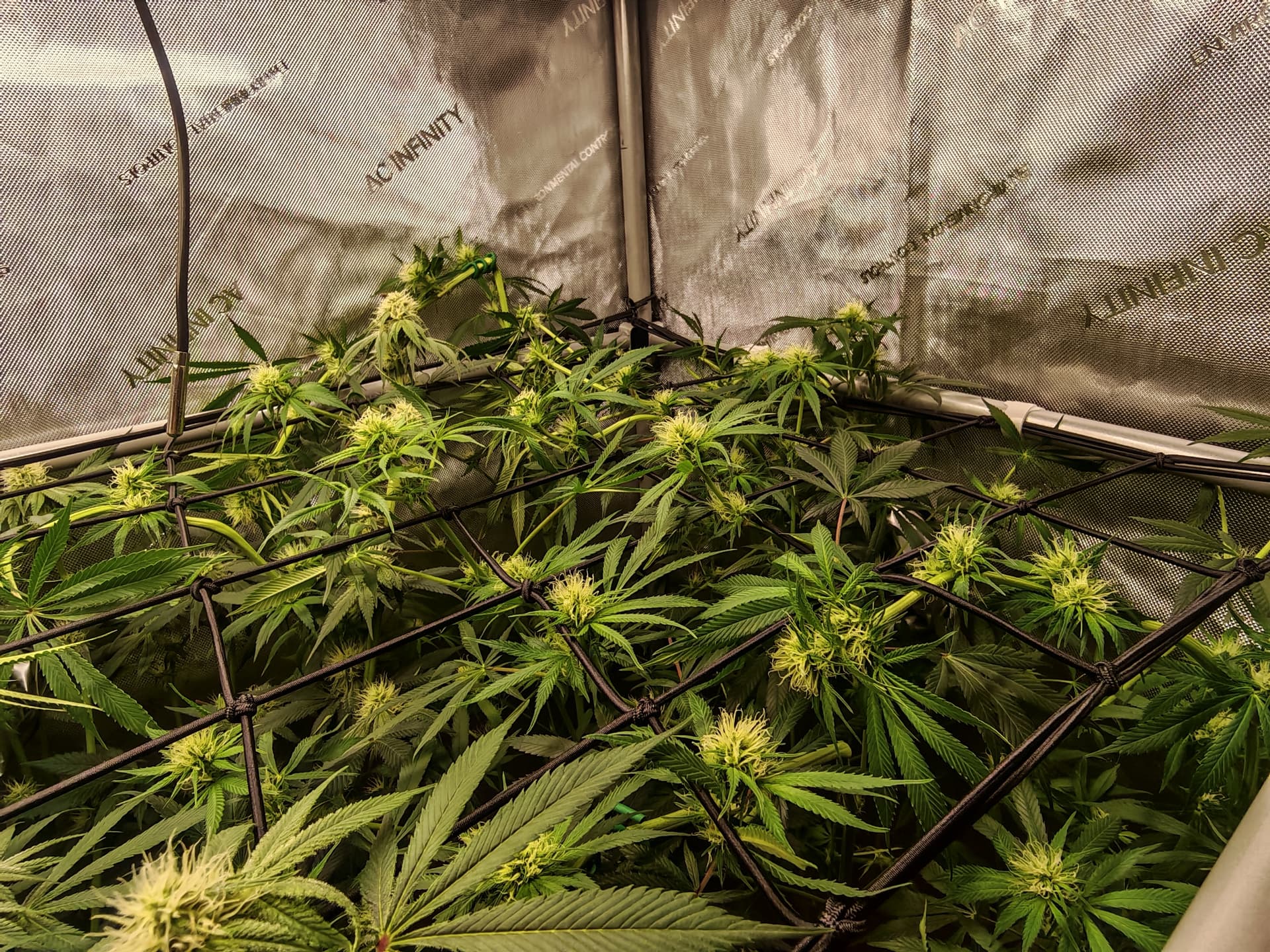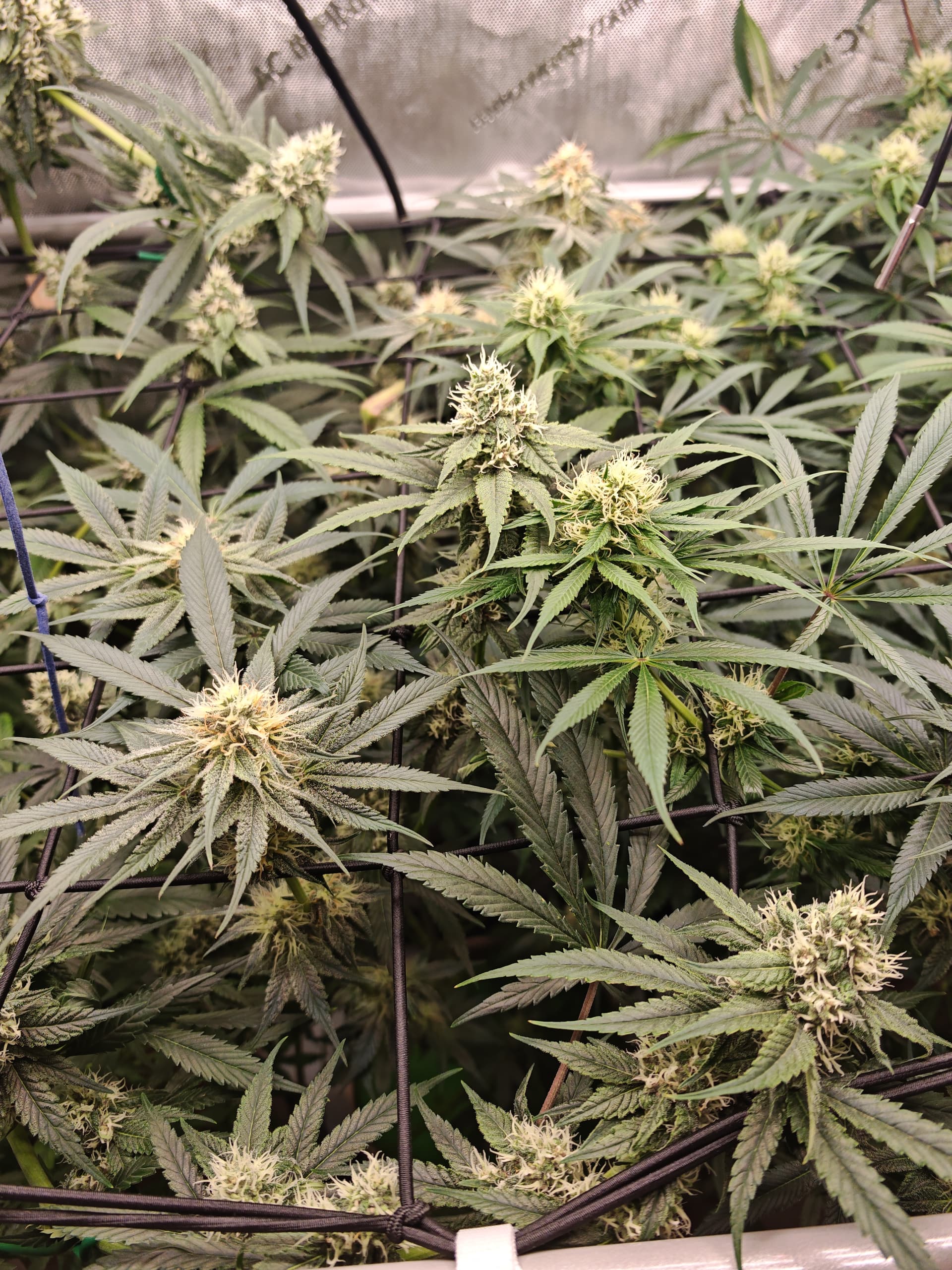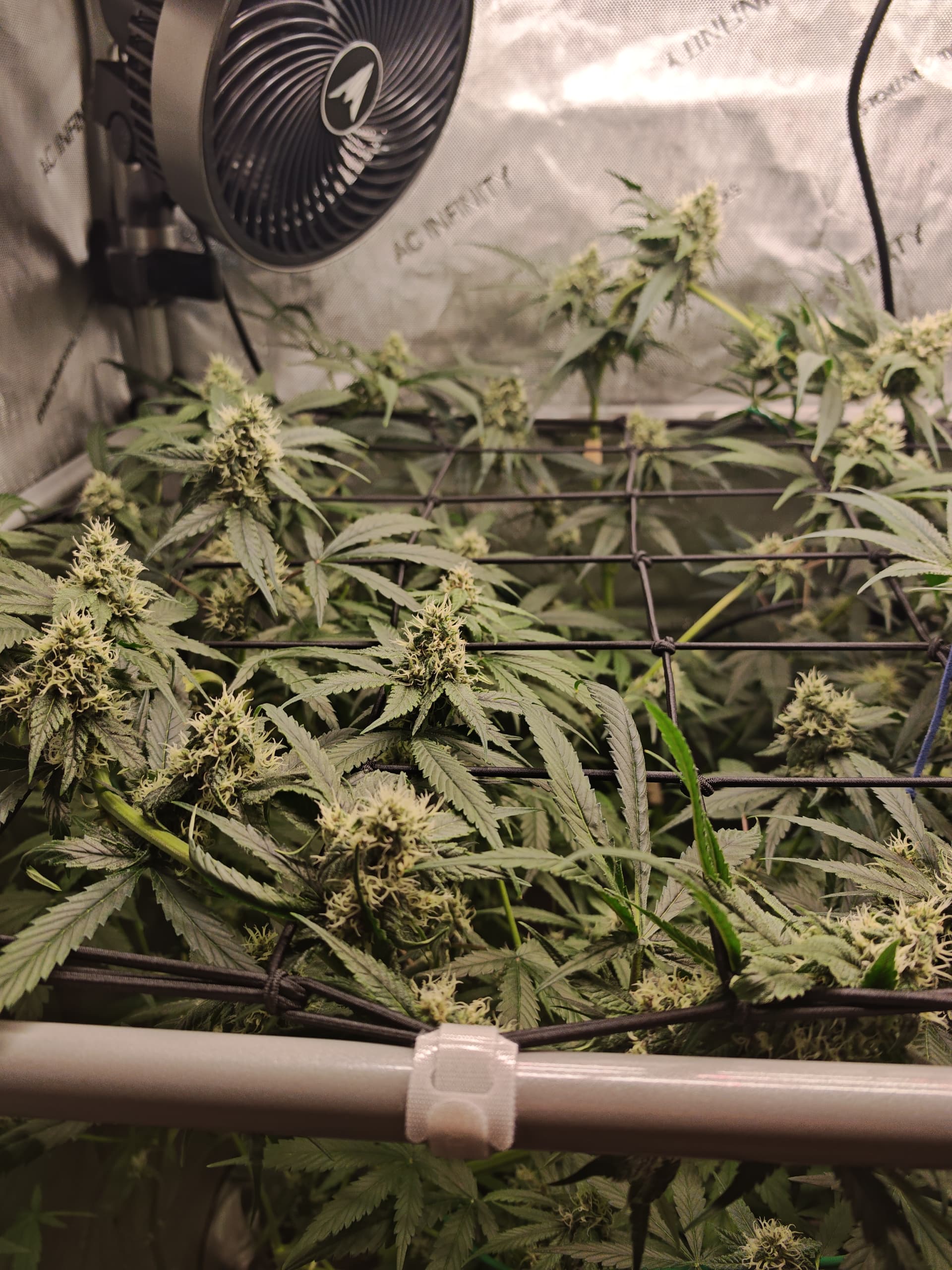 Puhh⊠also das mĂŒsste die Cherry Poppers sein (Chocolope links, Cherry mittig, Strawberry rechts). Ist durch das âunters Netz knĂŒppelnâ etwas vermischt, da ich die lĂ€ngeren Triebe zu den Seiten und auch in den Bereich der anderen Lady fĂŒhren musste.