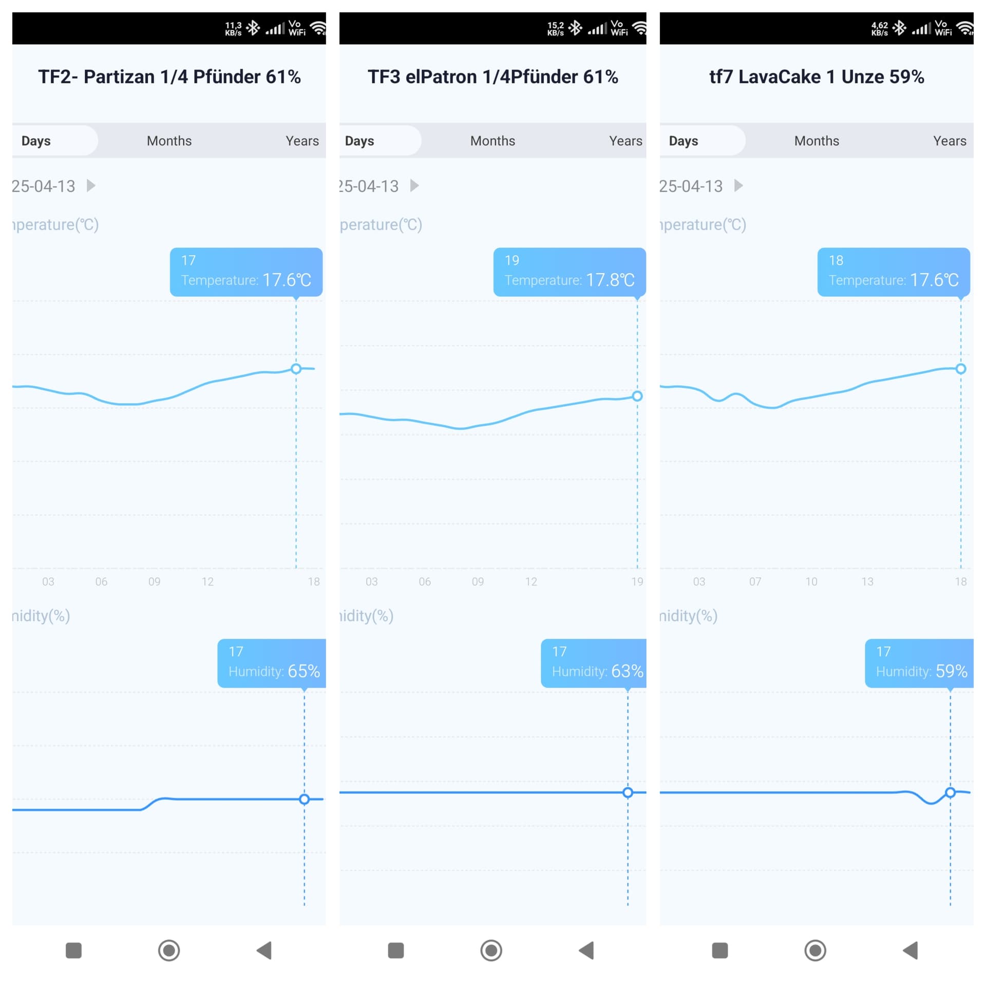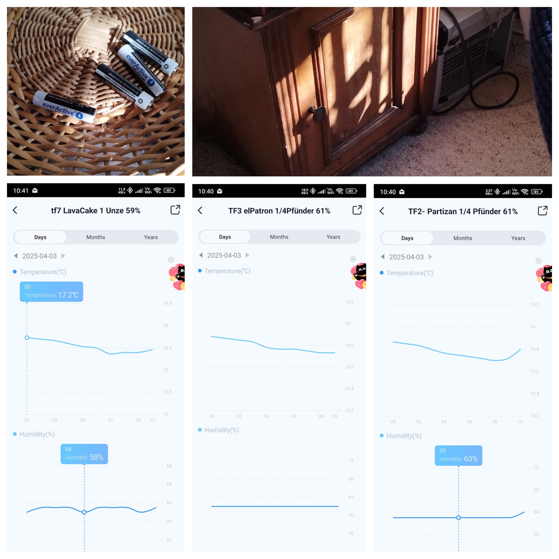 Ich hab jetzt in das Schränkchen ein eigenes T/Hmeter gepackt. Jetzt kann man quasi die Umgebung der Bags beurteilen.