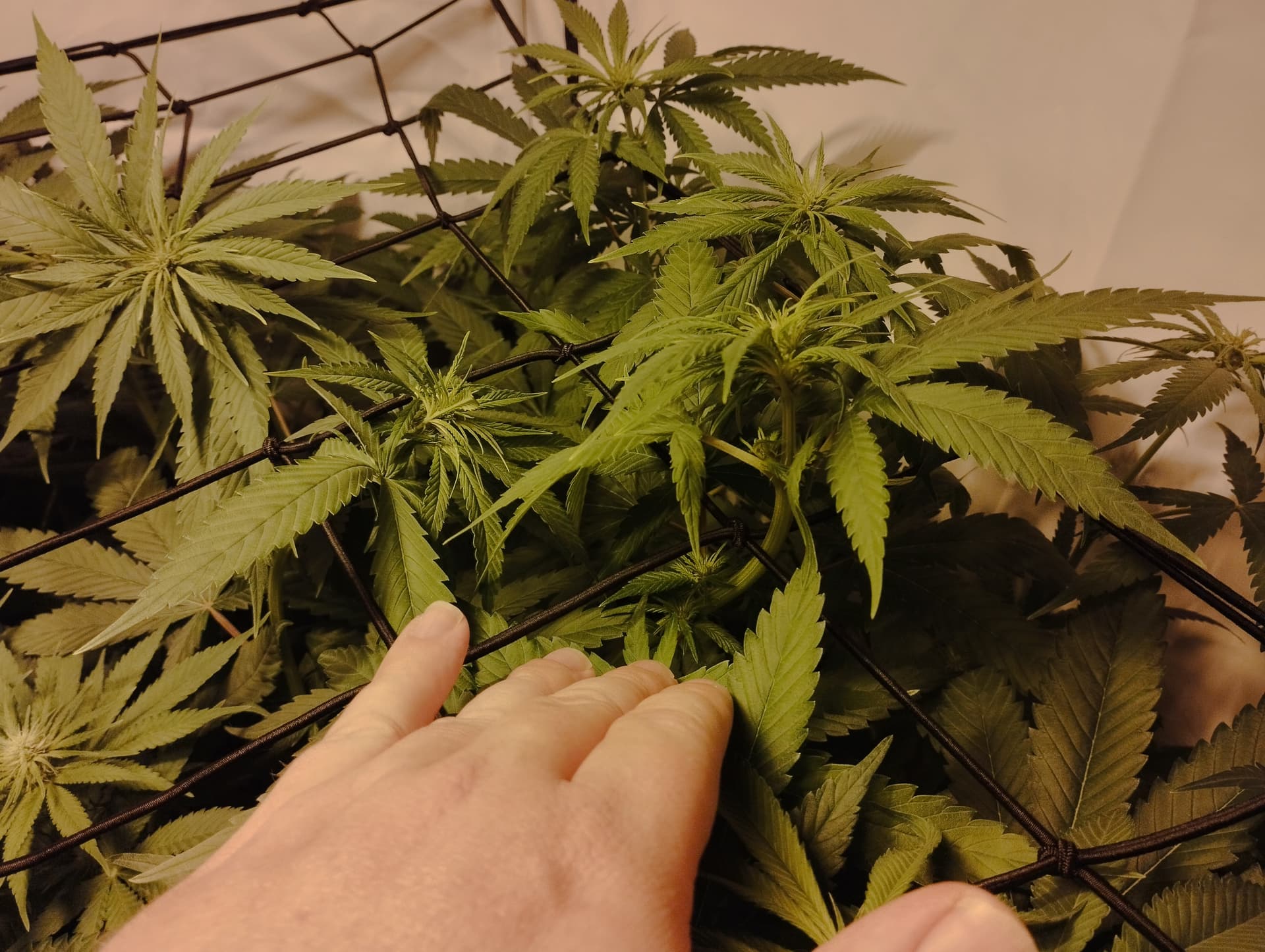 Es wächst und gedeiht…und zwar echt ein wenig viel! Ich hab vor lauter Verzweiflung schon ein Scrognetz eingespannt um den Wuchs zu behindern…mit mäßigem Erfolg. Die Triebe wachsen einfach in einer Biegung drum herum und lassen sich nicht mal mehr richtig biegen aber seht selbst: