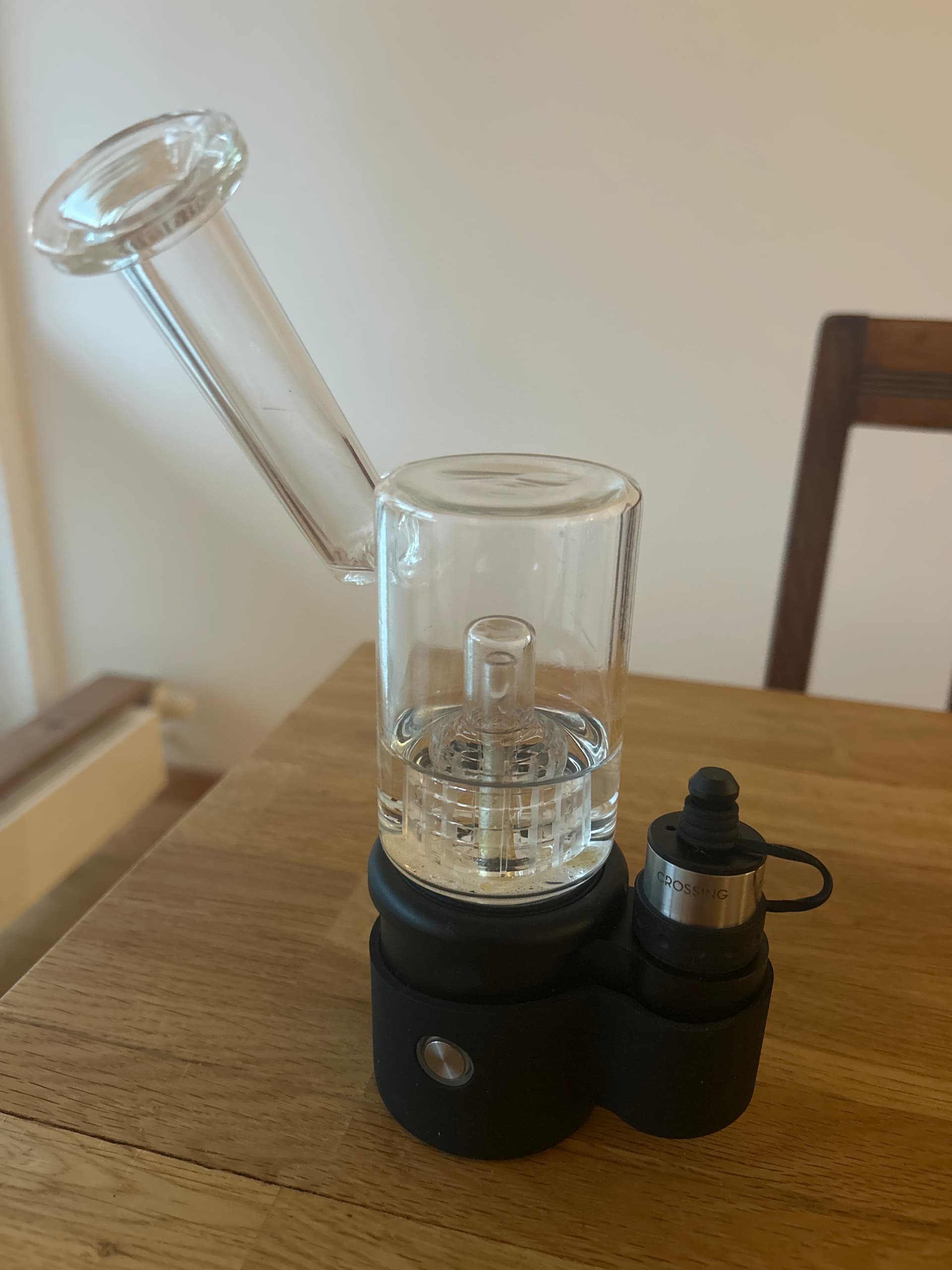 Ich habe mir auch Shenzhen Crossing angeschaut. Das Gerät auf deinem Foto ist ein Core 2.0 eRig. Man erkennt es am typischen Glasaufsatz mit Perkolator, der abnehmbaren Wasser-Kammer und der seitlichen Position der Heizkammer, auf der auch „Crossing“ steht.