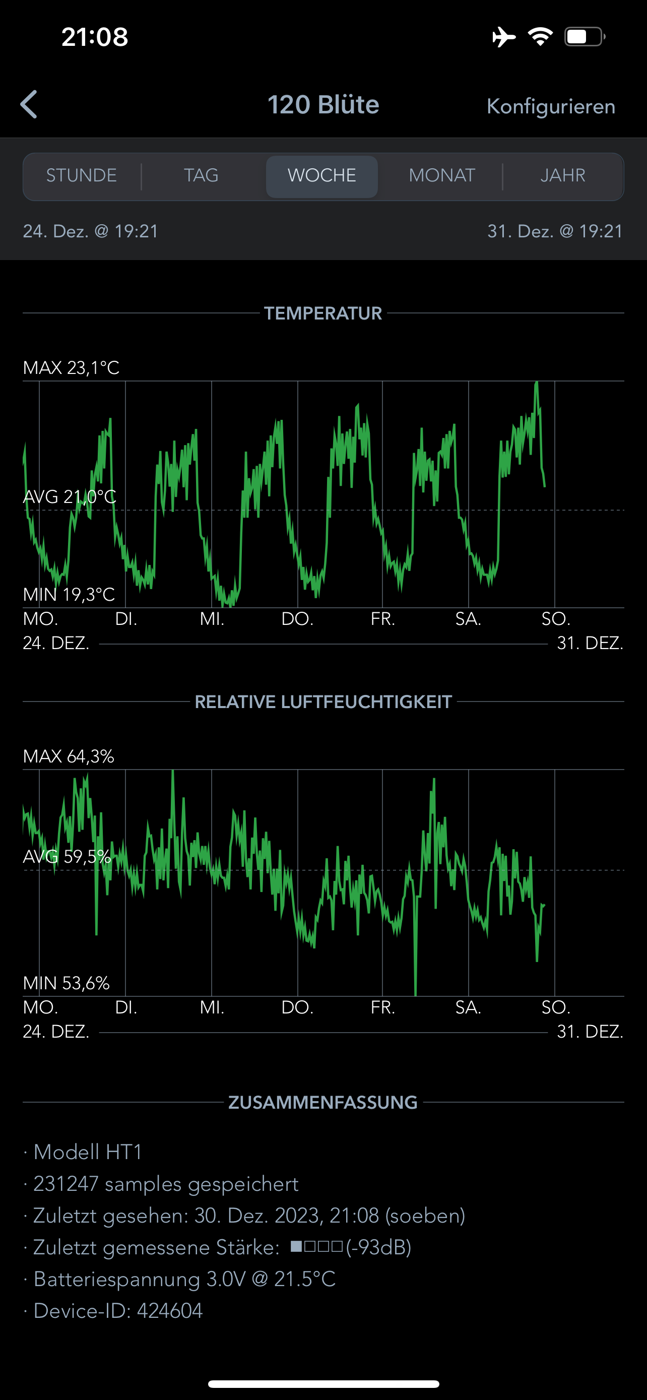 Temperatur min. ist 19 und max. ist 23. RLF durchschnitt gute 60%.