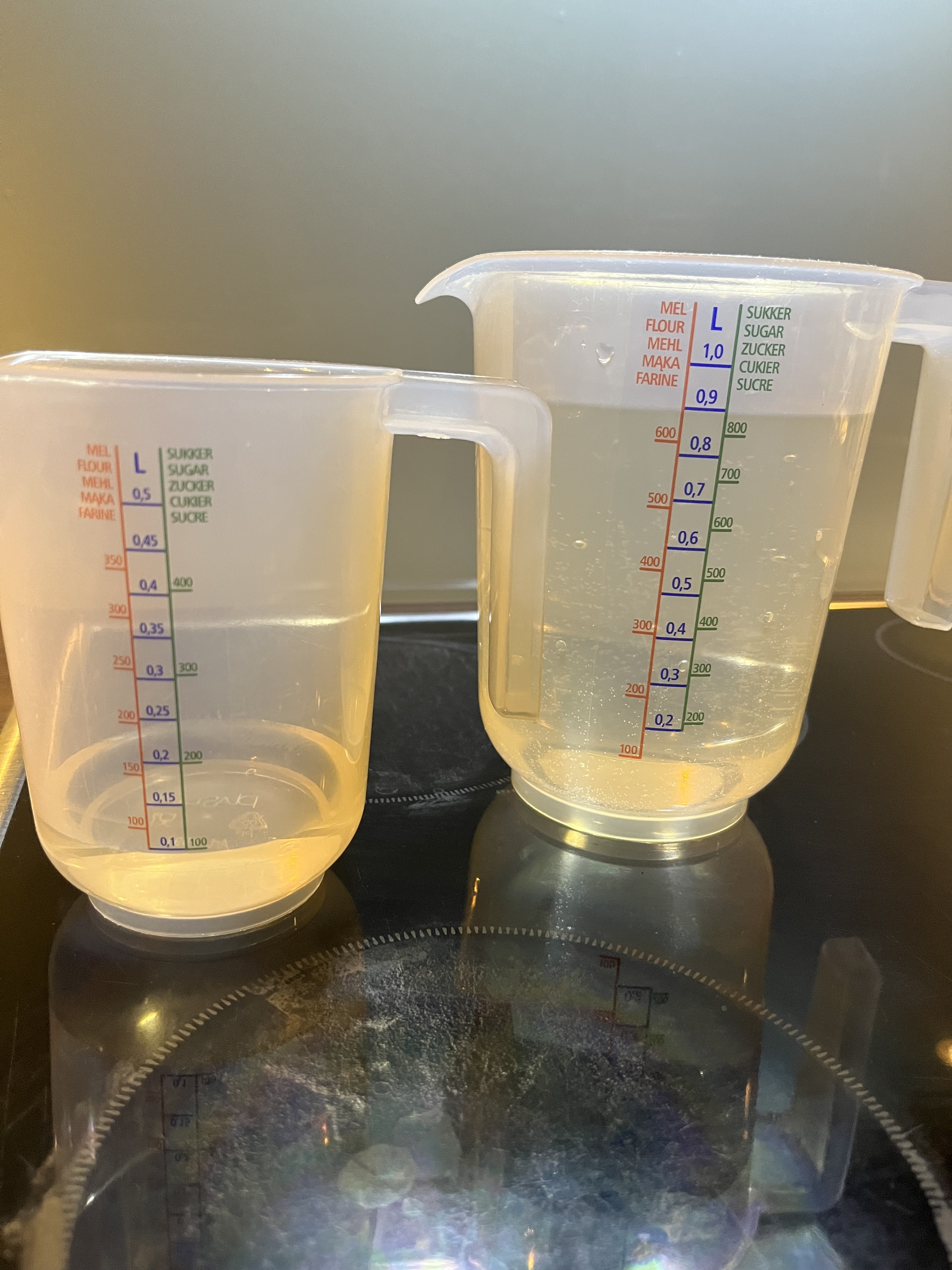 Neues Gießwasser wurde vorbereitet für morgen diesmal ganz normal aus der Leitung mit 0,14g Bittersalz und morgen kommt noch ein ml Grow mit dazu . Dann bekommt jede Pflanze 250ml .