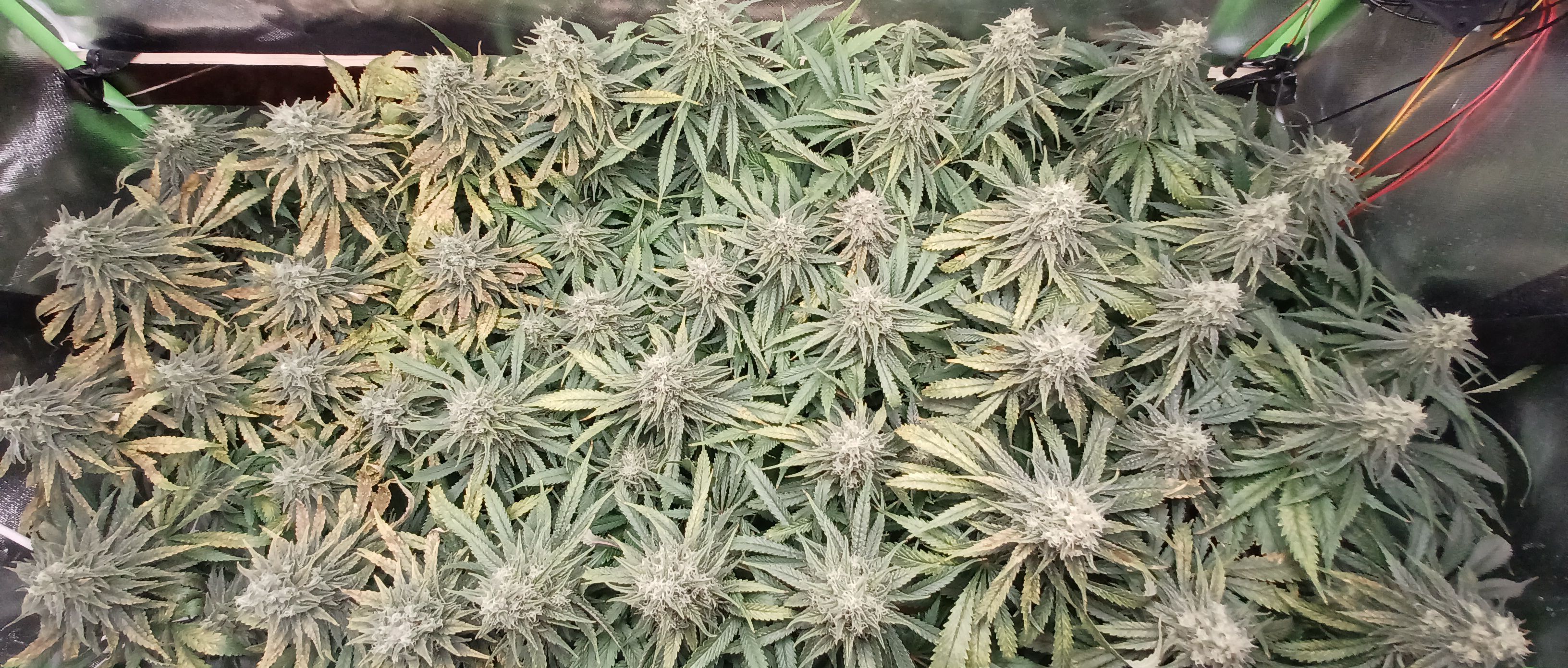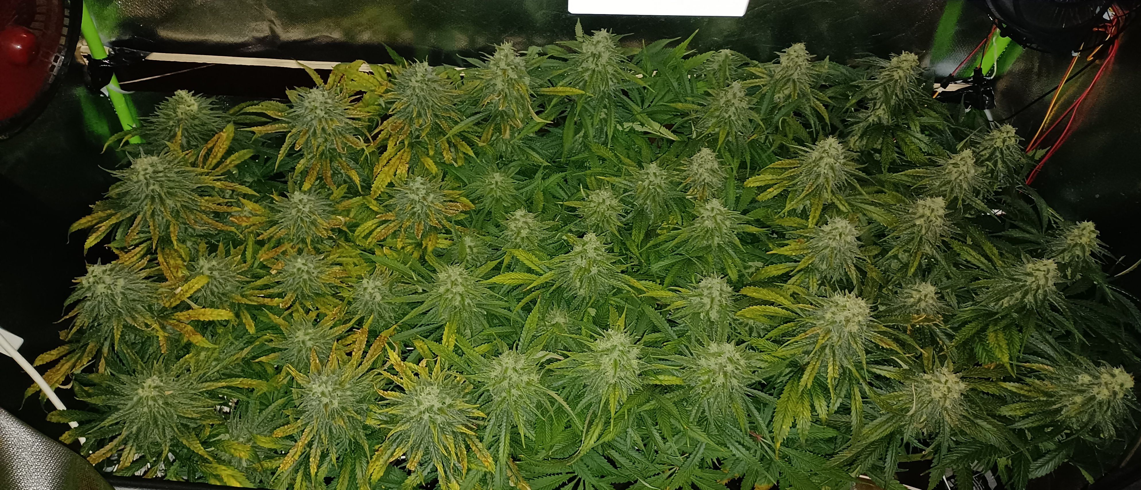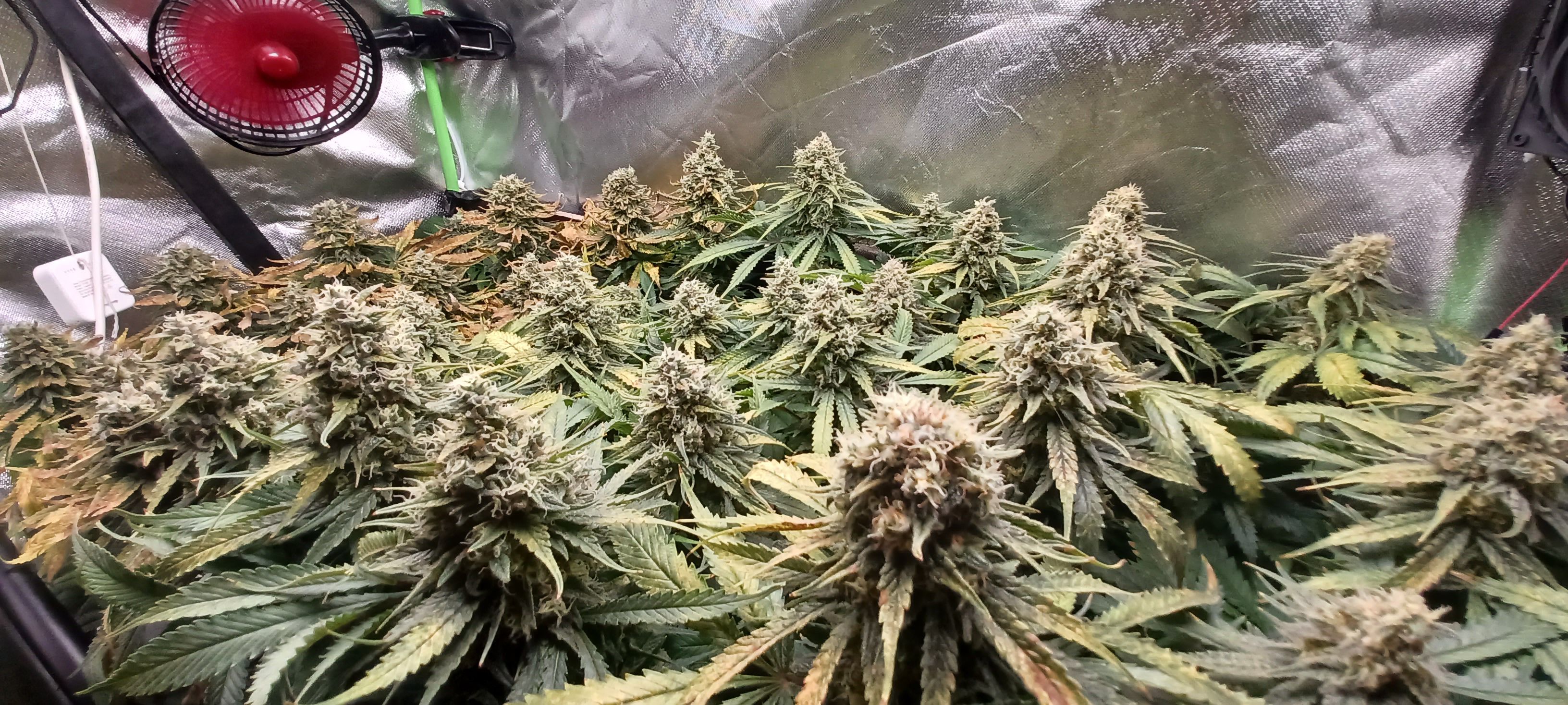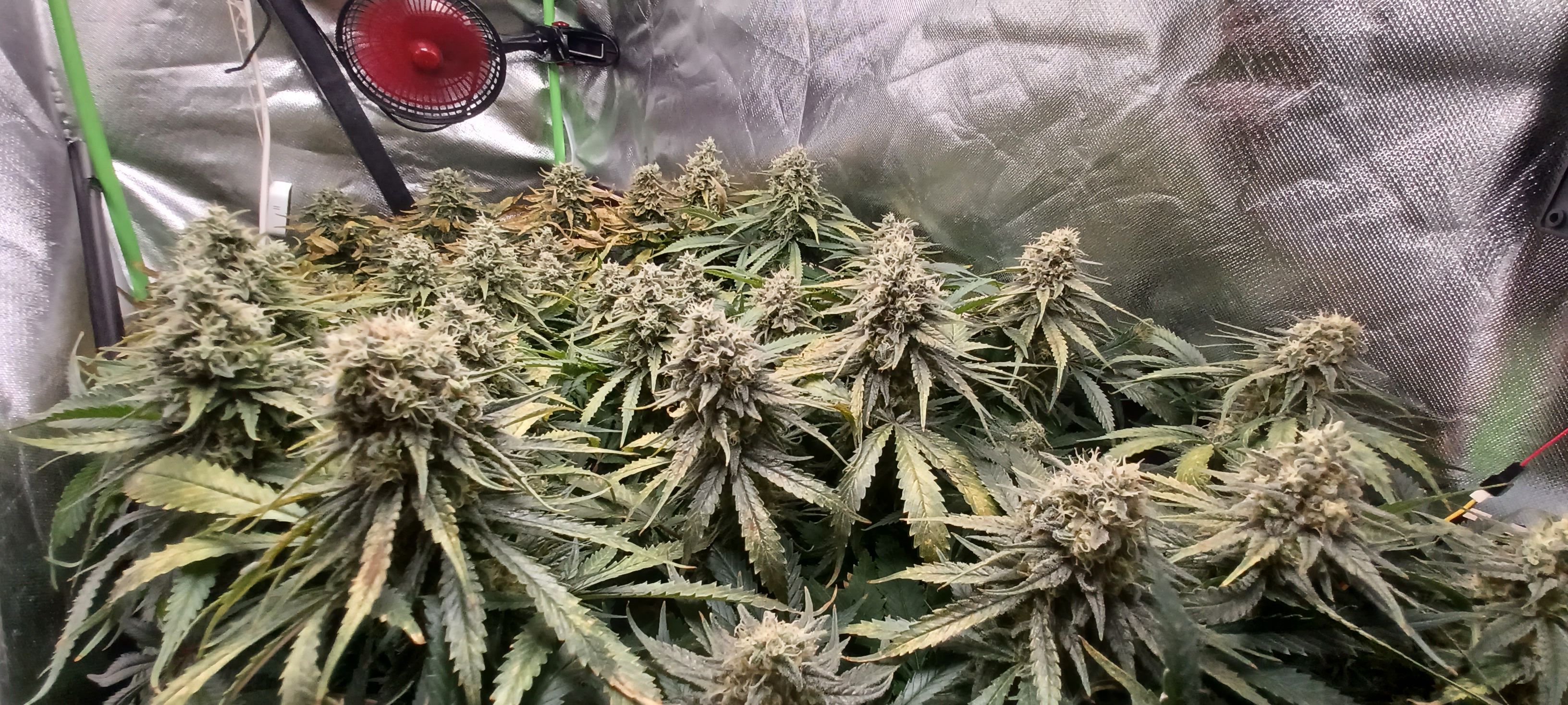 Moin. An Tag 82 und eben wurde gegossen. Je Pflanze 3L BB 9. Woche 100% Grow, Bloom, Top Max, 5ml/l Emiko Garten- und Bodenaktivator. Der Salat sieht nicht frisch aus und erinnert mich an outdoor getue . Im Nachhinein sehe ich über die letzten Wochen bei meinem Gießverhalten und den eher niedrigen Temperaturen die Fehlerquellen. Wahrscheinlich ist das Substrat übersalzen oder der PH verzockt. Irgendwie sowas. Habe auch nie wirklich gegengesteuert sonder gebe stur allen Damen die gleiche Nährstofflösung nach Schema. Obwohl sich ganz links bei der Pflanze die eher kleiner ist schon früh die ersten defizite erkennen liessen. Nach den 3 bis 4 Tagen mit 14 Grad im Zelt hatte ich auch eingesehen dass ich ein wenig die Kontrolle verloren hatte. Bin trotzdem zufrieden mit allem und die Erfahrung ist doch wertvoll und beim nächsten mal wirds anders ablaufen. Bin jetzt seit 7 Wochen auf 12/12 und 6 Wochen seit den ersten Blütenansätzen. Hatte jetzt grob angepeilt in einer Woche mit dem düngen aufzuhören!?