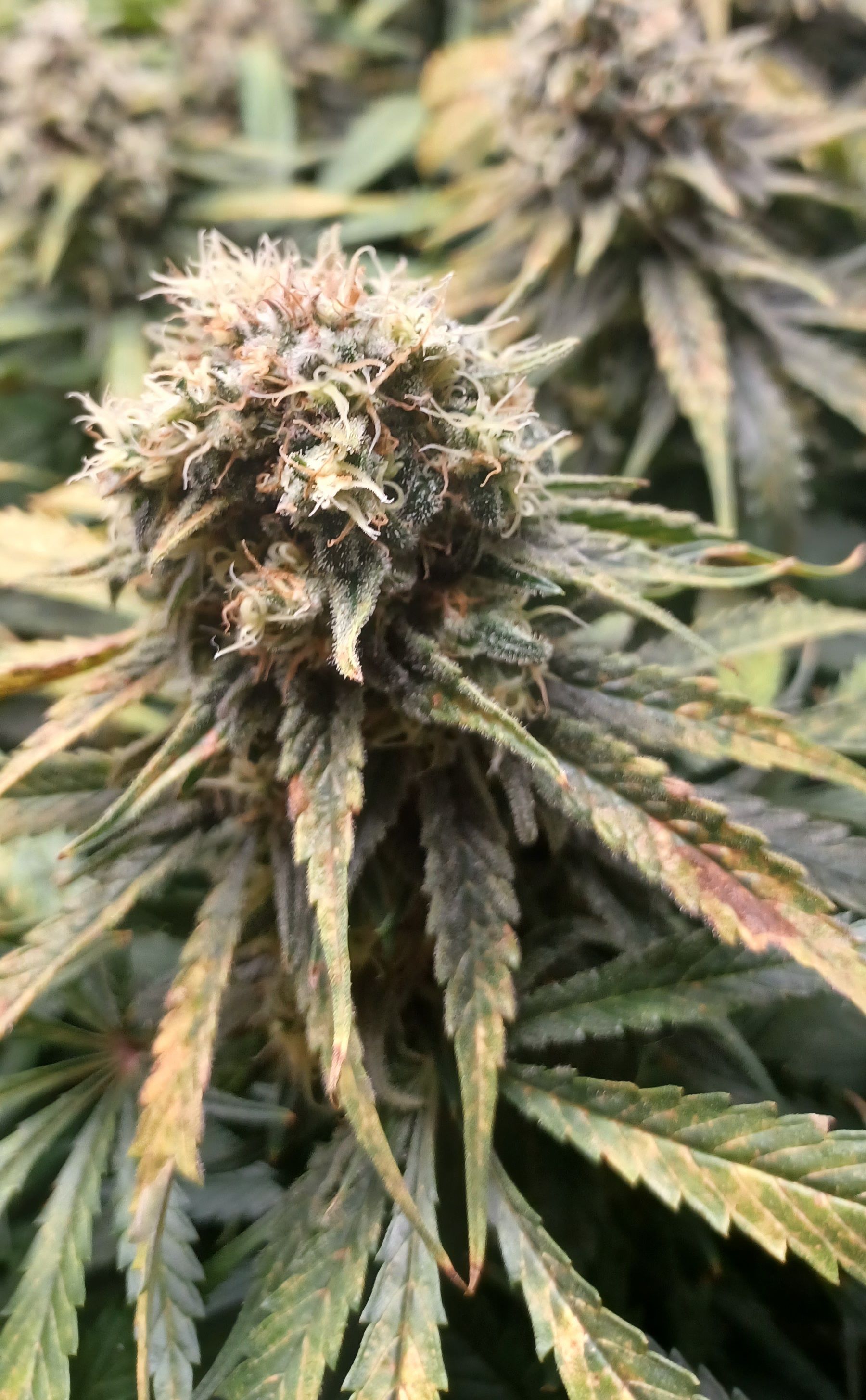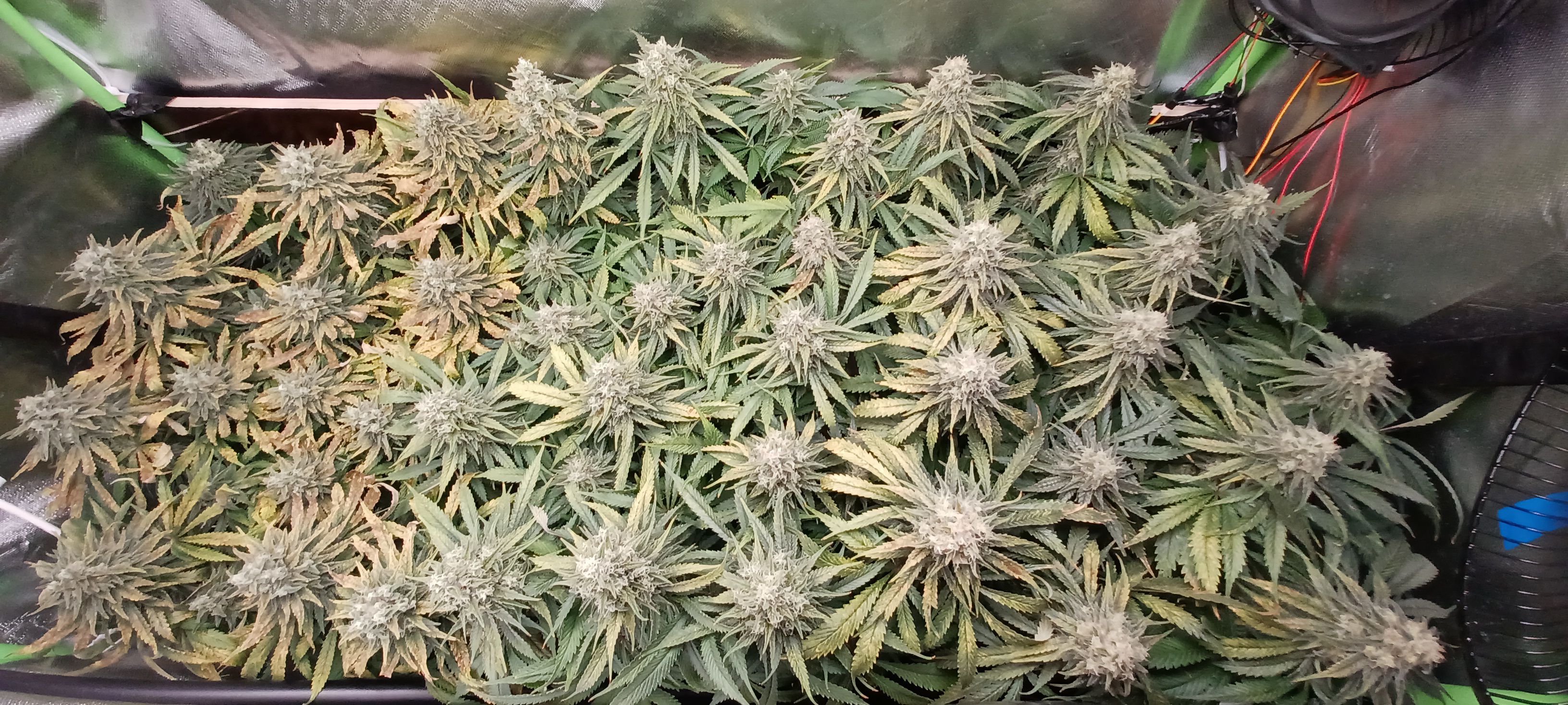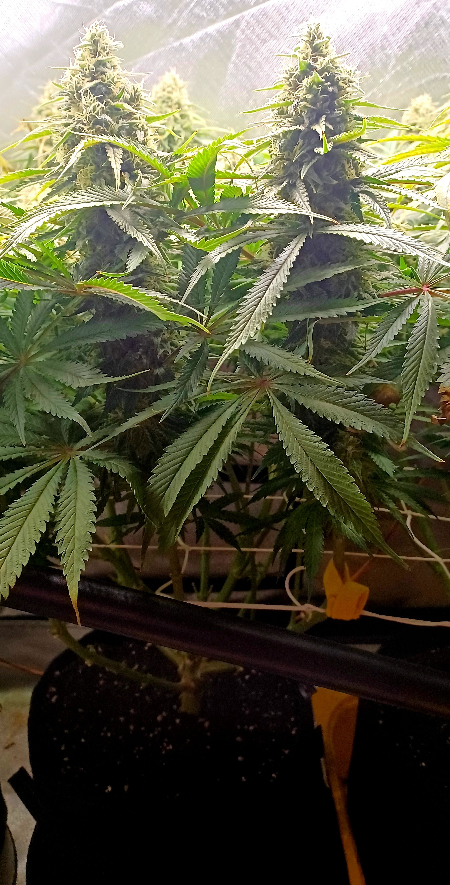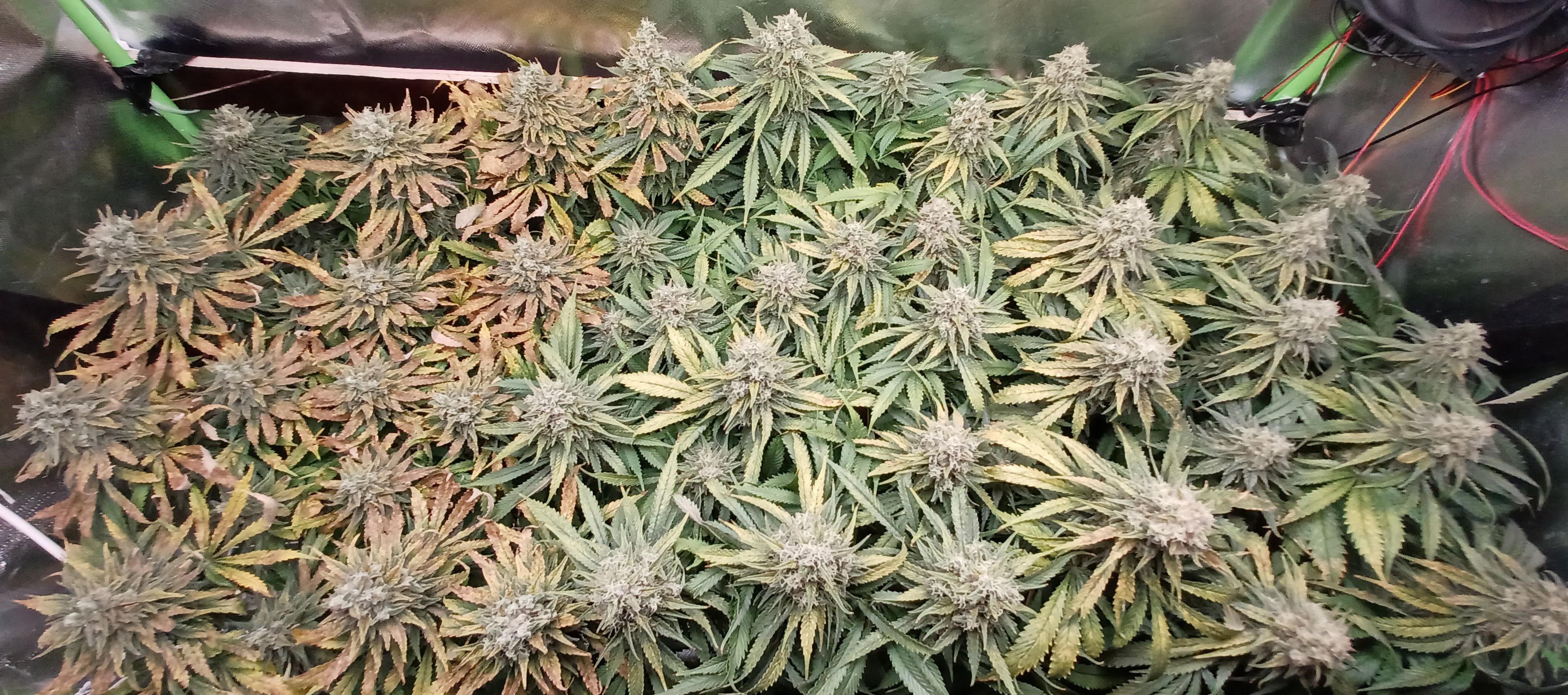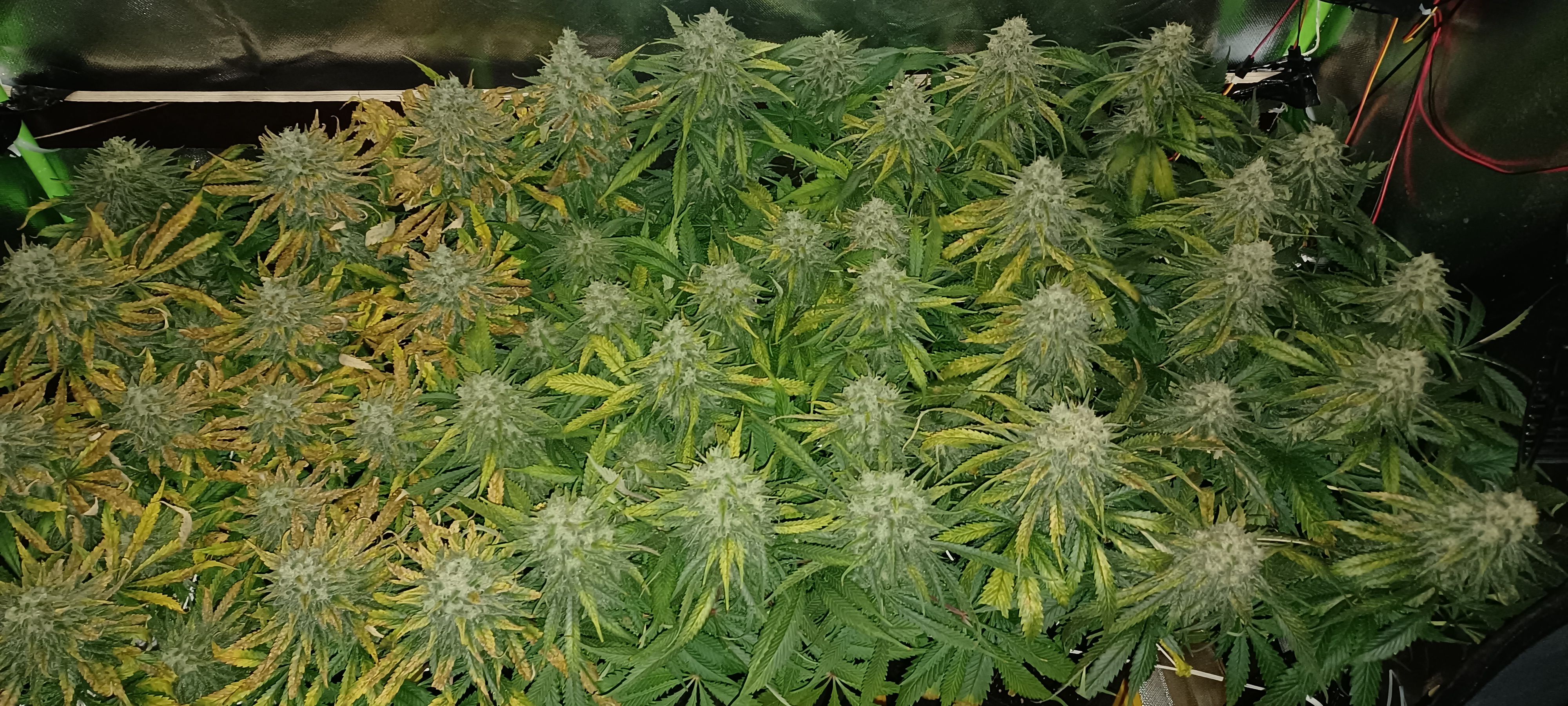 Moin. An Tag 82 und eben wurde gegossen. Je Pflanze 3L BB 9. Woche 100% Grow, Bloom, Top Max, 5ml/l Emiko Garten- und Bodenaktivator. Der Salat sieht nicht frisch aus und erinnert mich an outdoor getue . Im Nachhinein sehe ich über die letzten Wochen bei meinem Gießverhalten und den eher niedrigen Temperaturen die Fehlerquellen. Wahrscheinlich ist das Substrat übersalzen oder der PH verzockt. Irgendwie sowas. Habe auch nie wirklich gegengesteuert sonder gebe stur allen Damen die gleiche Nährstofflösung nach Schema. Obwohl sich ganz links bei der Pflanze die eher kleiner ist schon früh die ersten defizite erkennen liessen. Nach den 3 bis 4 Tagen mit 14 Grad im Zelt hatte ich auch eingesehen dass ich ein wenig die Kontrolle verloren hatte. Bin trotzdem zufrieden mit allem und die Erfahrung ist doch wertvoll und beim nächsten mal wirds anders ablaufen. Bin jetzt seit 7 Wochen auf 12/12 und 6 Wochen seit den ersten Blütenansätzen. Hatte jetzt grob angepeilt in einer Woche mit dem düngen aufzuhören!?