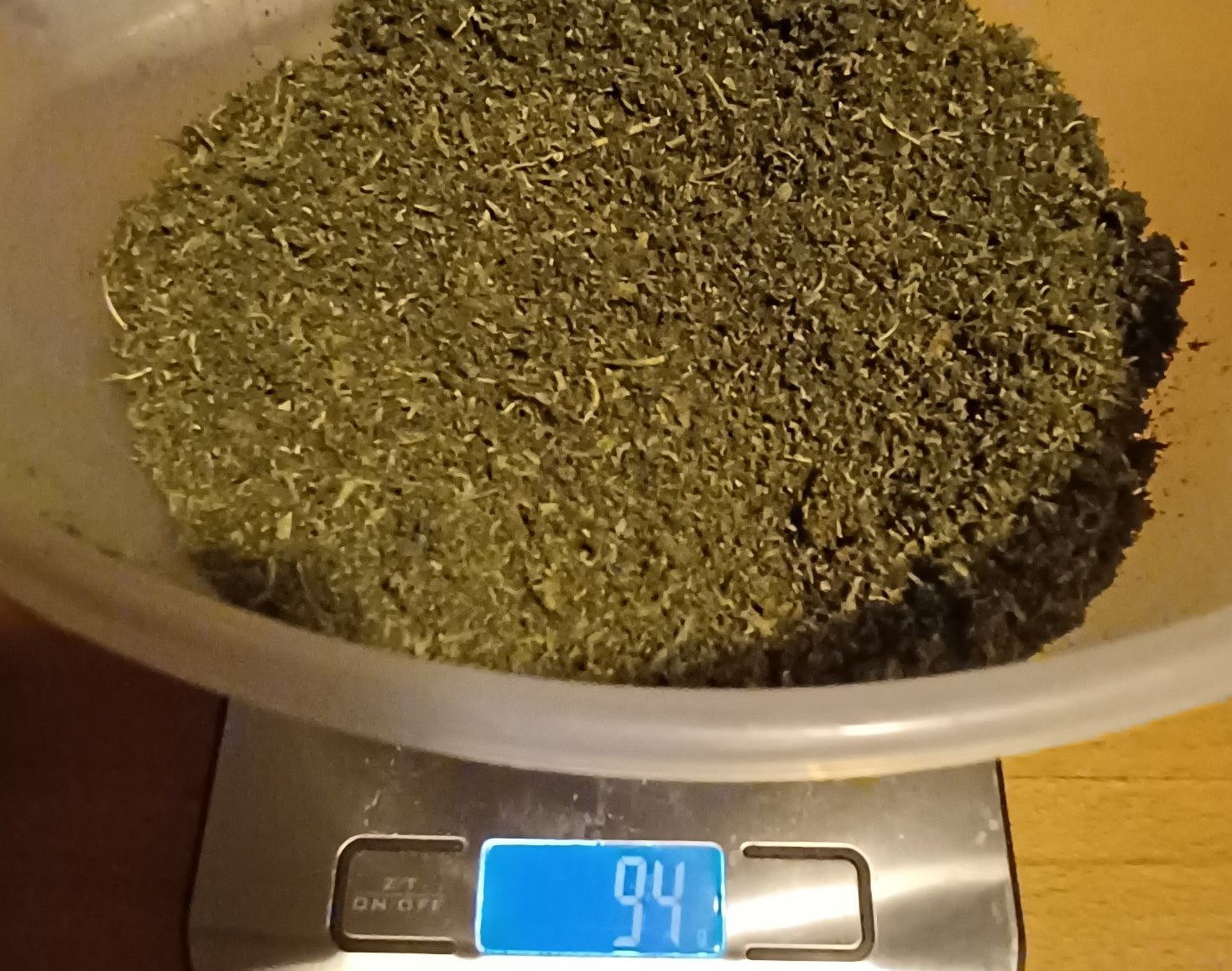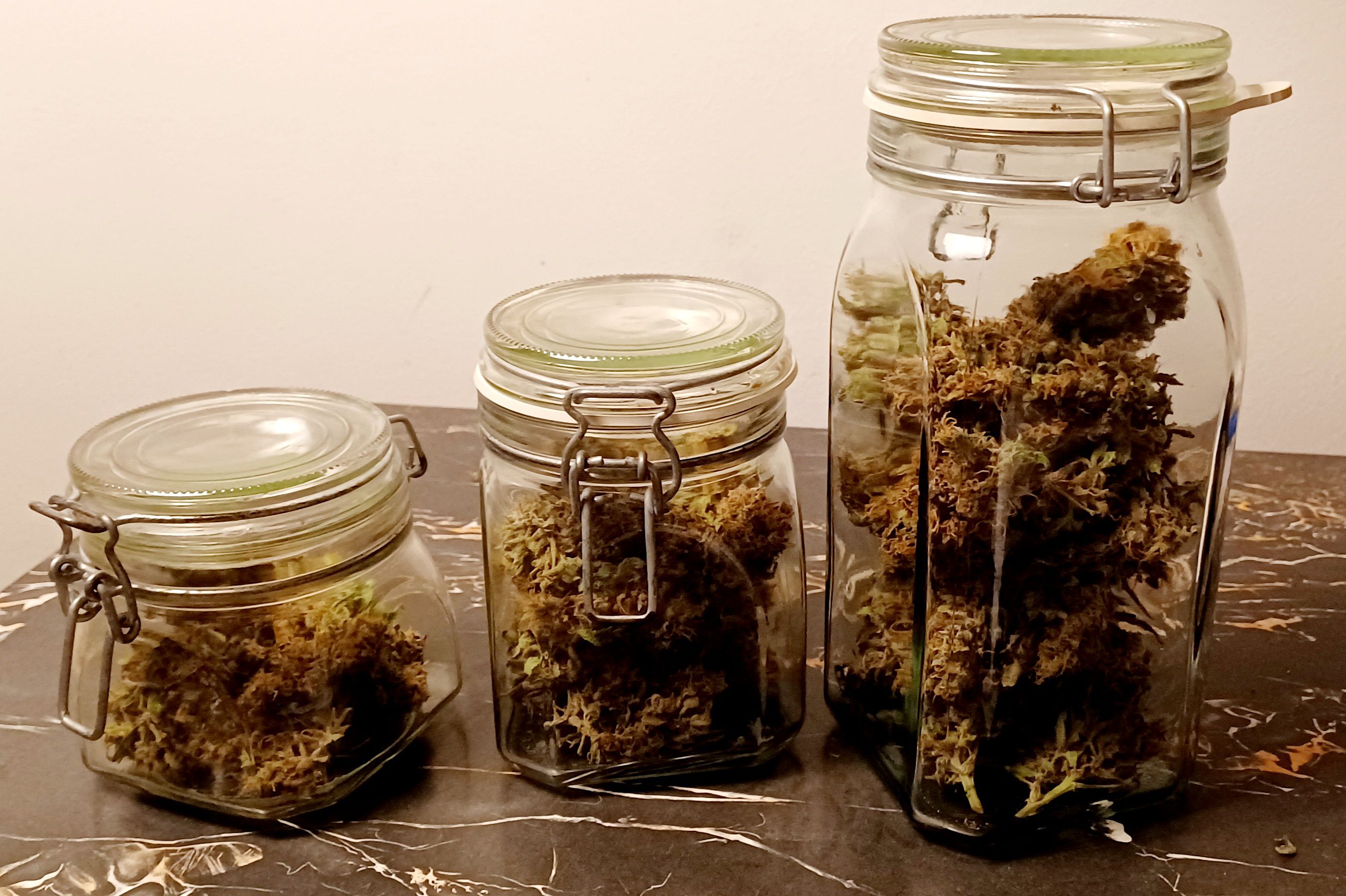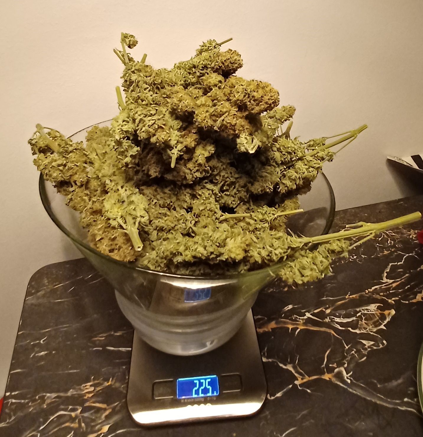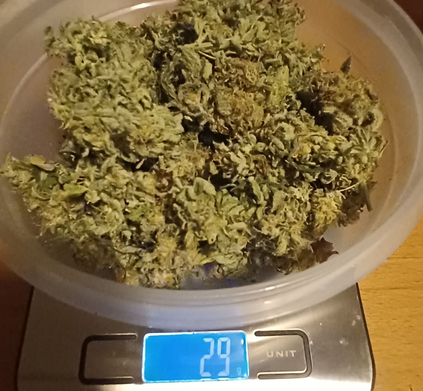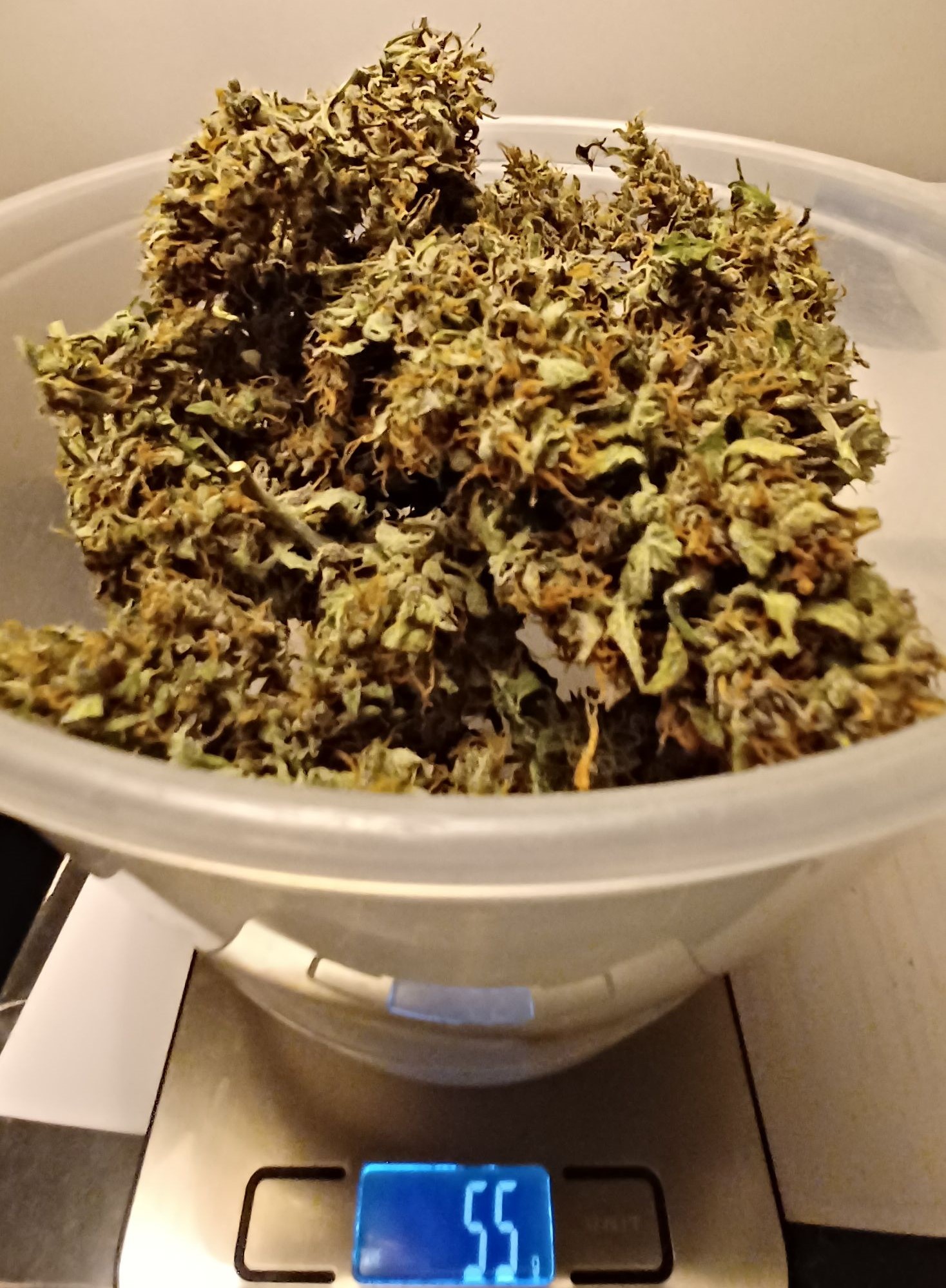 Die Zkittlez hat mir ca. 60 gr. Trocken gegeben (Foto mit Waage entstand nach den ersten Pur-Bongs und Joints). Da eher fluffig wurde es ca. 9 Tage getrocknet und ist jetzt in Gläsern. Ist aber glaube ich zu schnell getrocknet da die RLF zwar die ersten 3 Tage bei 50 stand, dann aber richtung 40 runter ist. Das mit dem Trocknen will ich beim Hauptgrow besser kontrollieren. Zkittlez schmeckt lecker, ist sehr harzig und hat eine zitrus-Note die vorallem im Vape richtig schmeckbar ist (schwierig zu beschreiben). Bong mit Zkittlez kratz schon und wird ein wenig heiß im Rachen . Homegrown halt . Wirkung ist genau richtig um noch was zu erledigen und man kann es auch morgens rauchen ohne ein Zombie zu werden