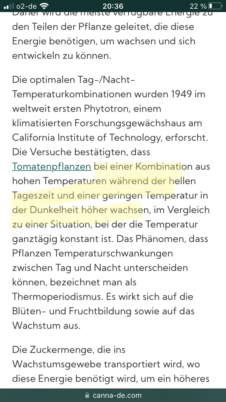 Dann gibt es noch wissenschaftliche Erkenntnisse, dass höhere Temperaturunterschiede zwischen Tag und Nacht die Streckung anregen bzw. gleiche Temperaturen die Pflanzen kleiner wachsen lässt. Wurde an Tomaten erforscht, ob Cannabis da genau so reagiert kann ich nicht sagen.