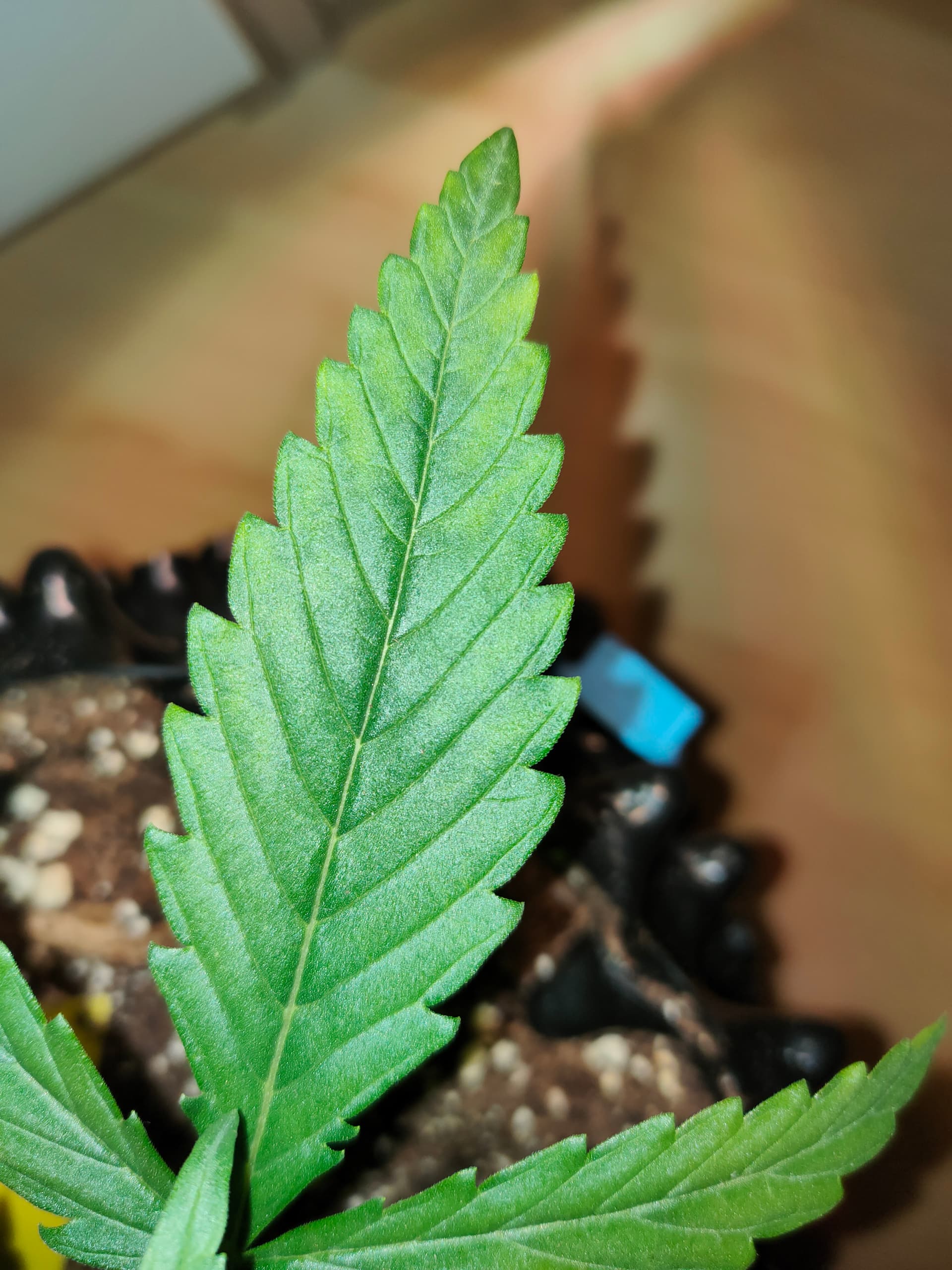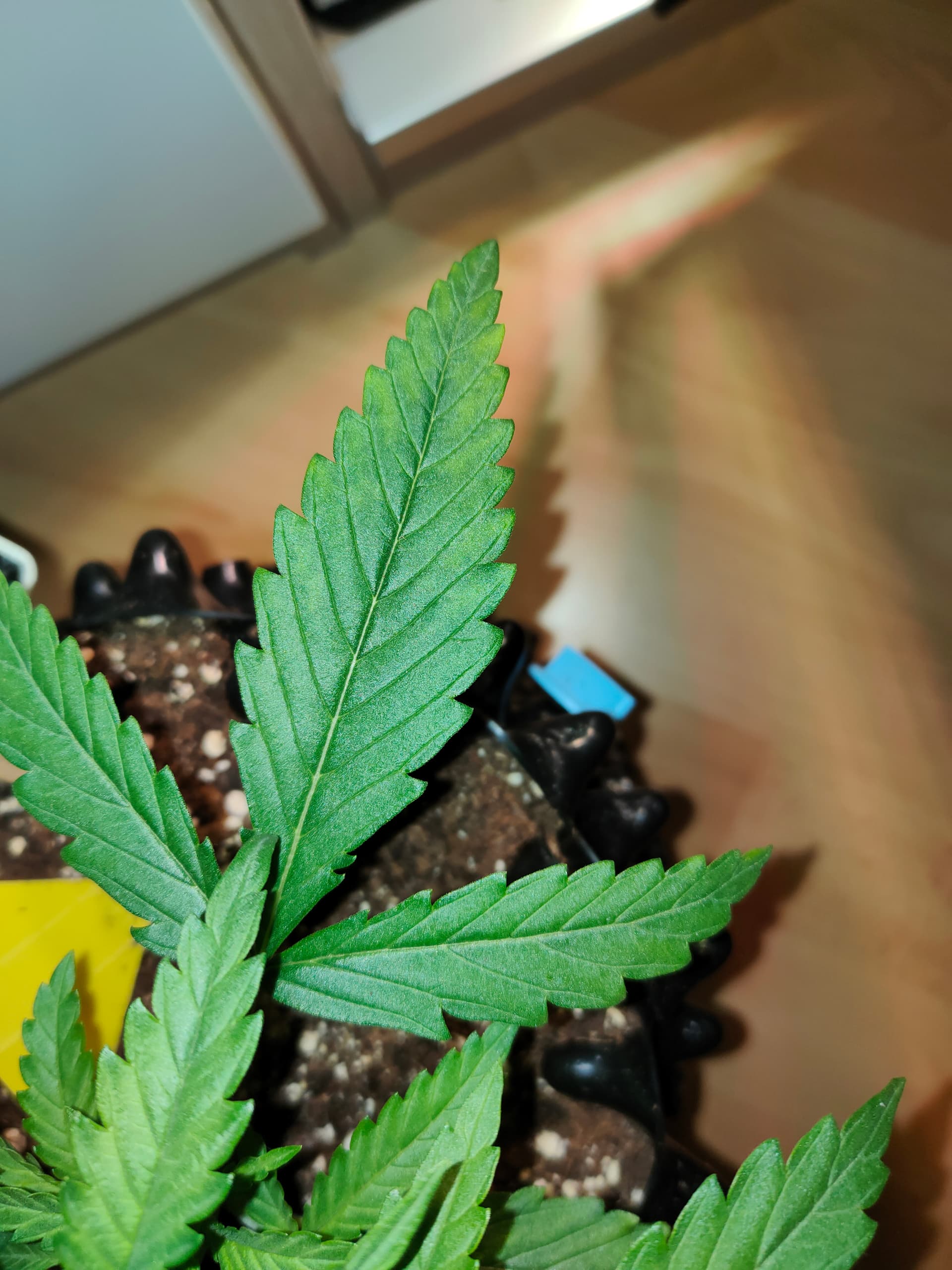 Die Blätter der Gorilla Blue haben noch etwas mehr Flecken bekommen, ich hoffe, dass sich das Problem nach der angepassten Menge an CalMag nicht noch weiter ausbreitet.