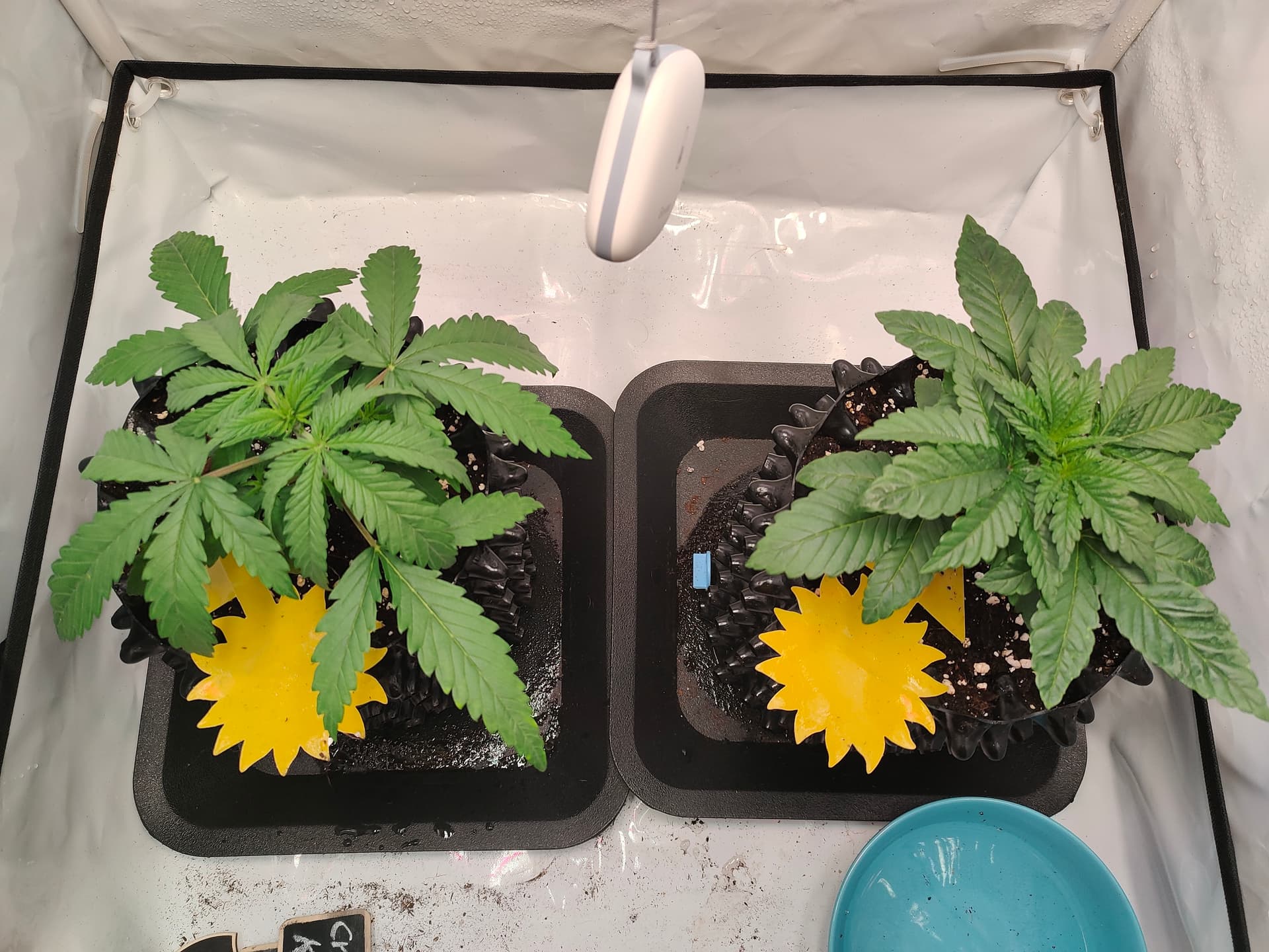 Beim letzten Gießen haben sie beide jeweils ca. 600 ml bekommen, ich hatte eine Nährlösung von insgesamt 1,2 l angeschmischt mit 0,3 ml CalMag, 2 ml Bio Heaven und 4 ml Root Juice, also ganz nach dem BB Dünger (bin ja noch in Woche 1).