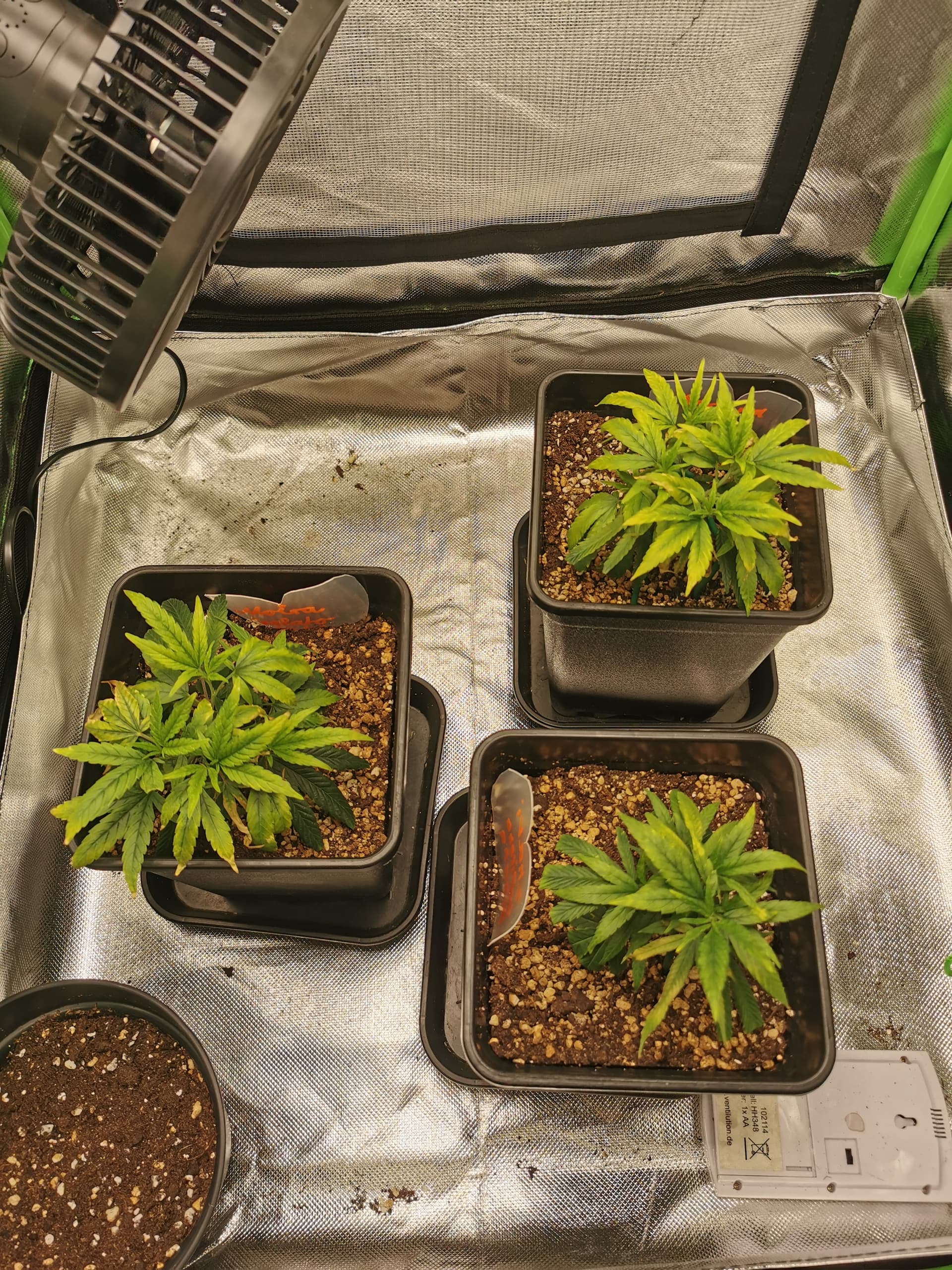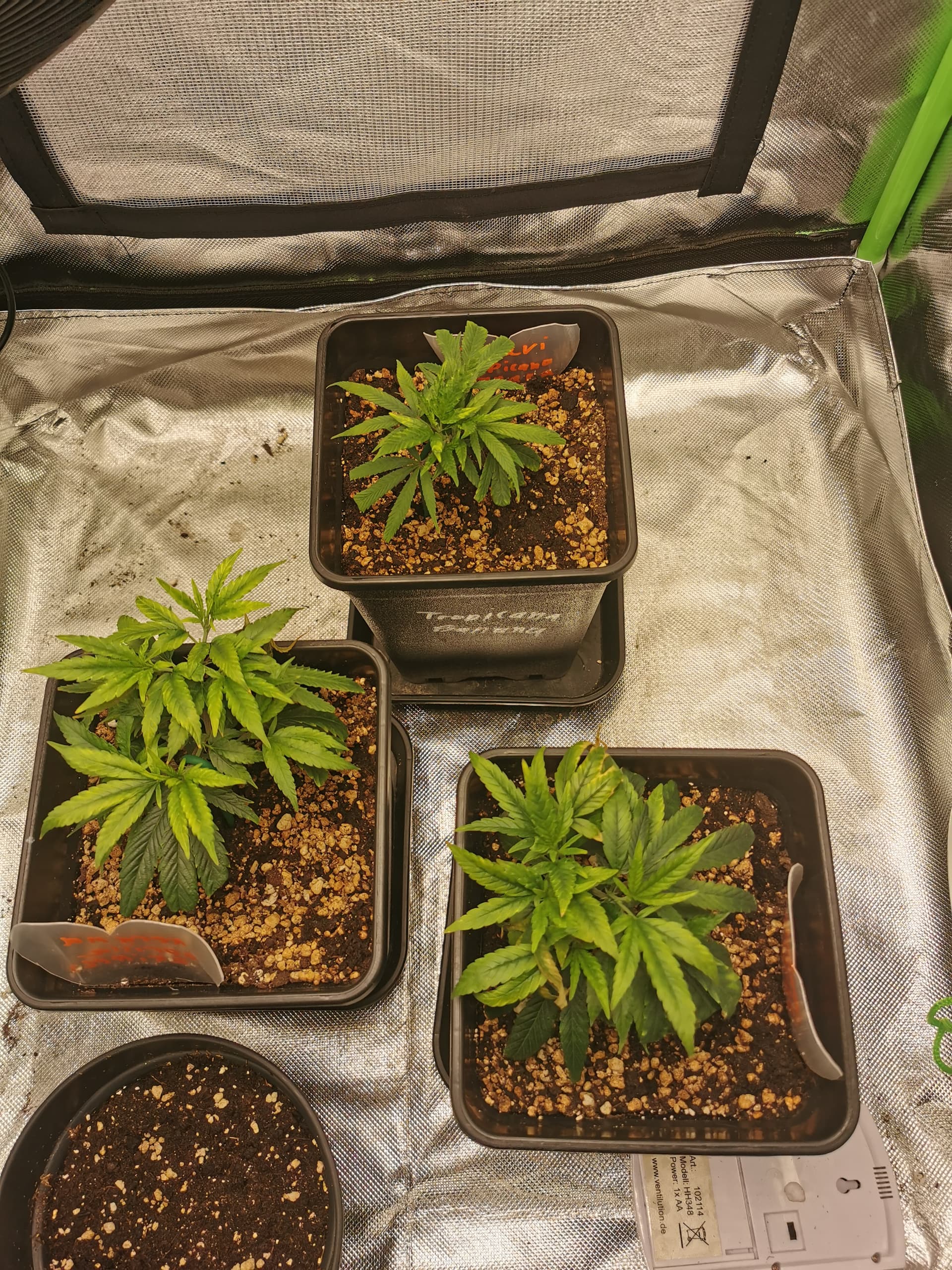 Ist etwas weniger als die 1/3 Regel, aber es wird mir sonst zu Nass im Topf und Wurzeln müssen sie ohnehin erstmal noch wachsen lassen. Dünger gibt es erstmal keinen, da tut es der frische LightMix.