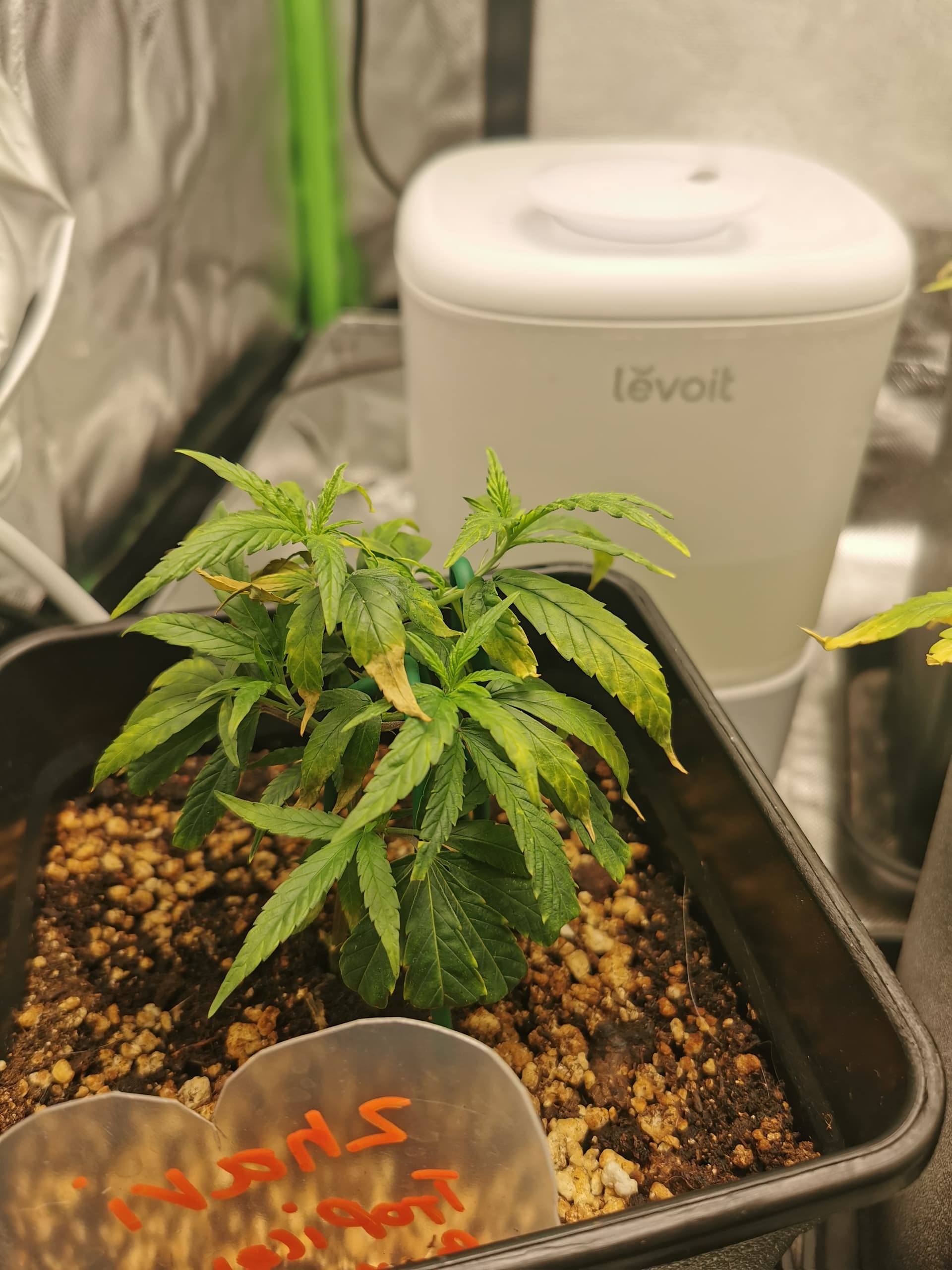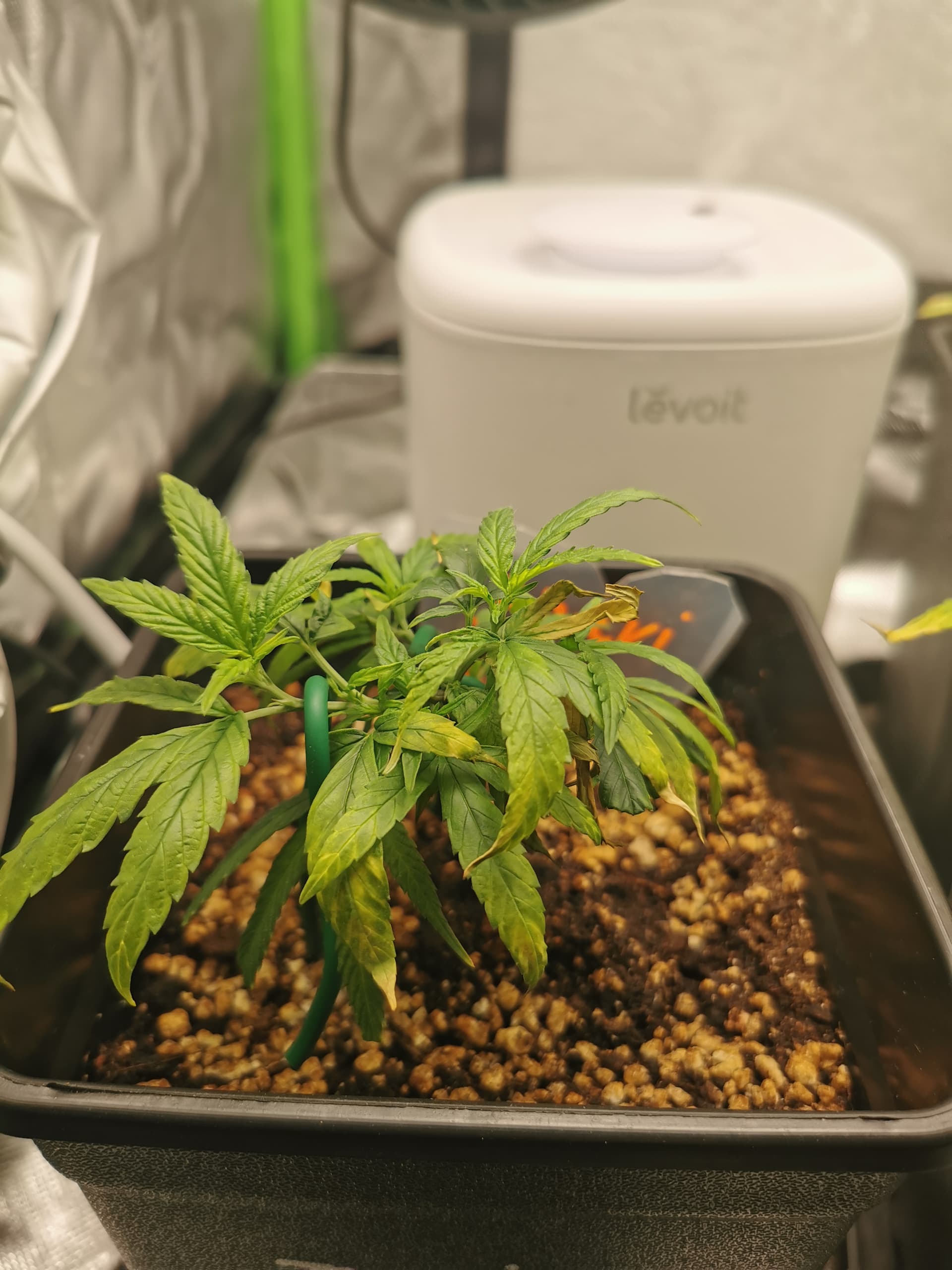 Nachdem gießen am Samstag(je 750ml mit Calmag angepasst, 100%activera/heaven, 75% Bio-grow) keine Verbesserung gebracht hat, hab ich am Sonntag den Luftbefeuchter wieder ins Zelt gestellt.