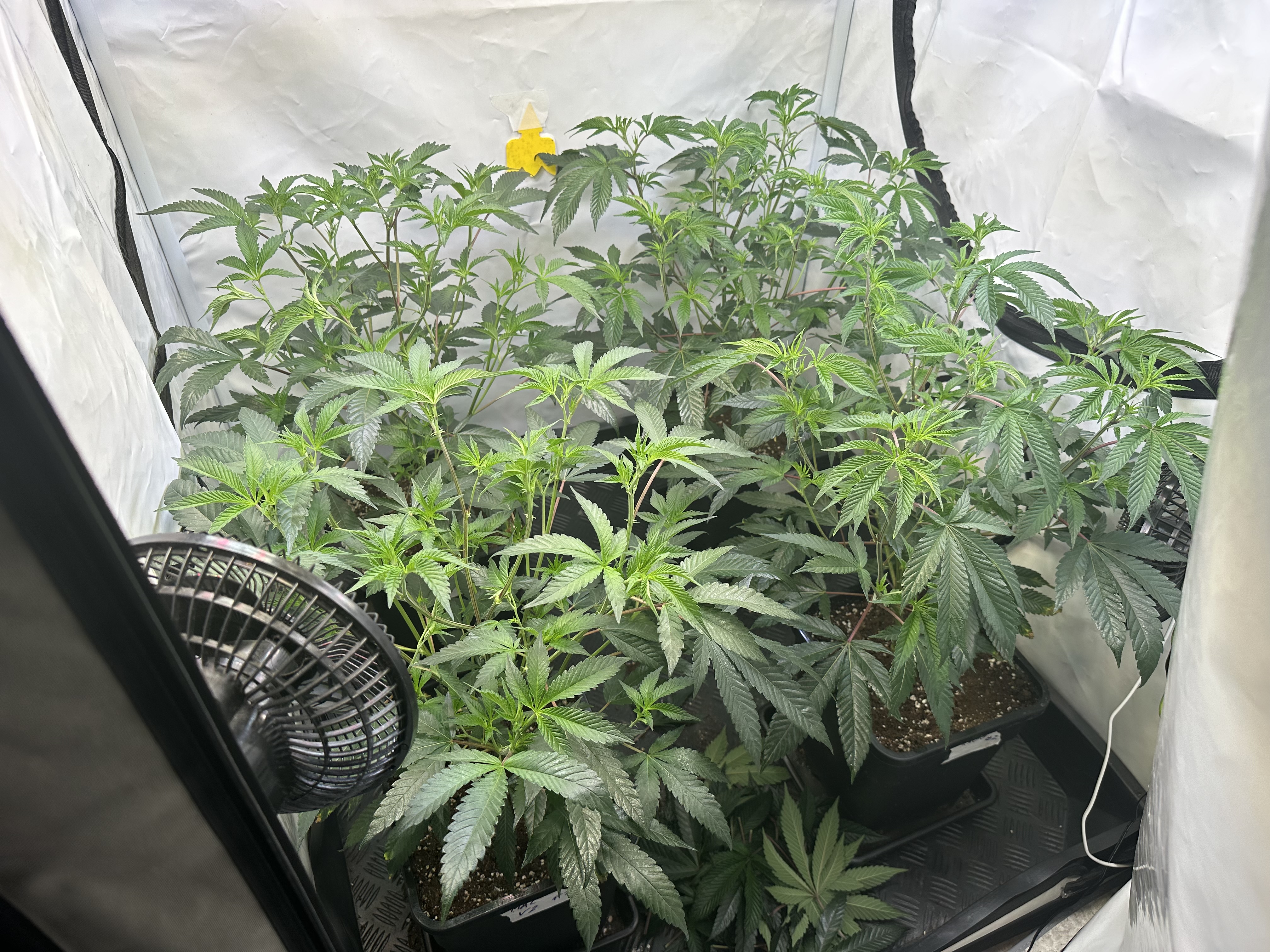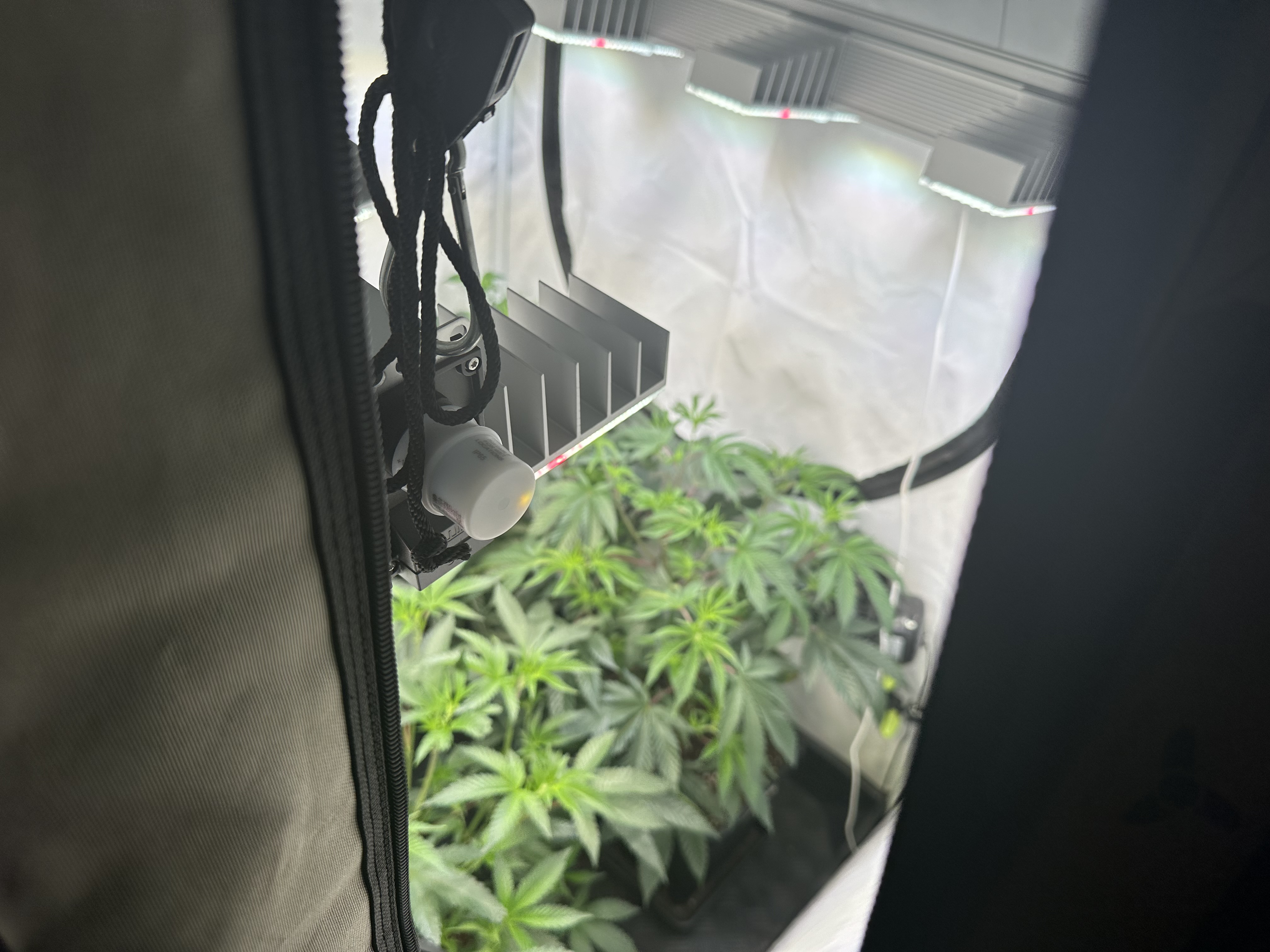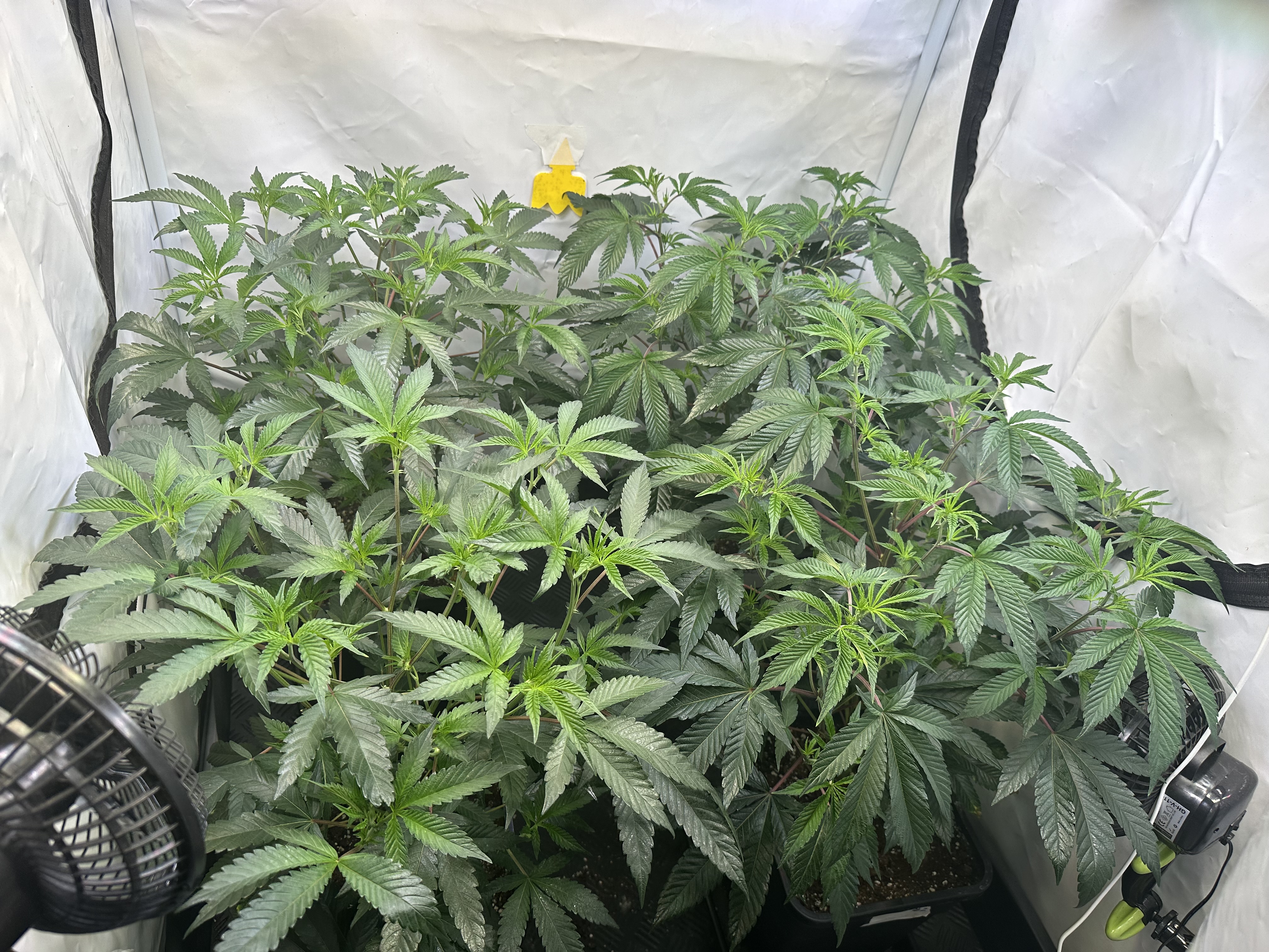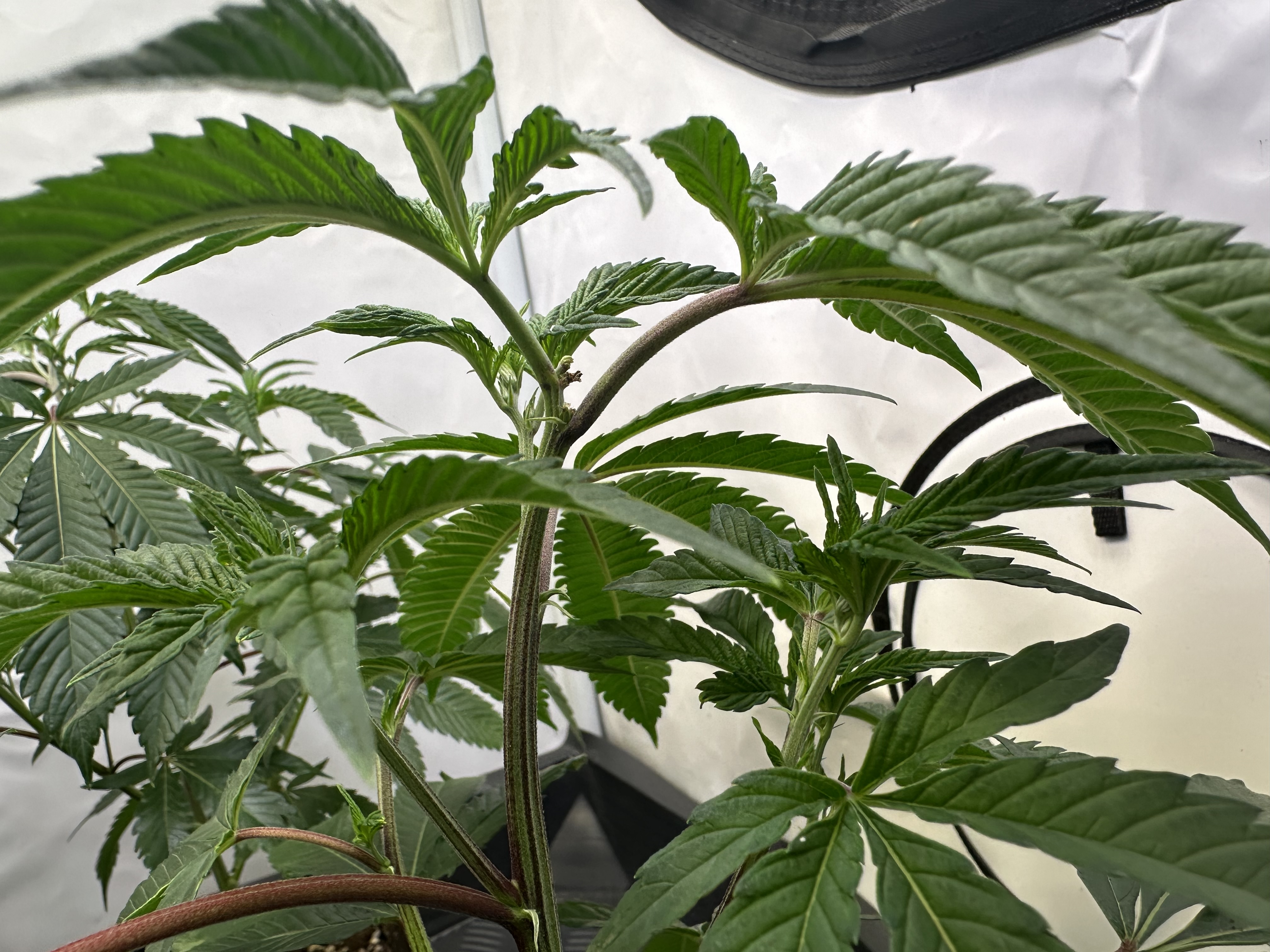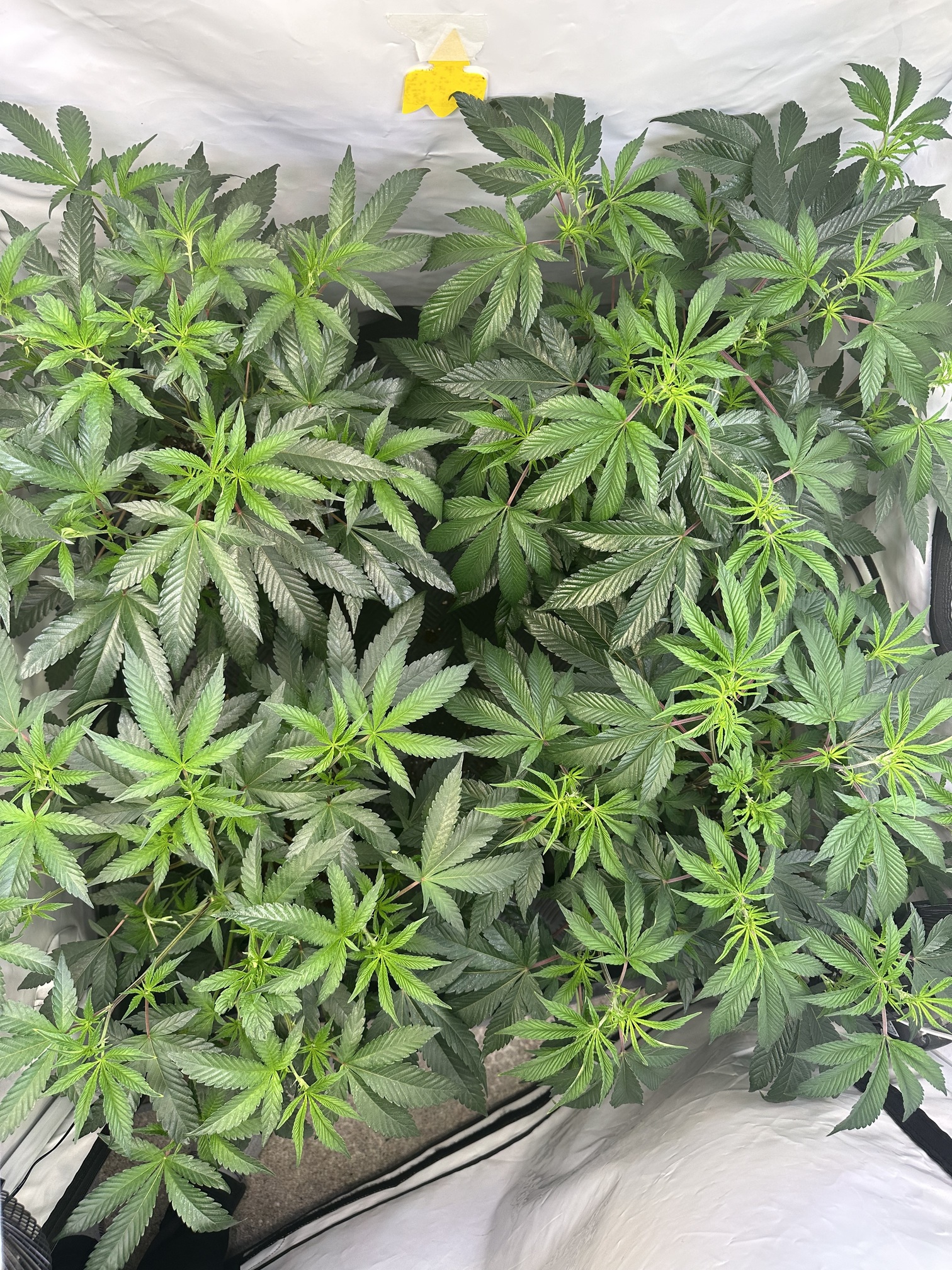 heute Morgen wurde außerplanmäßig das Zelt geöffnet. Die Neugier hat mich irgendwie dazu getrieben. Schatten war es, was ich als erstes bemerkte der von den oberen Blättern auf die unteren Triebe geworfen wurde. Das kann ja nicht angehen schoss es mit durch den Kopf als ich den Geilwuchs an den unteren Triebe bemerkte.