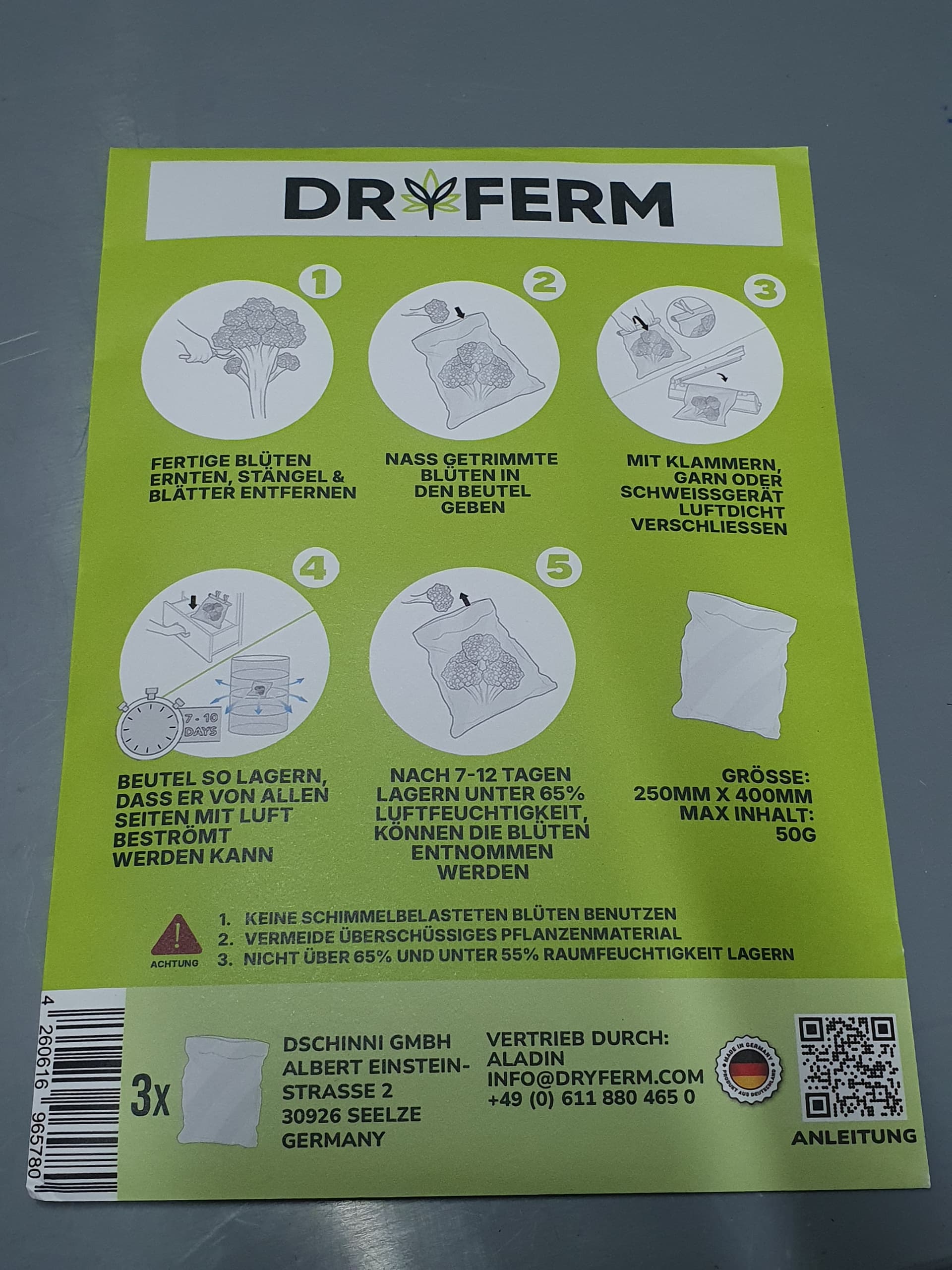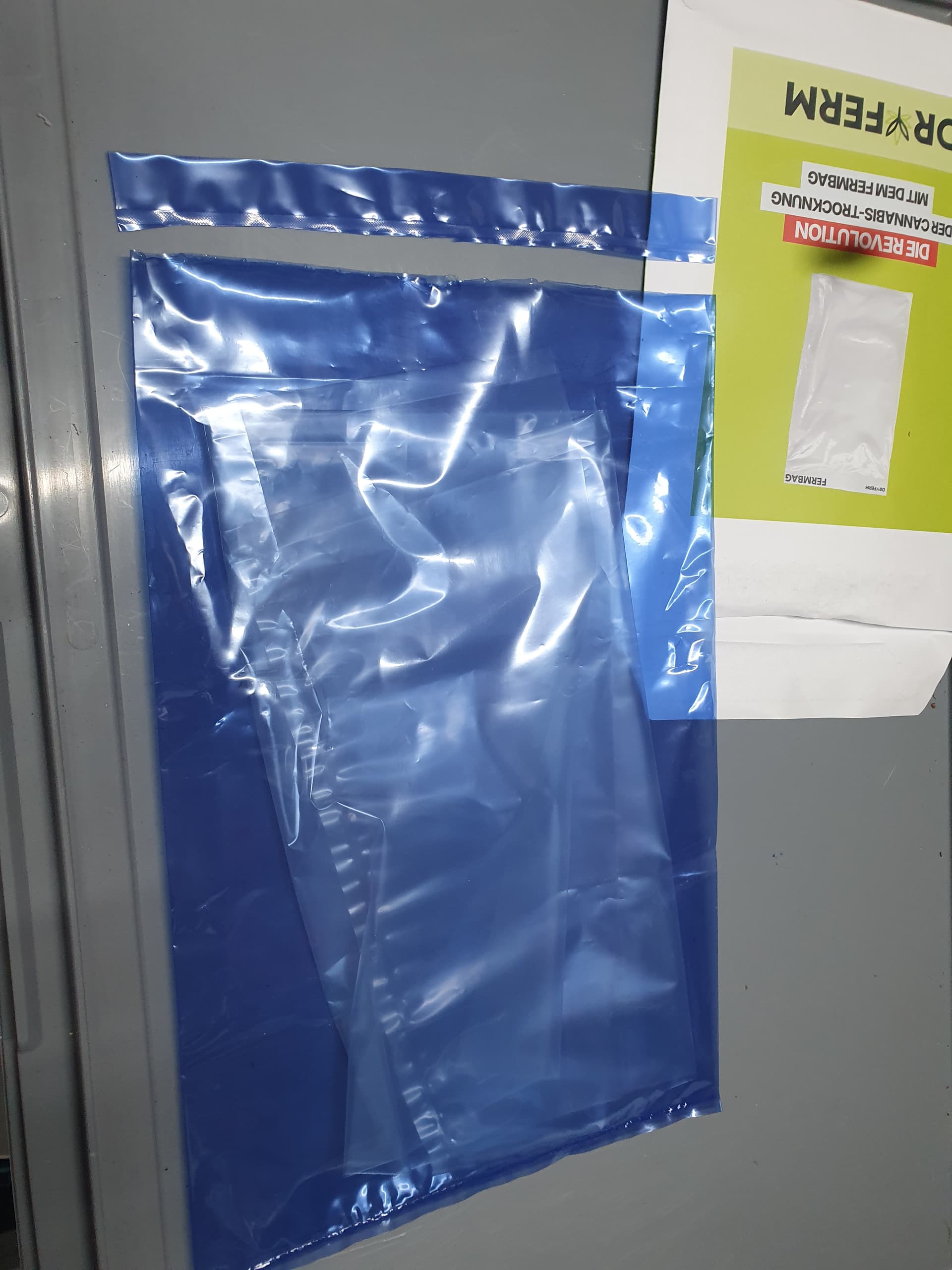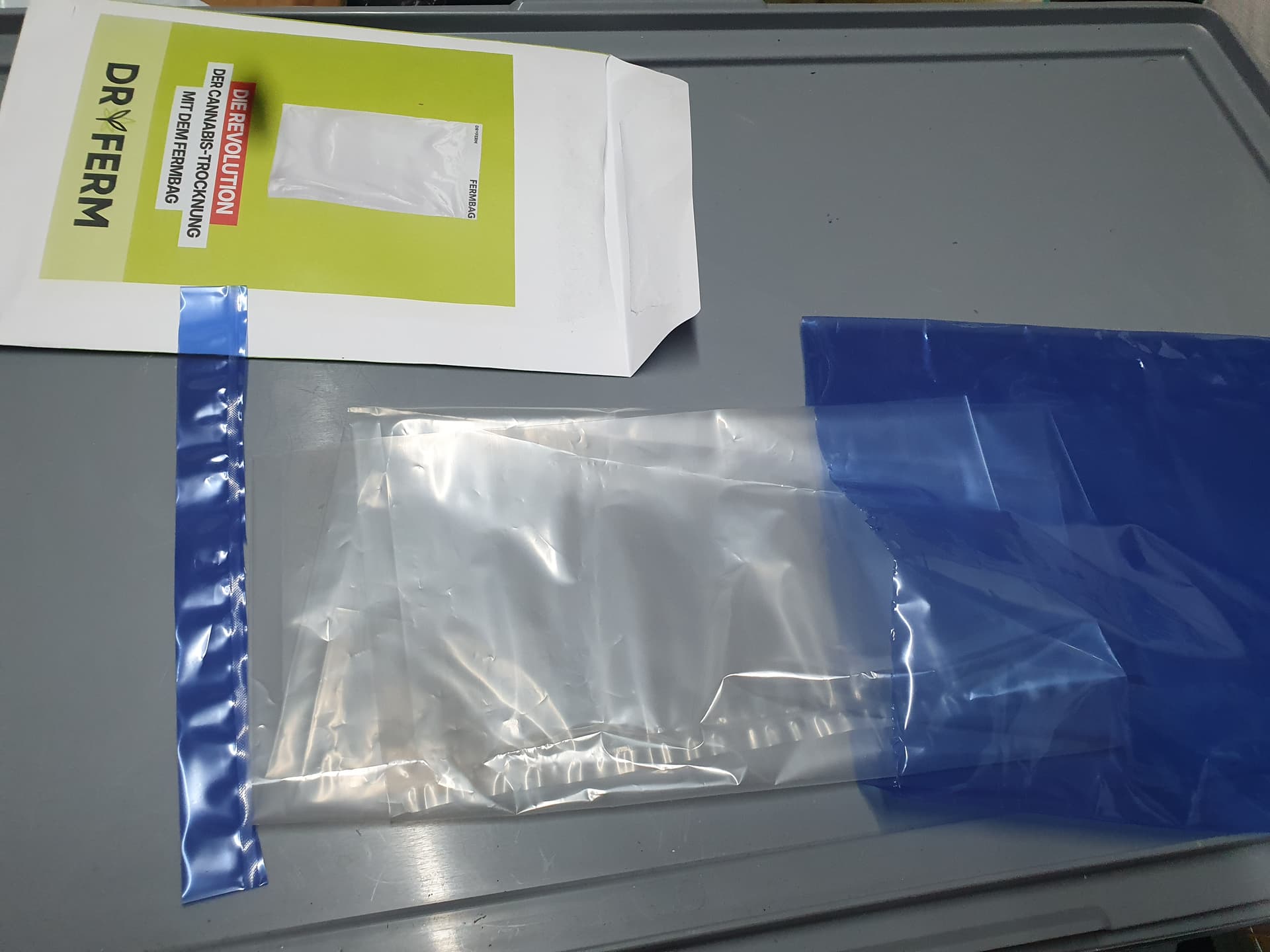 Die drei DryFerm Beutel sind noch einmal extra in einer „blauen“ Plastiktüte verpackt.