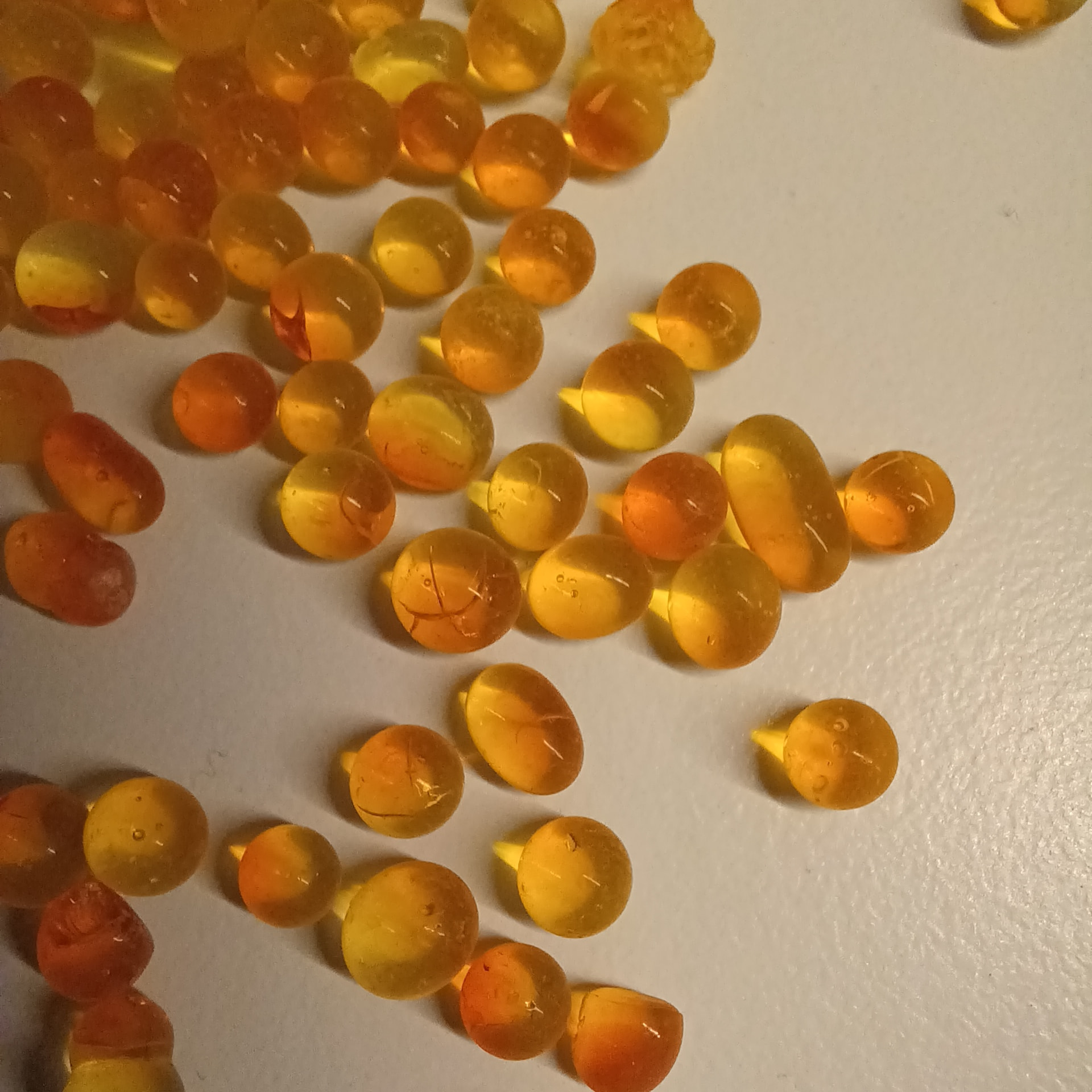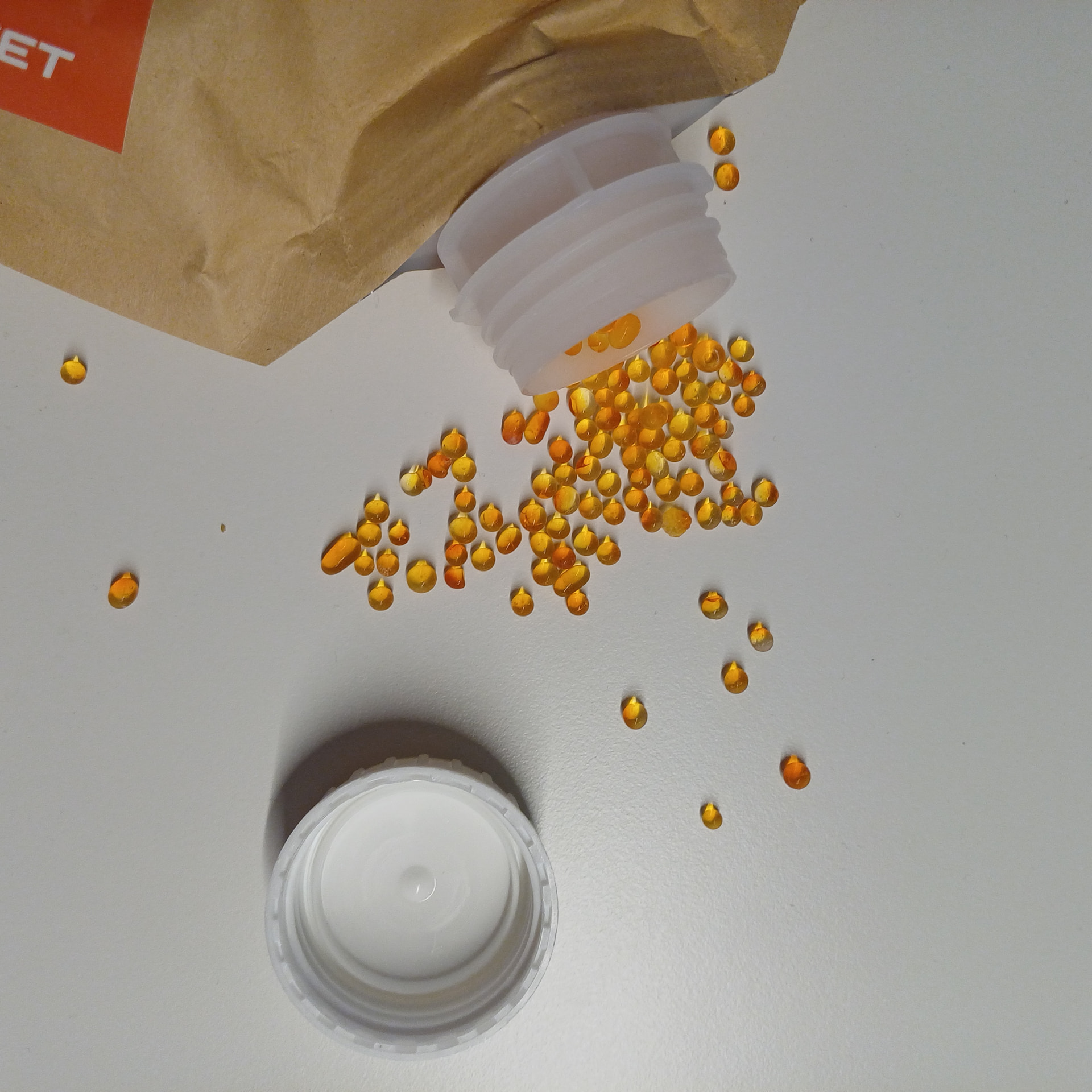 Der Beutel ist luftdicht wiederverschließbar und enthält 3 bis 5mm große, orangene, Kugeln.