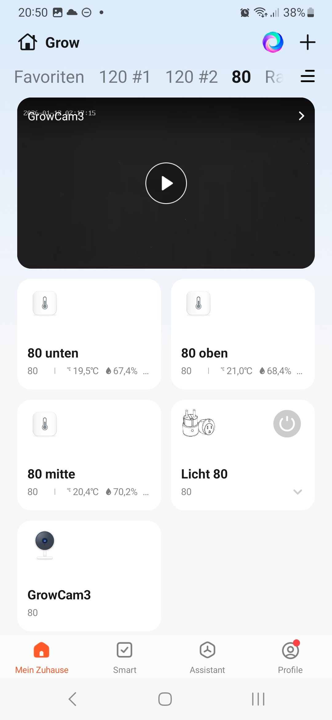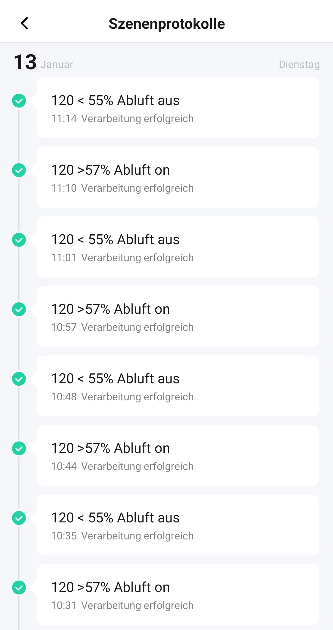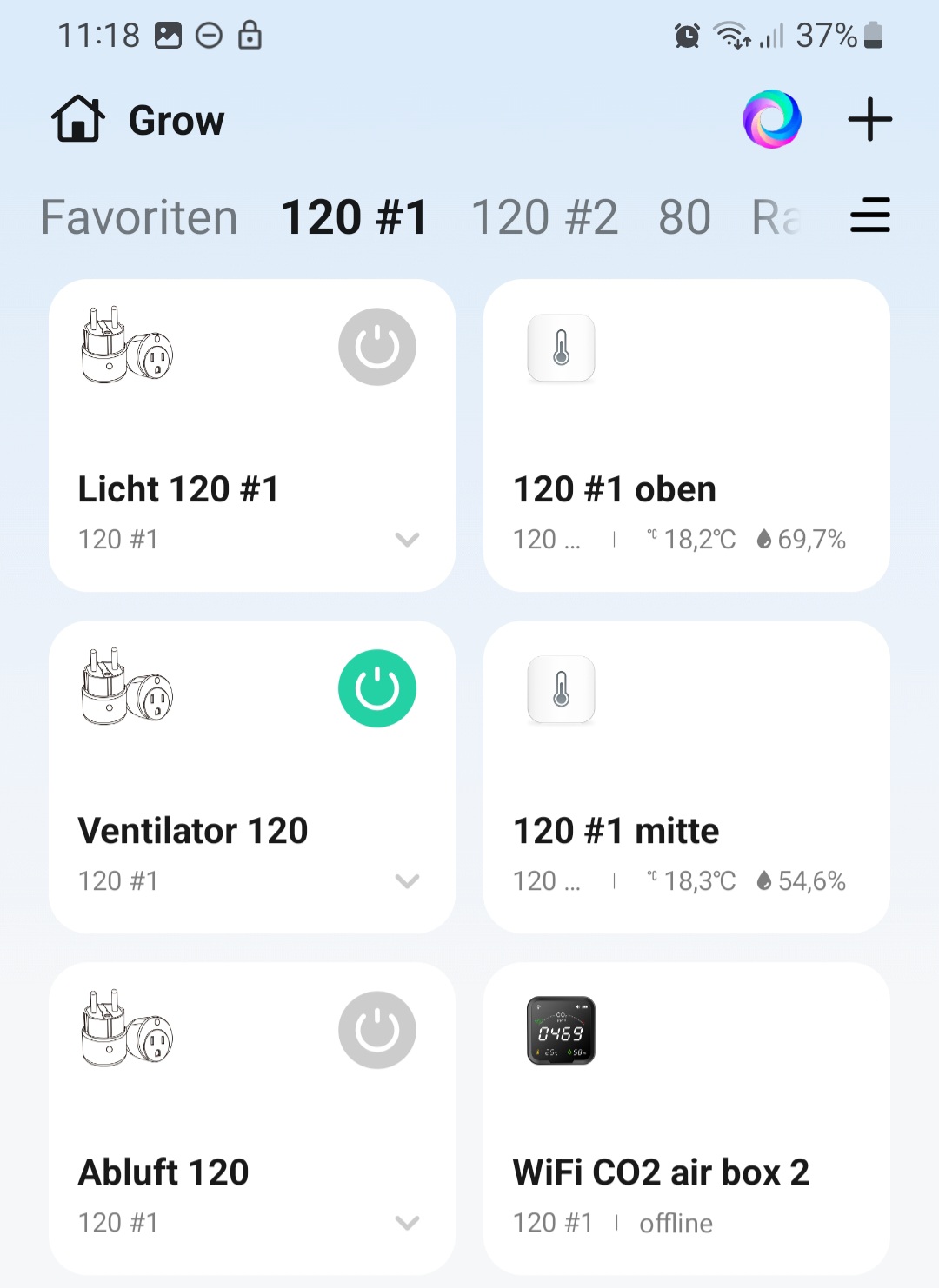 Meine Automatisierungen sind so eingerichtet, dass der LĂŒfter (4 Zoll, Abluft geht nach drauĂen) bei ĂŒber 57% (unterer Sensor) anspringt und bei unter 55% wieder ausschaltet.