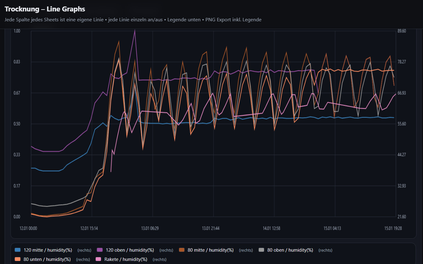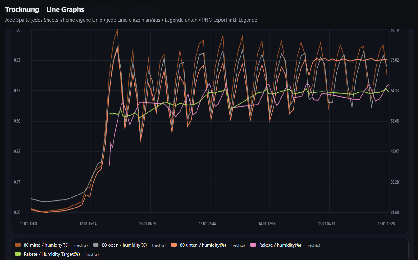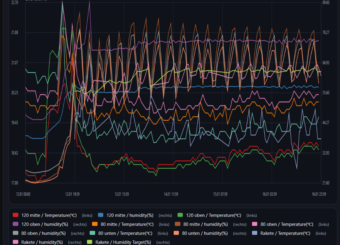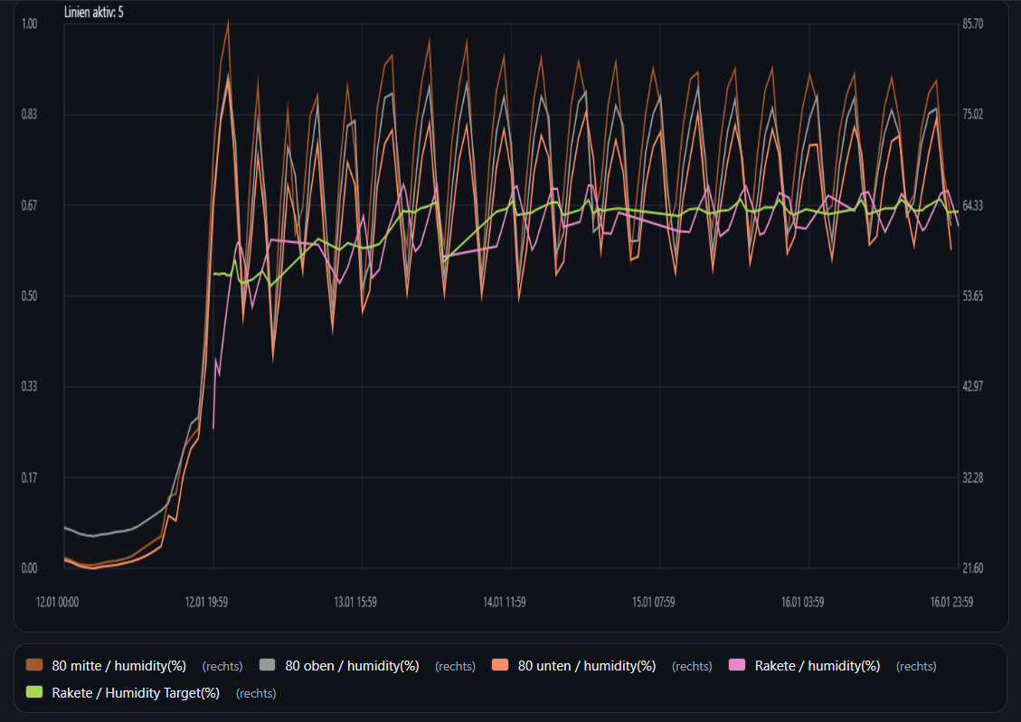 Allerdings ist in den Werten meiner Sensoren im gleichen Zelt zu sehen, dass sich die Werte langsam angleichen und auf etwa 63/64% zusteuern, was auch in etwa den Zielwerten der Rakete (soweit ich das rauslesen kann) entspricht.