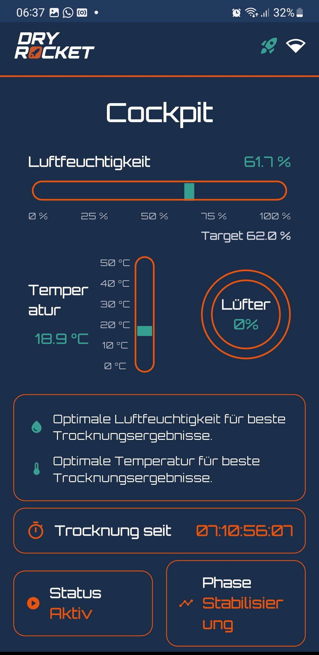 Die DryRocket hat gestern Abend, nach knapp 7 Tagen, den Modus gewechselt.
