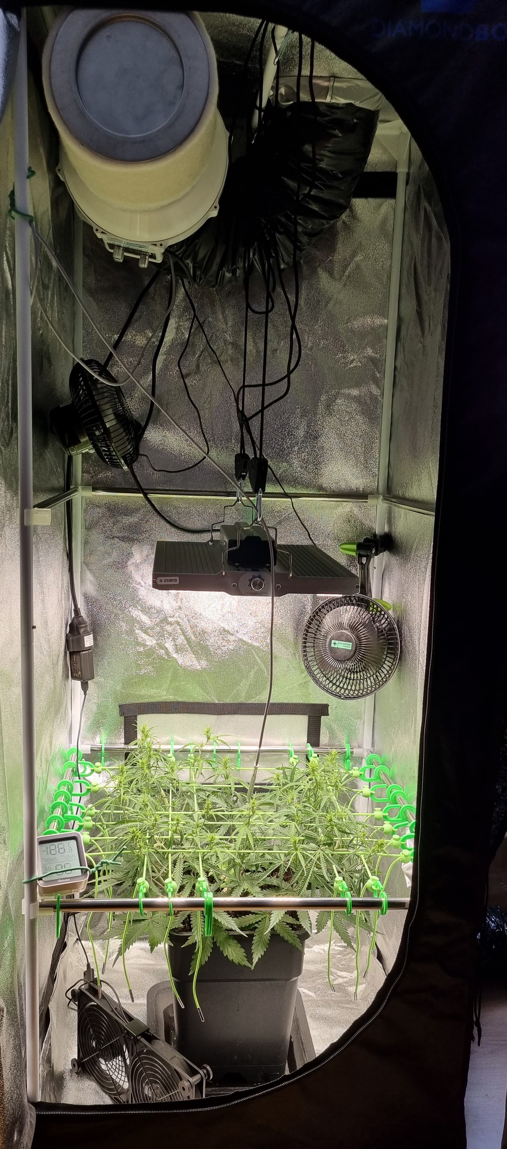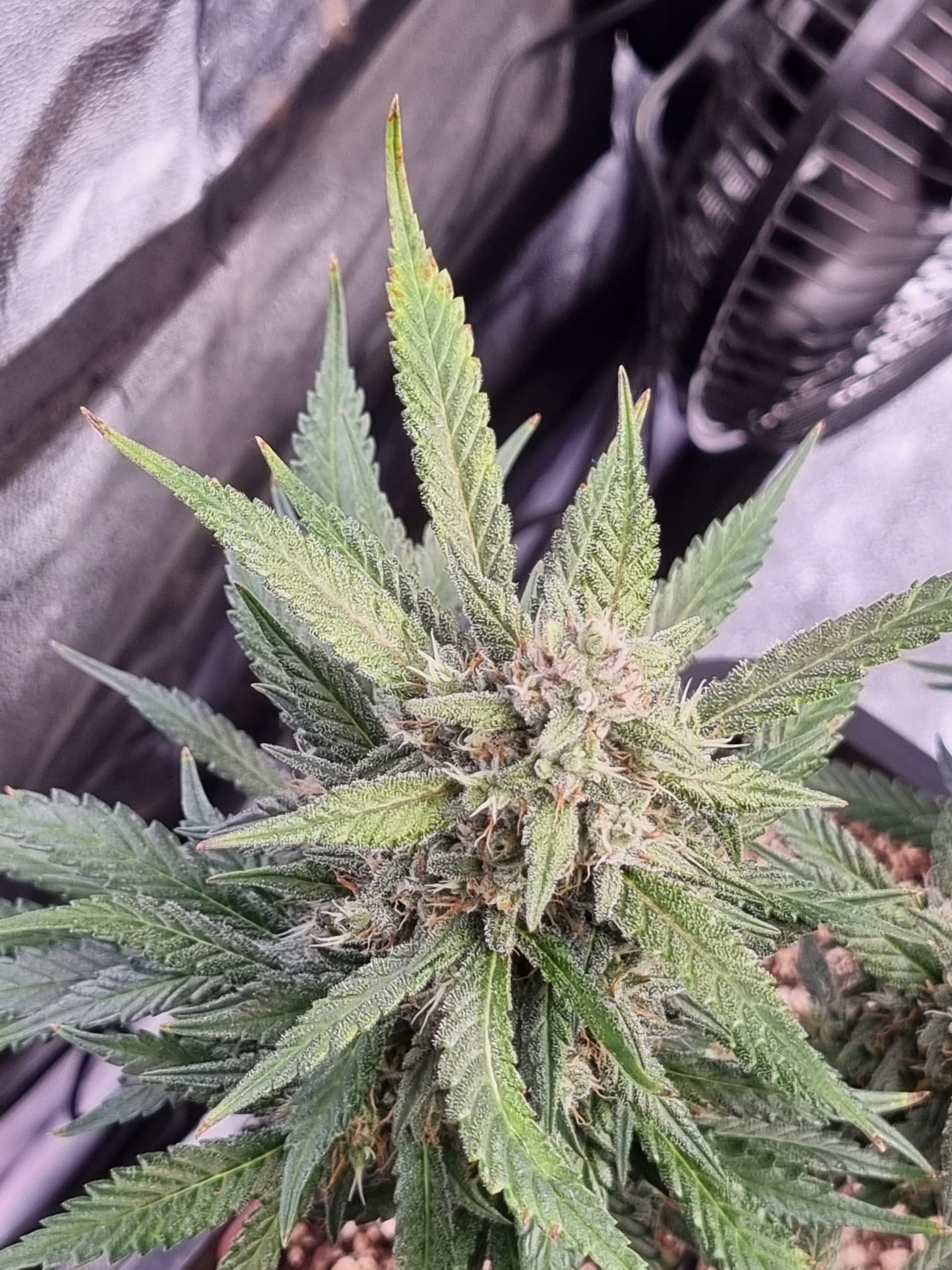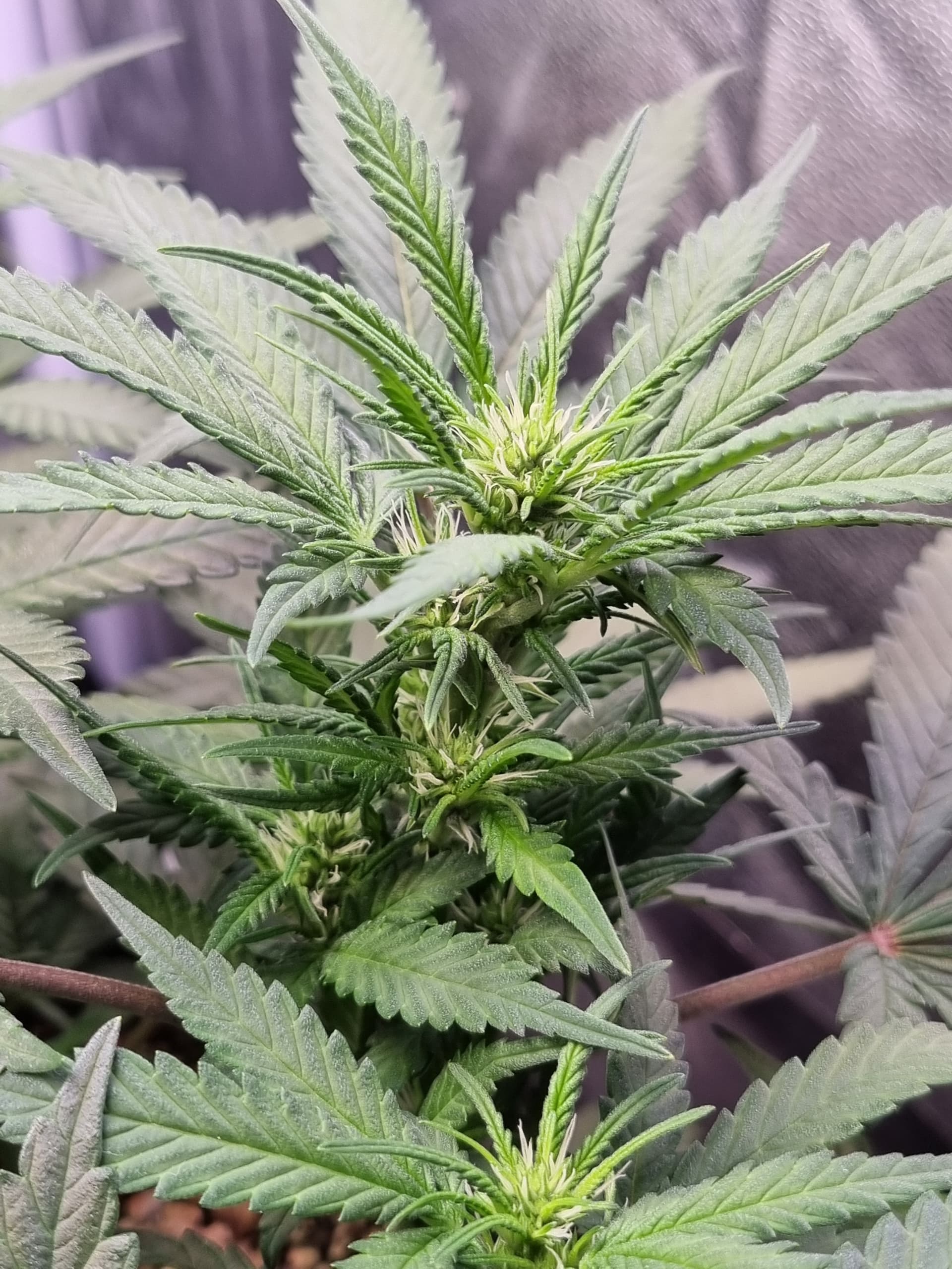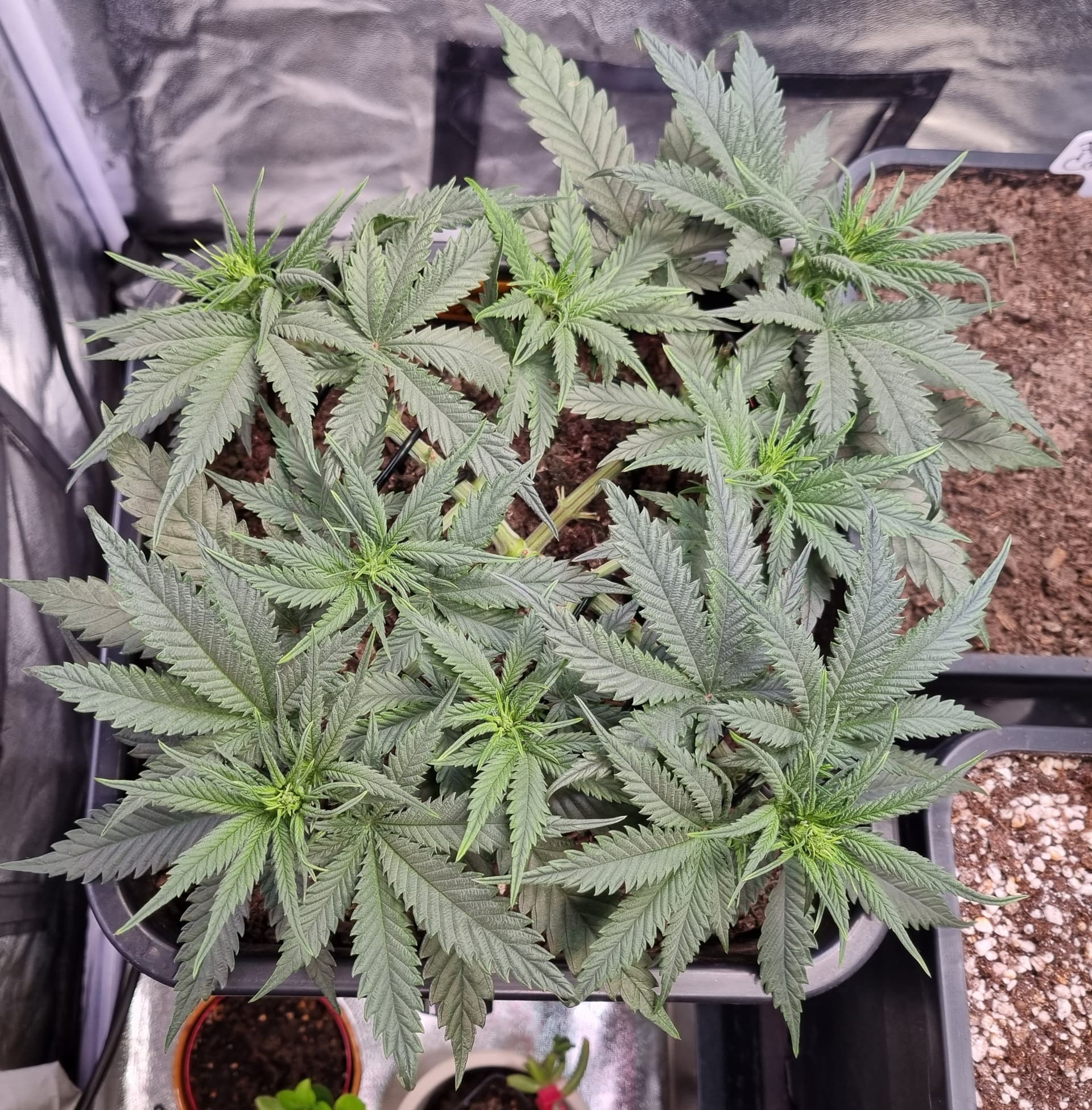 Tag 32, abgesehen vom sehr gemächlichen Wuchs melden sich Adlerkrallen oben rechts in der Ecke, scheinbar überdüngt: